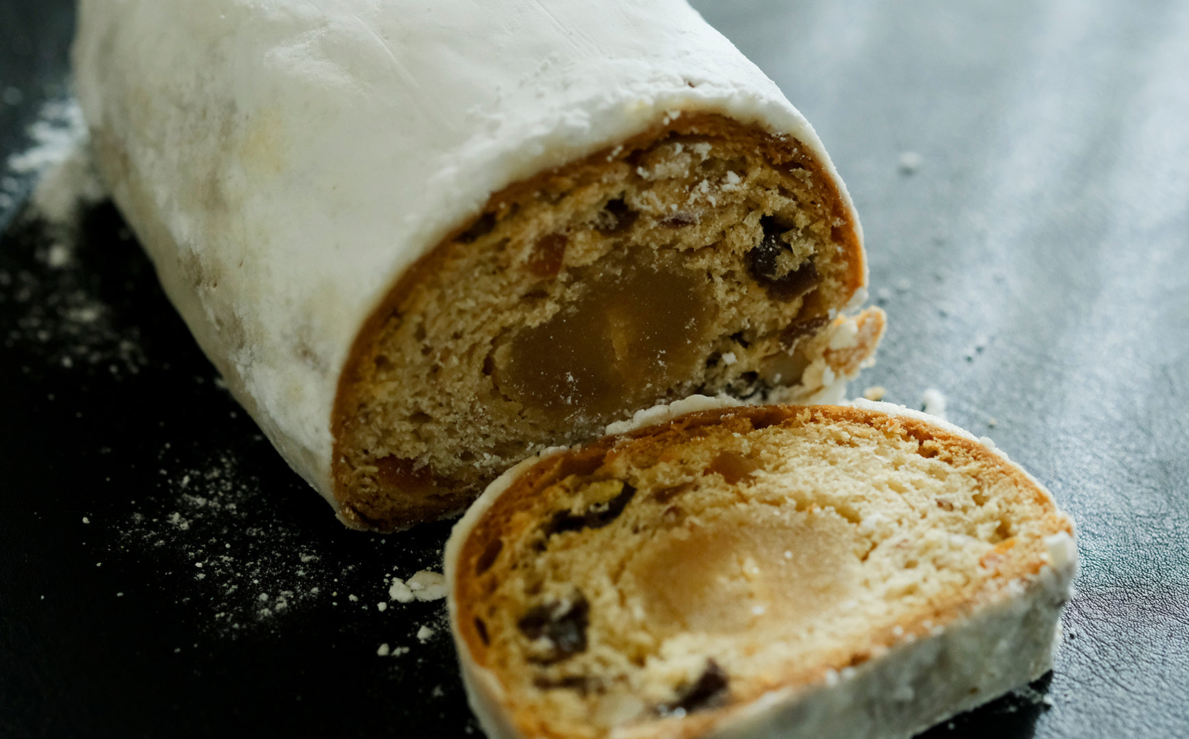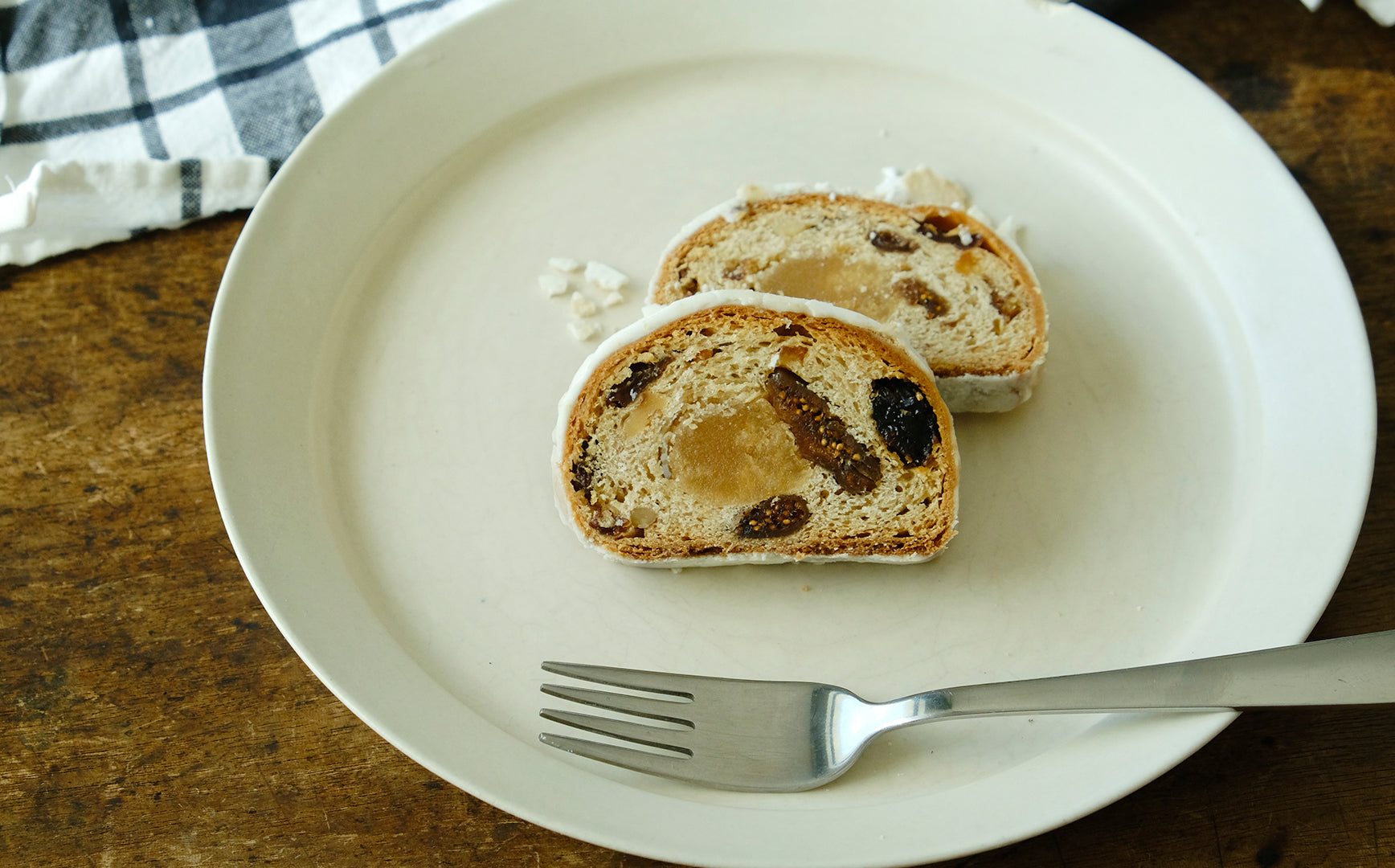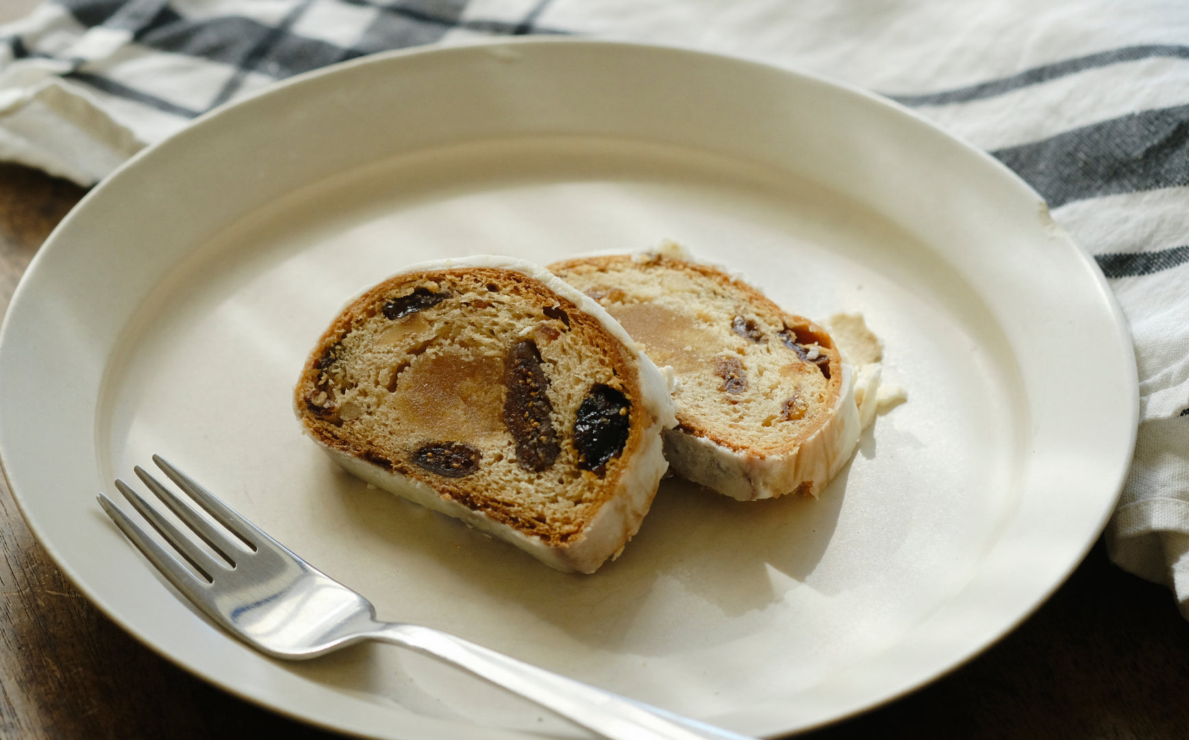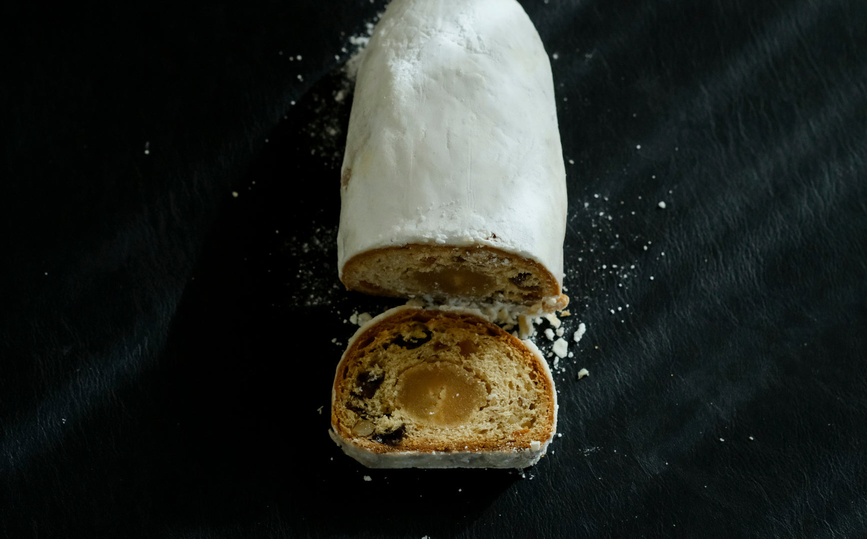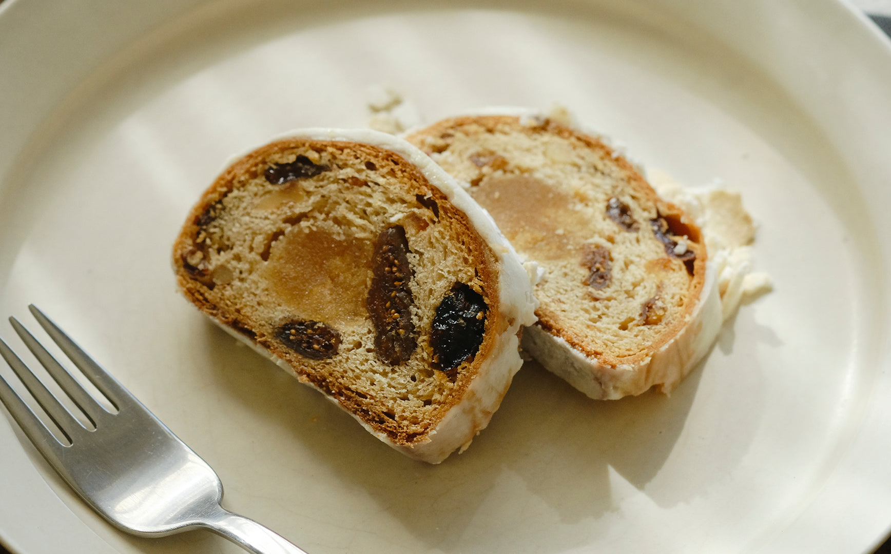 シュトレンはドイツ発祥のクリスマスのお菓子。お酒に漬け込んだドライフルーツとマジパンを混ぜ込んでじっくり焼いた発酵菓子です。