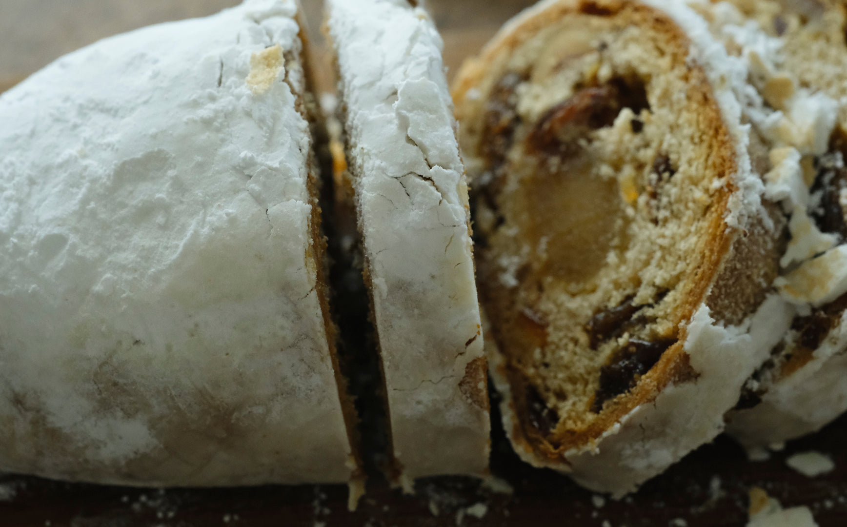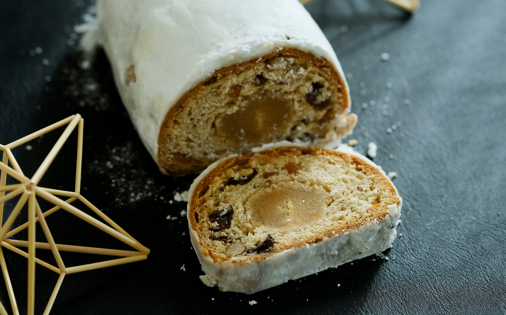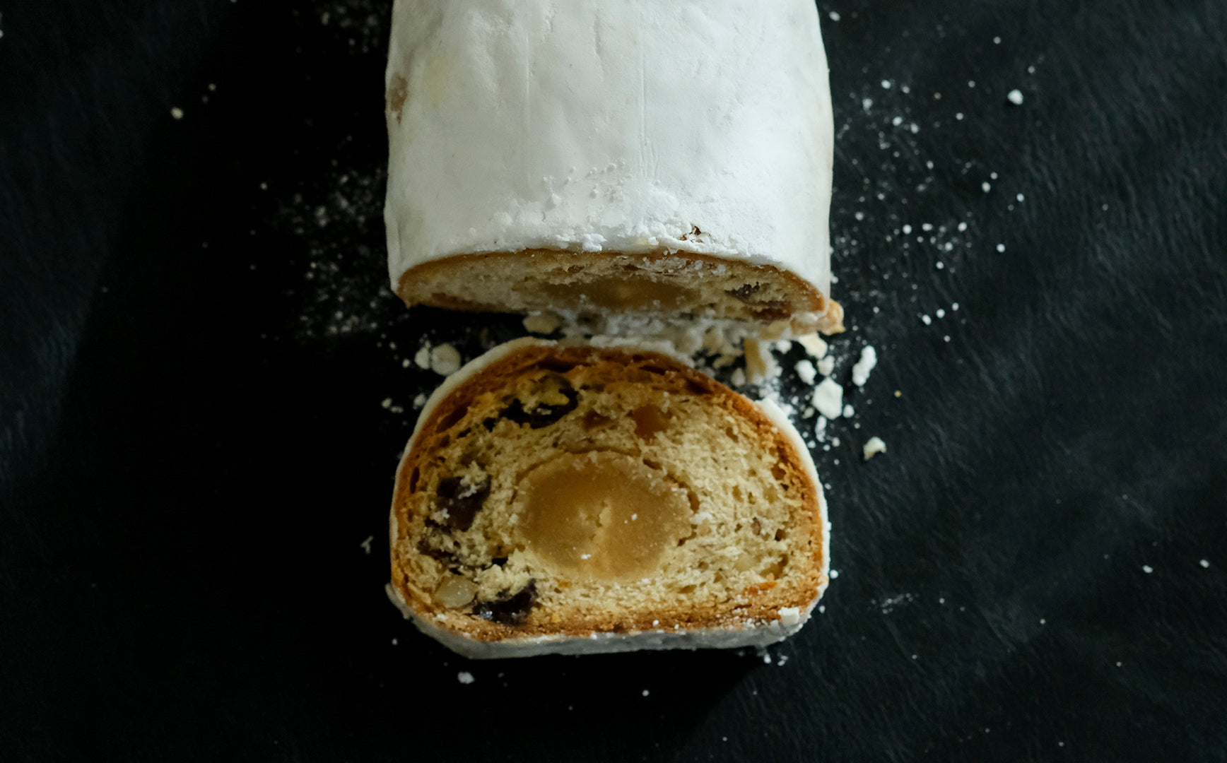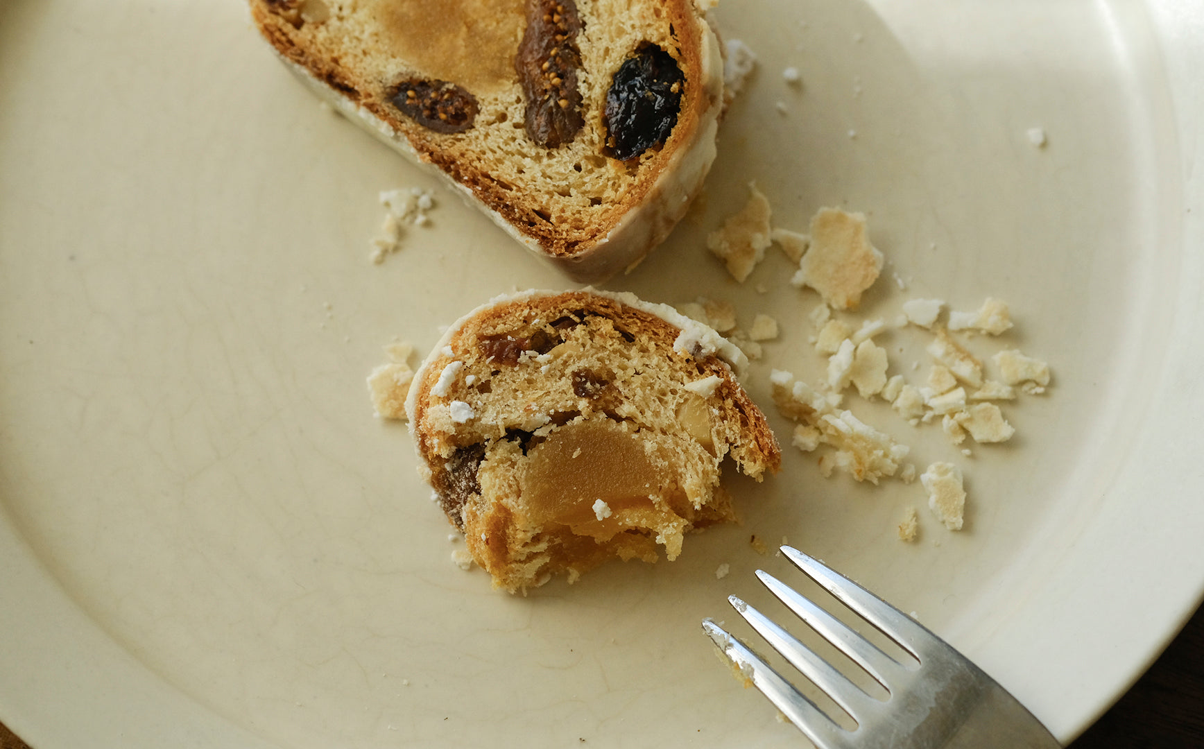 シュトレンはドイツ発祥のクリスマスのお菓子。お酒に漬け込んだドライフルーツとマジパンを混ぜ込んでじっくり焼いた発酵菓子です。