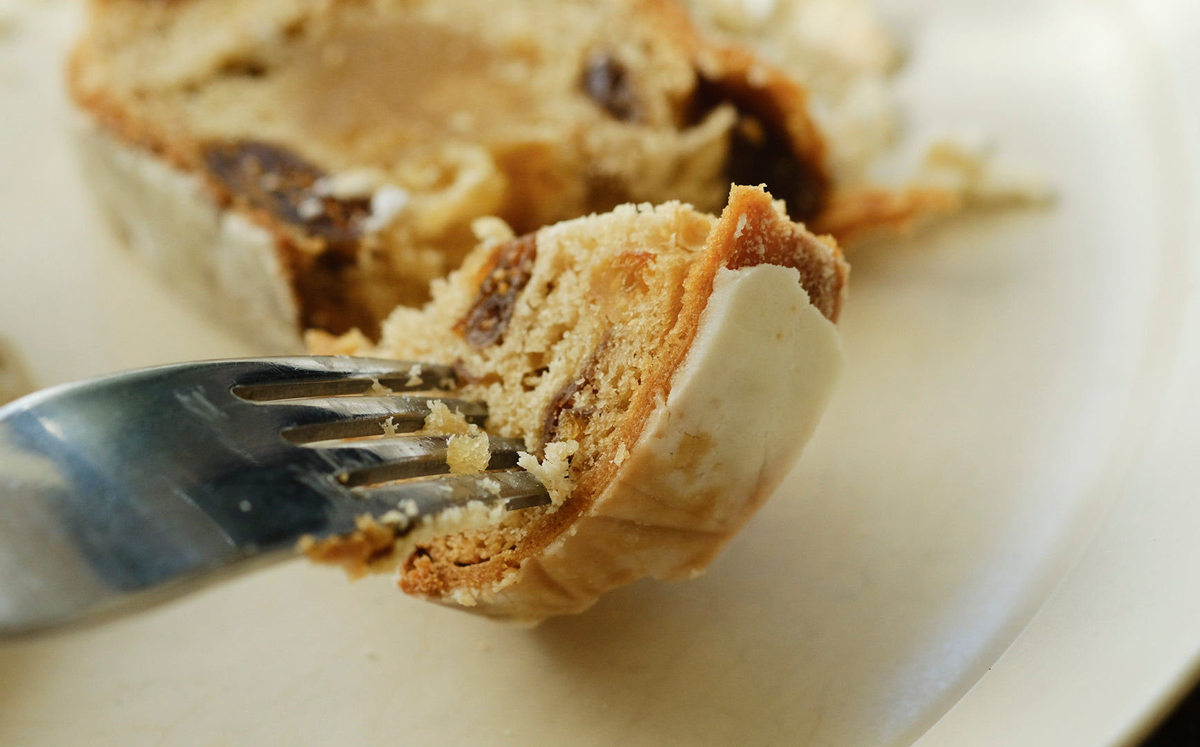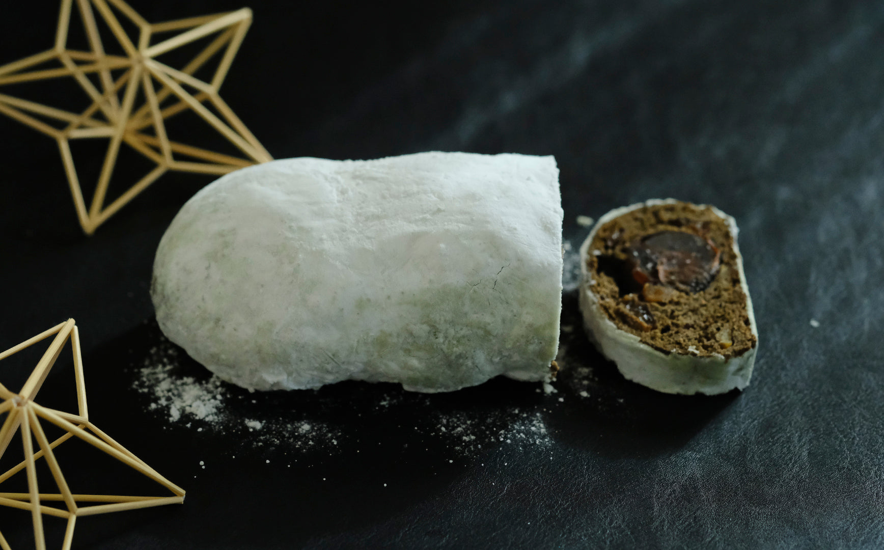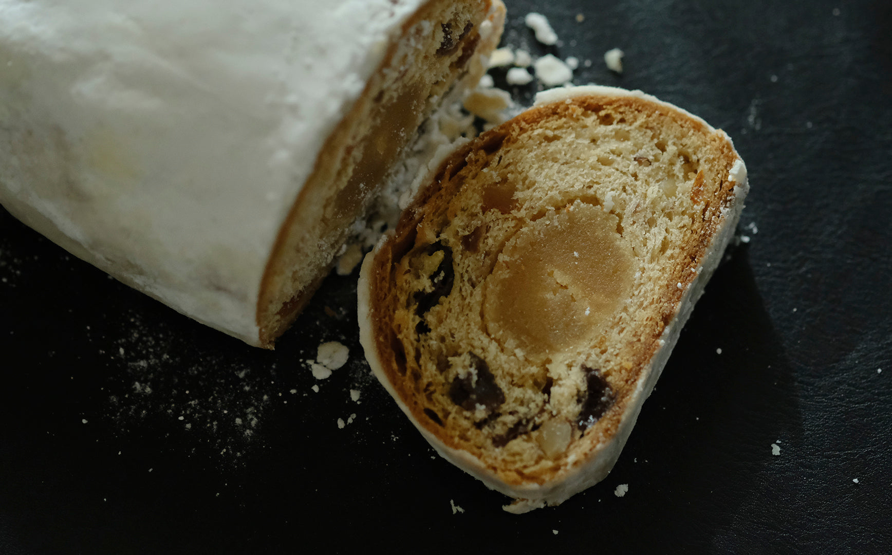 洋酒に付け込んだフルーツやナッツ、ローマジパンをシュトレンの本場ドイツの伝統的な規定量通りに配合しました。発酵バターとドライフルーツがしっとり染み込んだコクのある味わいです。
