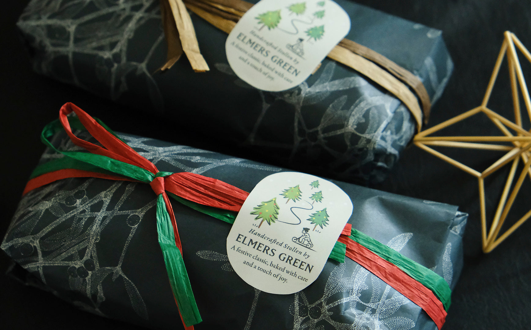 シュトレンは、クリスマス限定のヤドリギ柄の包装紙でラッピングしてお届けします。ご自宅用はもちろん贈り物にもどうぞ。