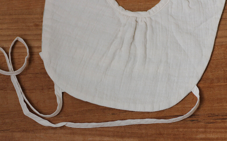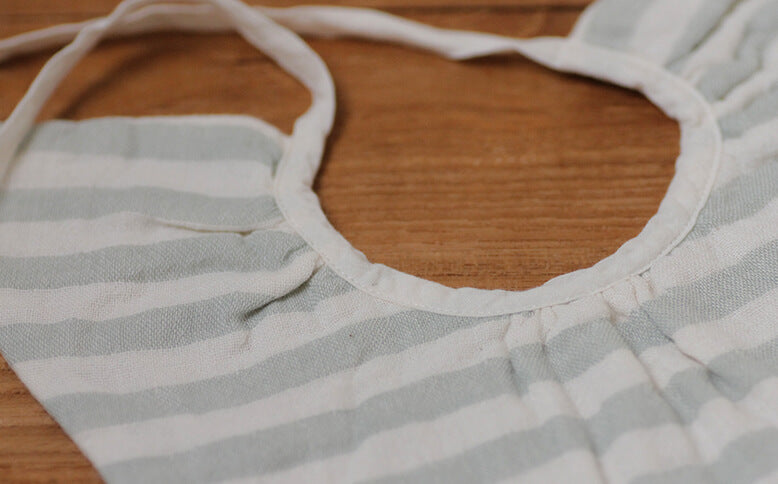 ▲生成色の紐で首と胴回りを結ぶラウンド型のスタイ、フレンチスリーブのように肩を覆ってくれます(左:ミント、右:ブラウン)