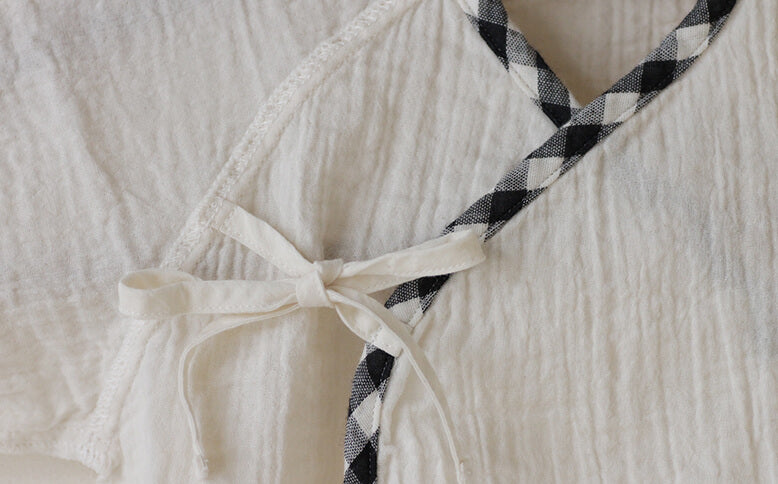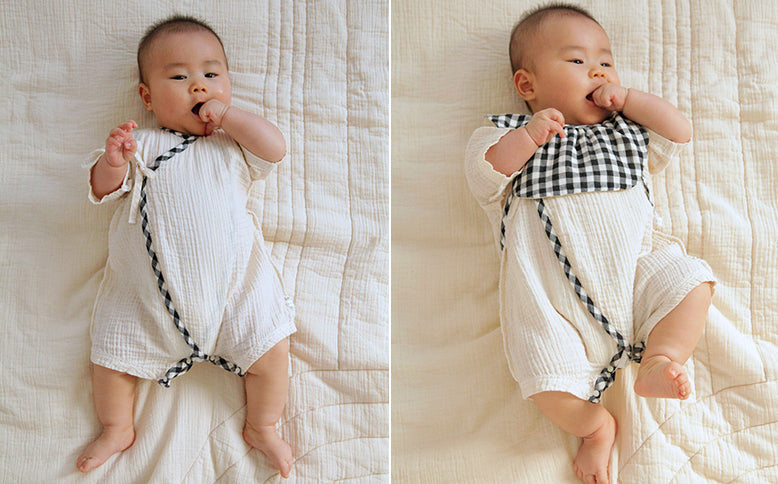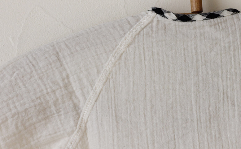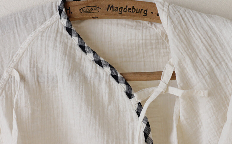 目の細かい生成色の二重ガーゼを縁取るのは、黒×生成色のギンガムチェック。赤ちゃんのものでも甘すぎず、男の子にも女の子にも合いますよ。