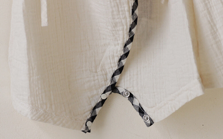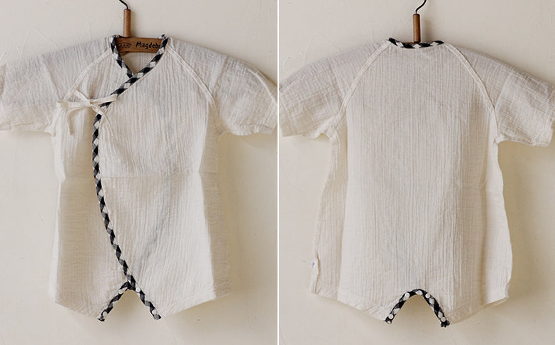 ▲ギンガムの縁取りが可愛らしい肌着。近頃の小さめのおむつに合わせてお尻部分はすっきりと