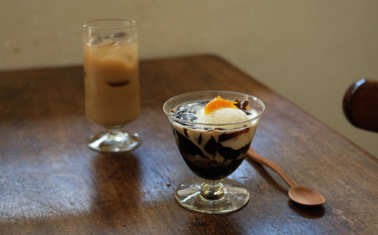 オクシモロンのコーヒーゼリーにミルクを注いで、アイスクリームとフラベドのジャムを添えて。