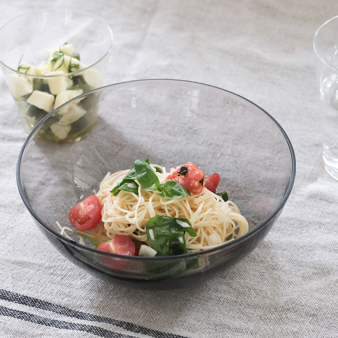 濃いグレーを纏ったcharcoalは深みのある色。食卓を引き締めてくれるようなシックな雰囲気で、ガラスながら通年使いたくなる存在です。口元に黒いマットガラスを施しています。