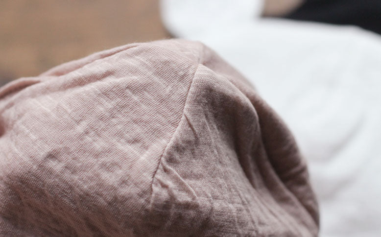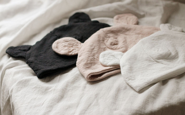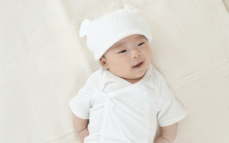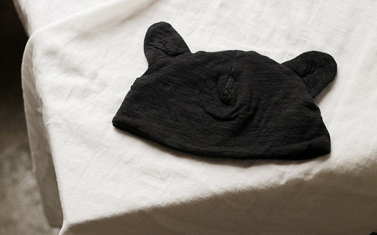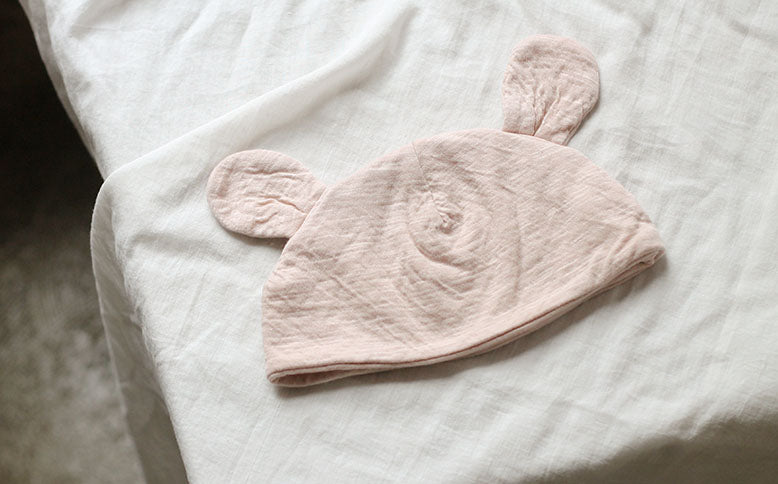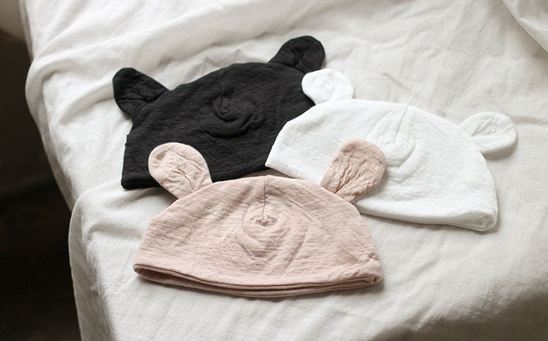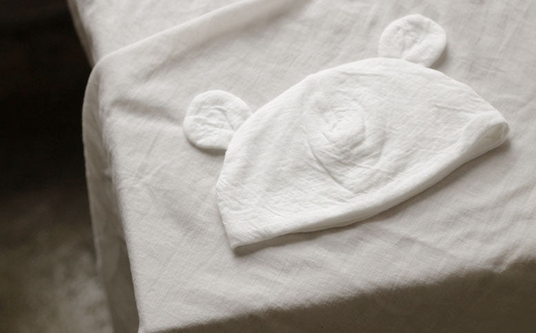 生まれたての赤ちゃんが身につける肌着は、素材を大切に選んであげたいもの。なめらか天竺を使い、赤ちゃんにやさしい帽子をつくりました。