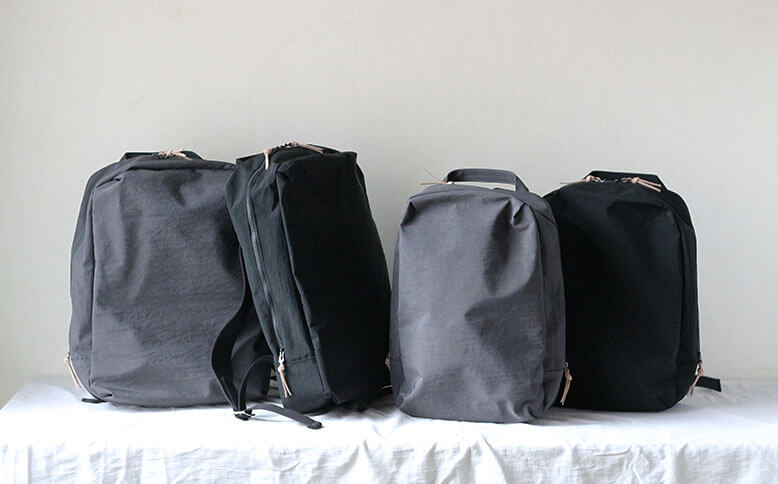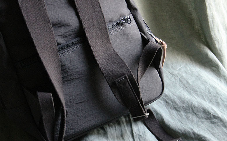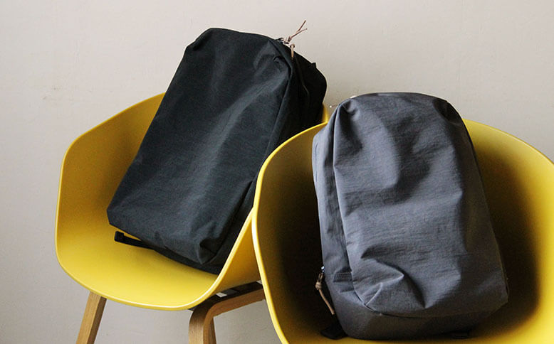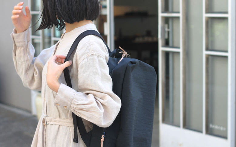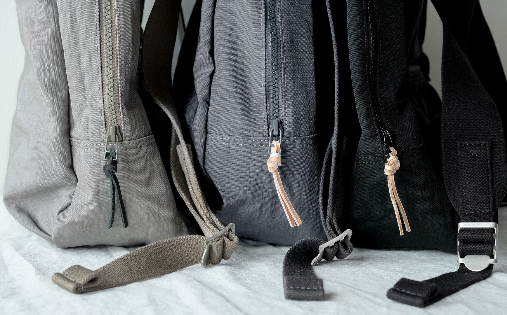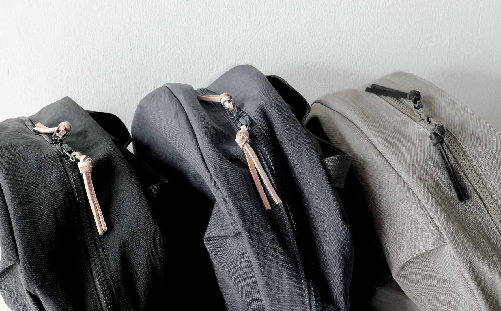 デザインと機能の両方が叶うリュック。気が付いたらいつも使っています。天然素材のような風合いをもったナイロン生地は福井で職人の手によってつくられています。