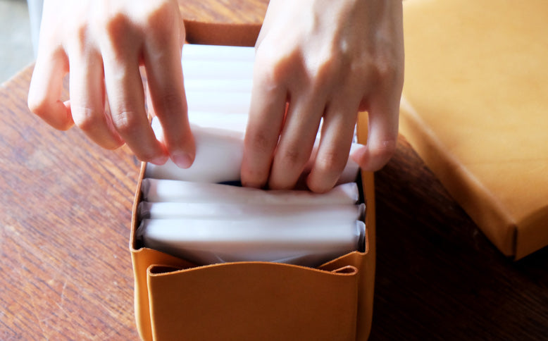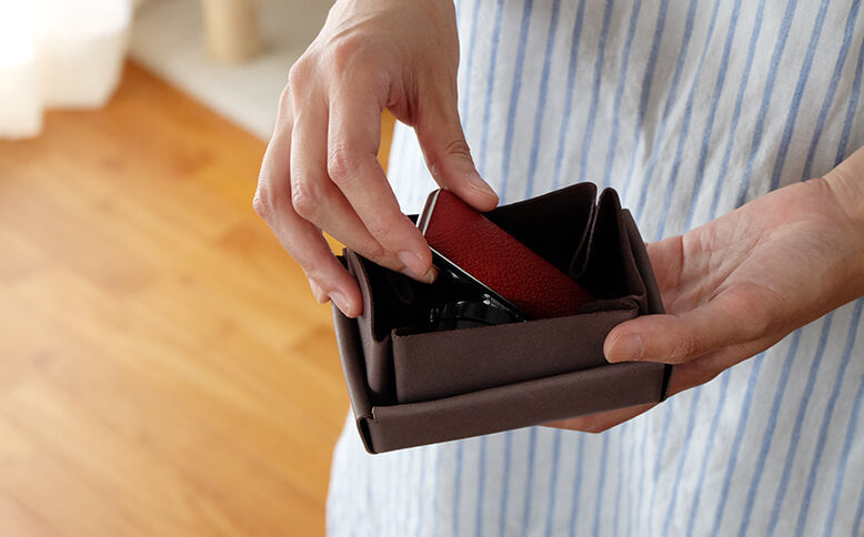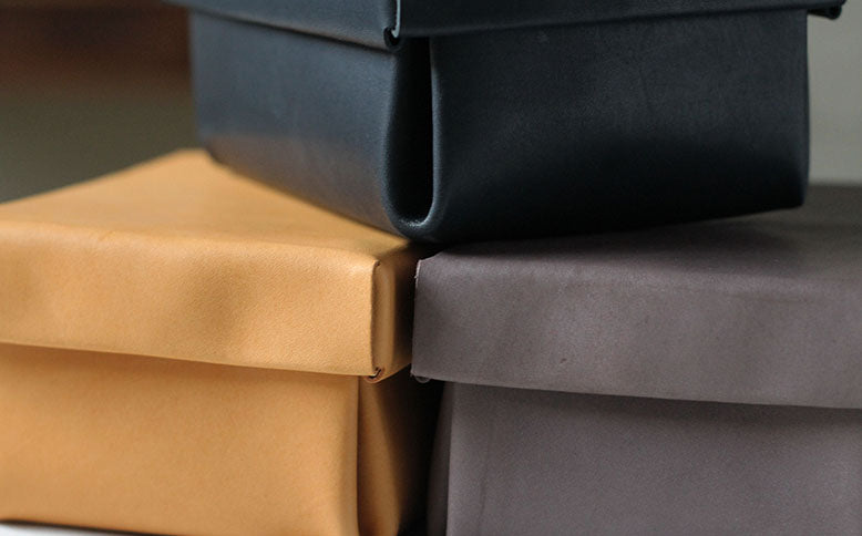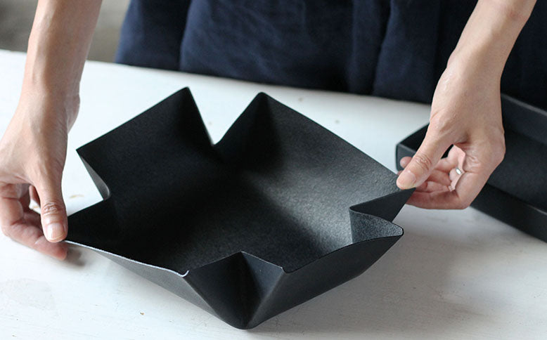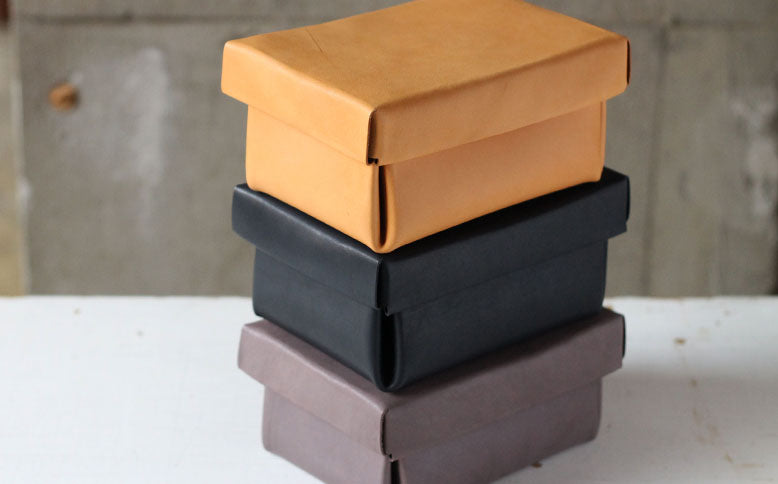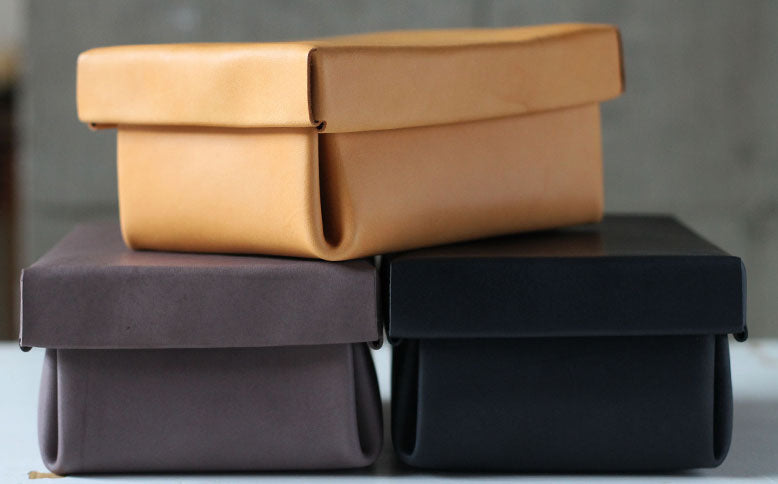 本体はこんな風に広げられるのですが、蓋をすることでちゃんと箱の姿になります。そのユニークなデザインは、柔軟性のあるヌメ革の特性に着目し生まれたものです。