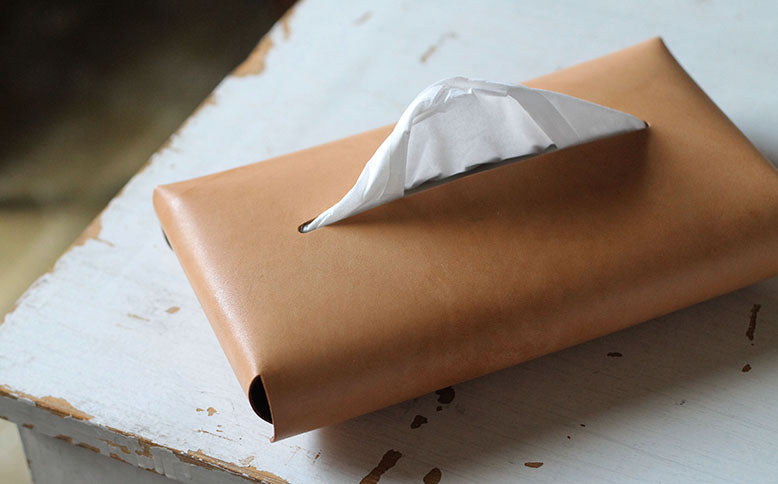 革製のティッシュケースといえば、底面のないボックス型でカポっとかぶせるイメージだったのですが、nysはそれとは違います。