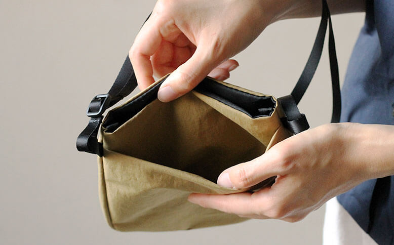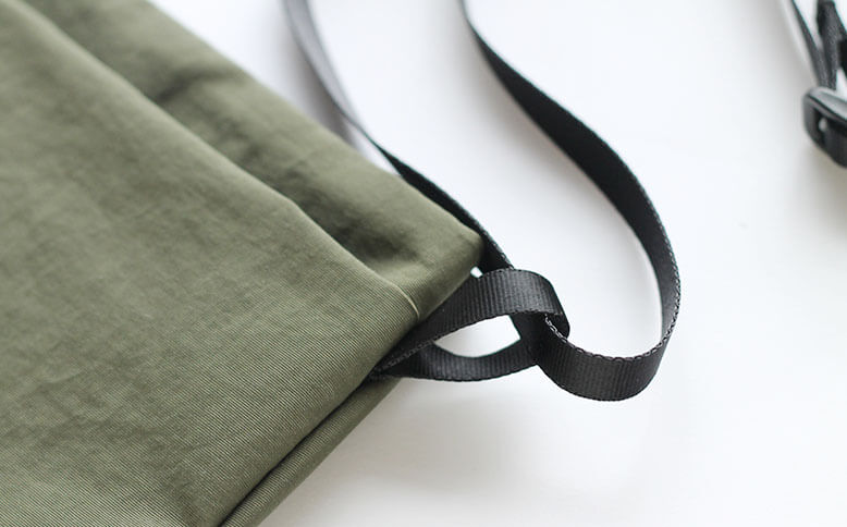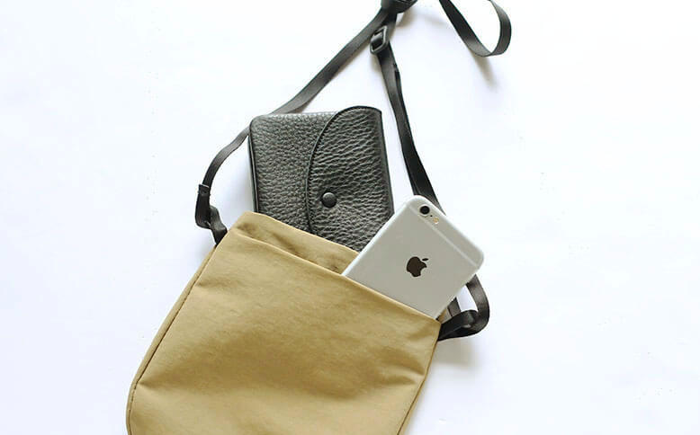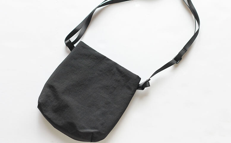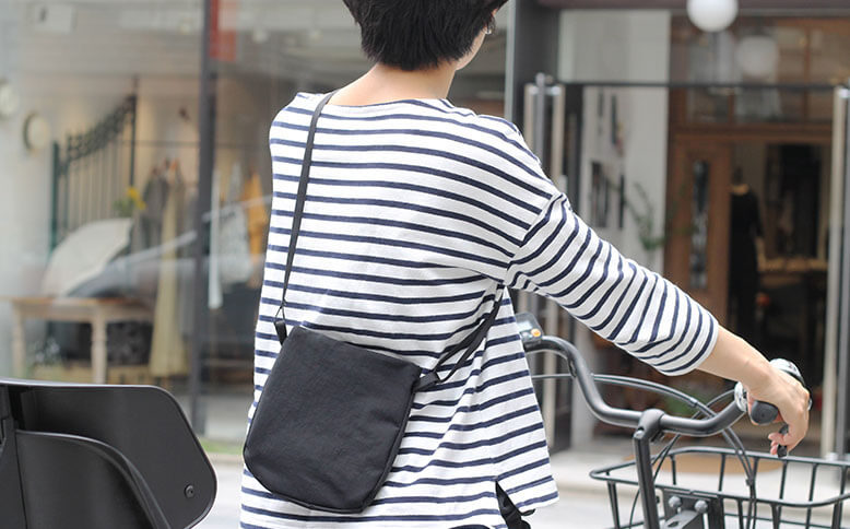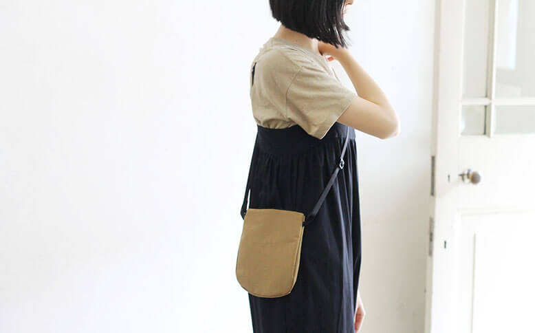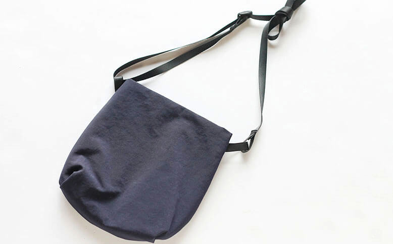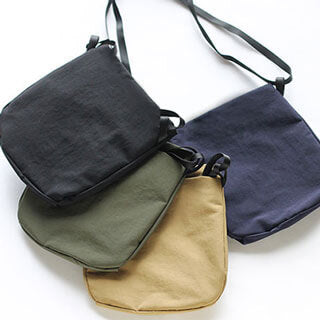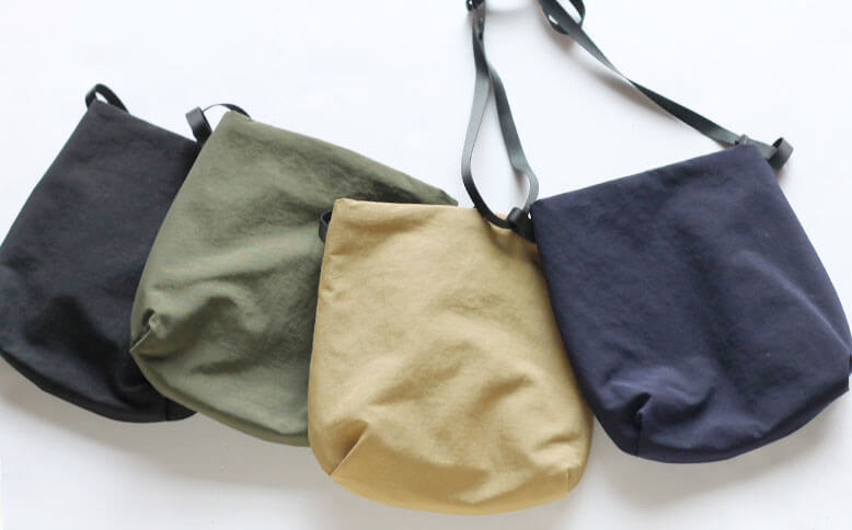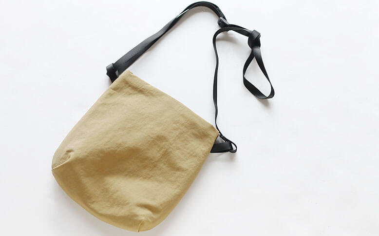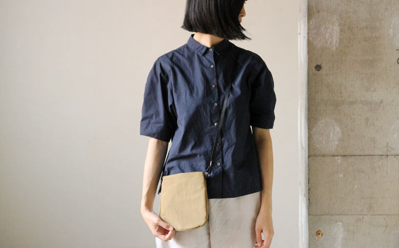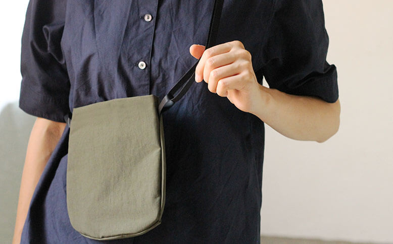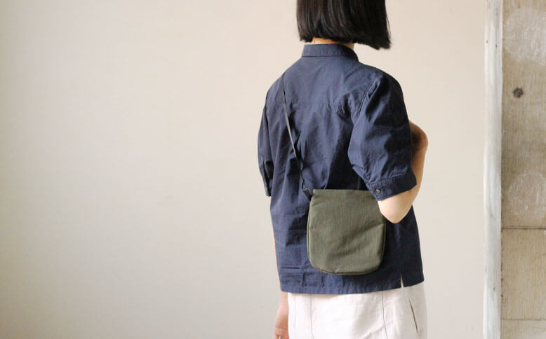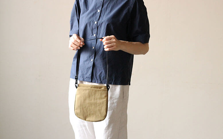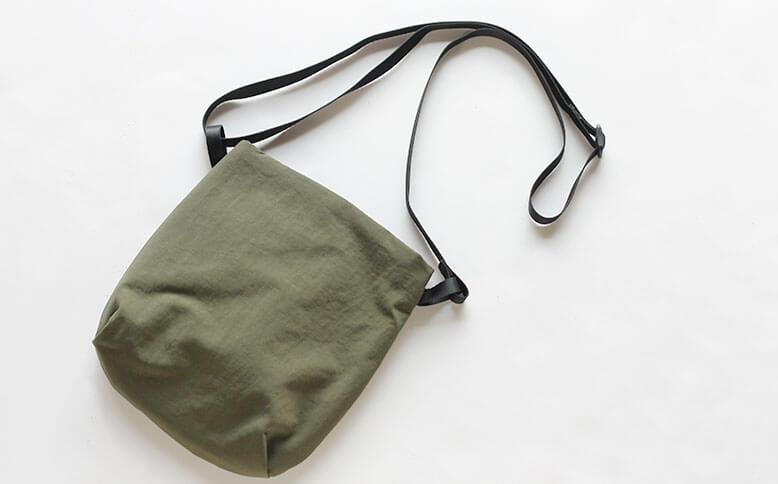 最低限の物だけを入れて出かけたい、そんな日におすすめの、コンパクトなショルダーポーチ。使用したのは、撥水加工された石川県産の軽量なナイロン生地。独特のシワ感が特徴の、スポーティ過ぎない、テカリの少ないナチュラルな風合いのショルダーポーチは、普段の街歩きにも抵抗なく使えます。