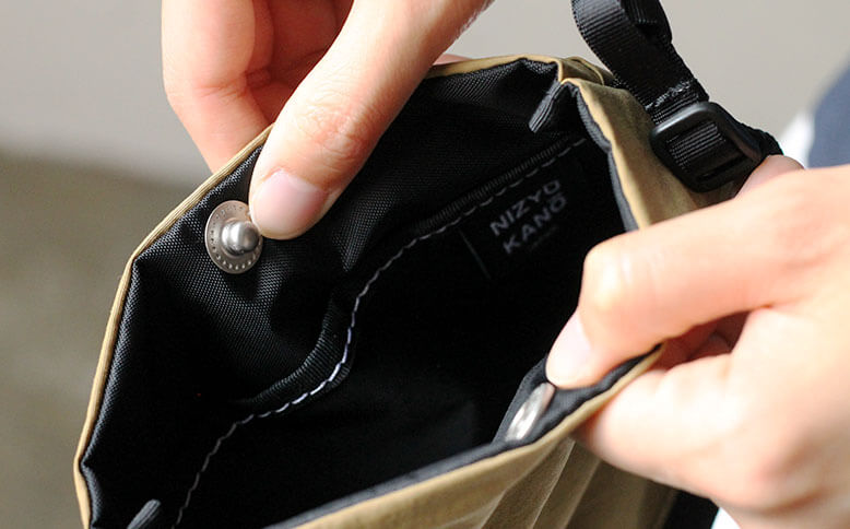 想像以上にしっかりとした裏地は、中に入れた荷物の形が表に響きにくく、ポーチの形も崩れにくいようつくられています。内側にボタンがあるので、中に入れた物が飛び出る心配もありません。