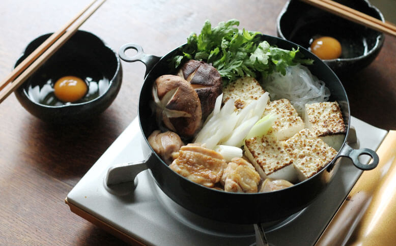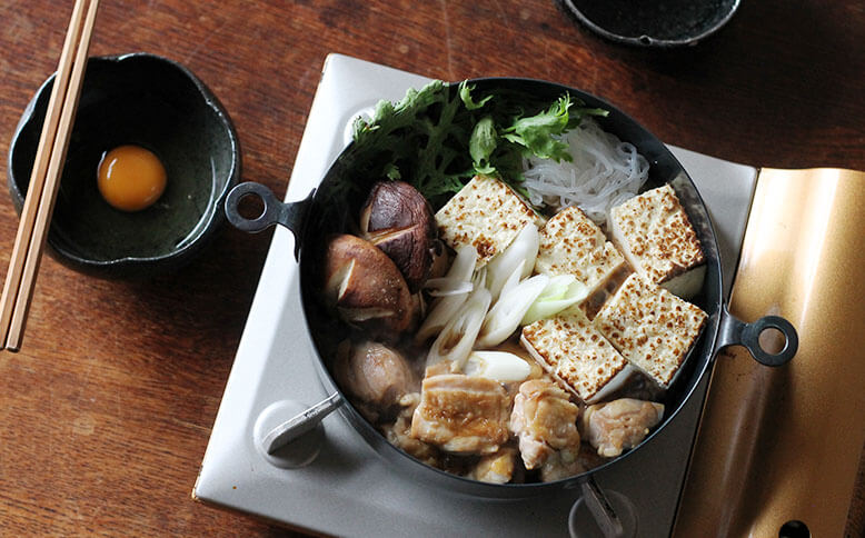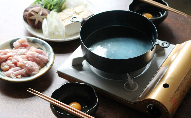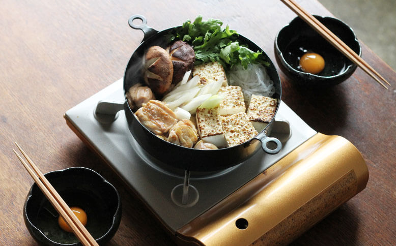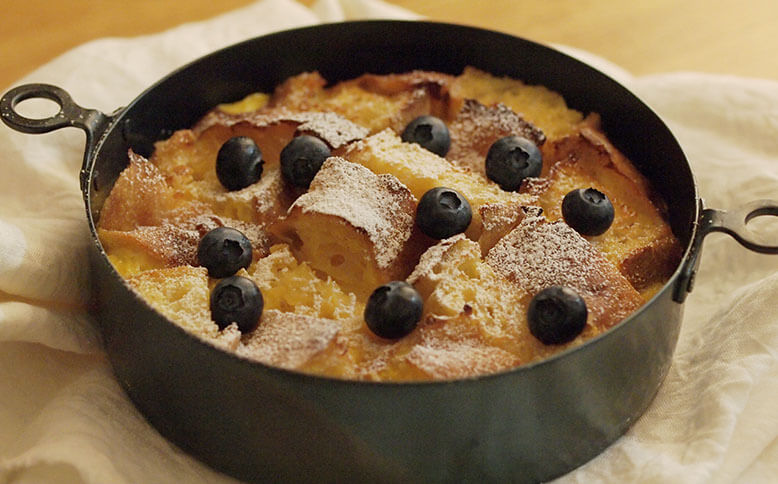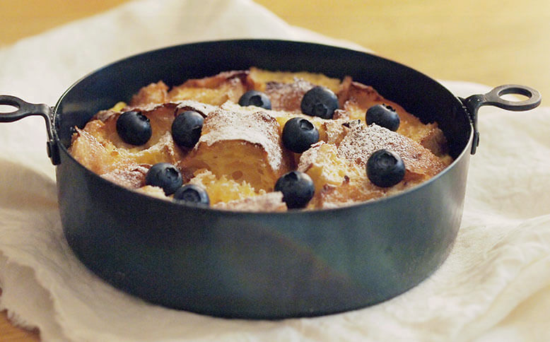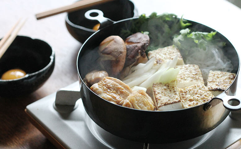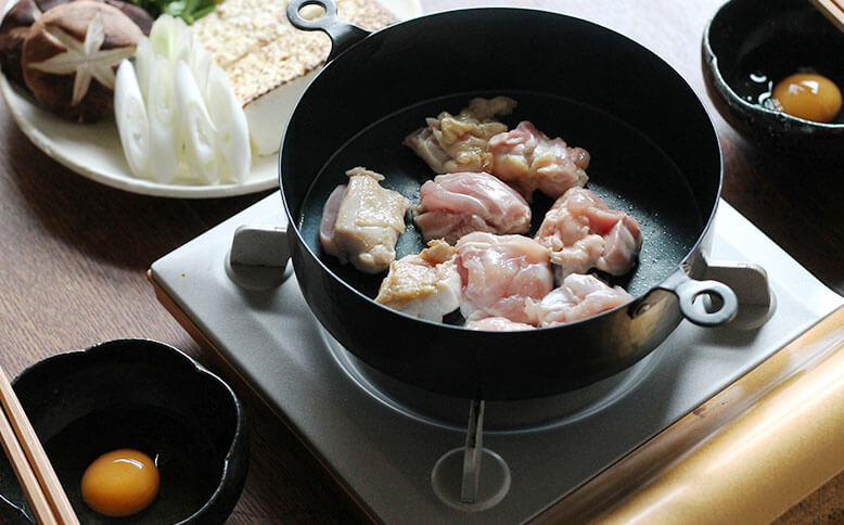 真ん中の、φ200サイズで鶏すき鍋を。この両手鍋はしっかりと深さがあり、関東風も関西風も楽しめます。▲鉄の鍋の熱伝導はすき焼きなどに適しているそうです▲鶏の表面をこんがり焼いて▲具をたっぷり入れても安心感のある深さ一番小さいφ160サイズの両手鍋ではパンプディングを。深さがあるので、オーブンを使用したお菓子やグリル料理に使いやすいサイズです。▲オーブンから焼きたてをそのままテーブルにφ240サイズは3人以上のお鍋にも対応できるたっぷりサイズ。具材たっぷりの韓国鍋にもおすすめです。