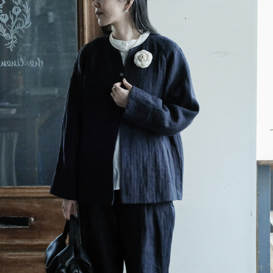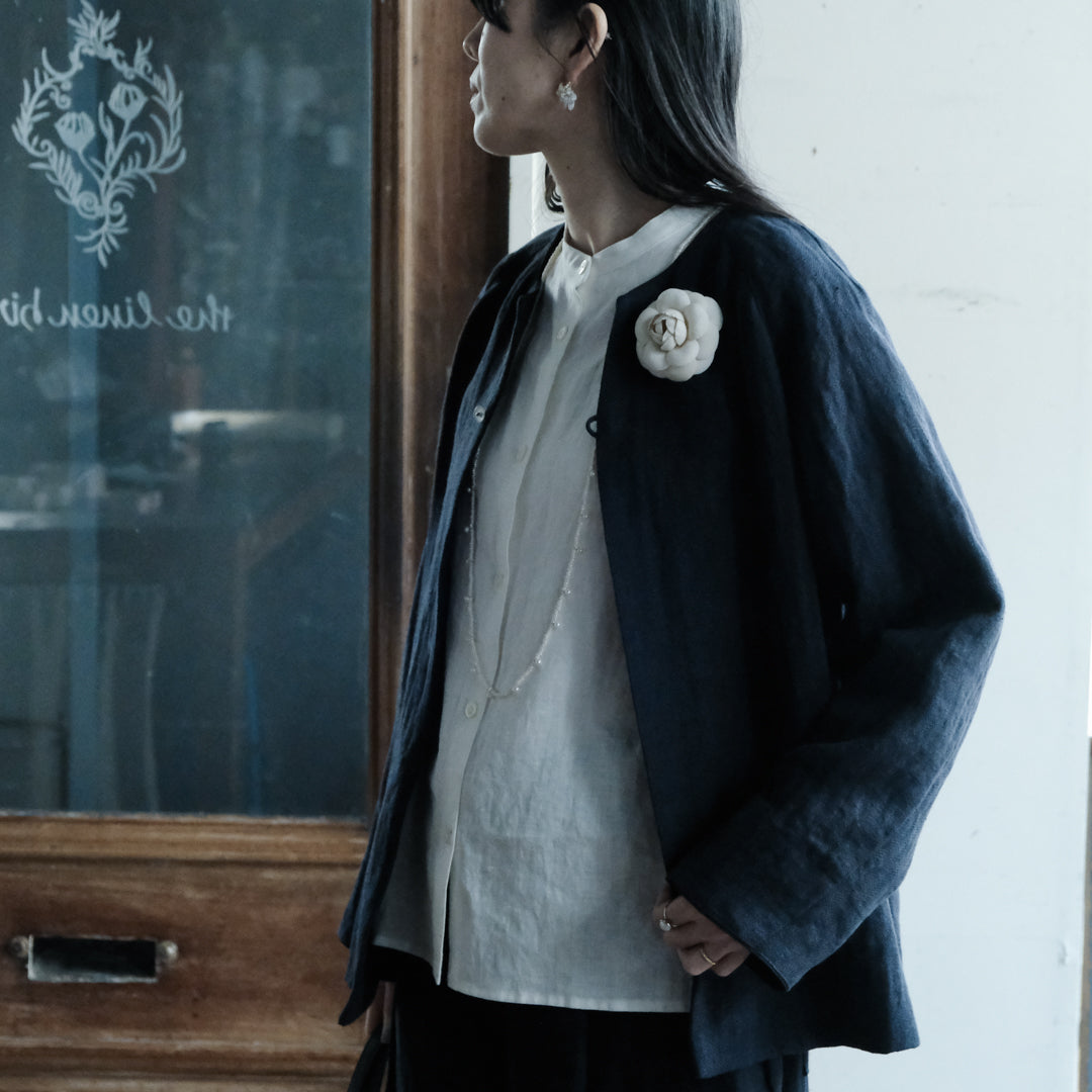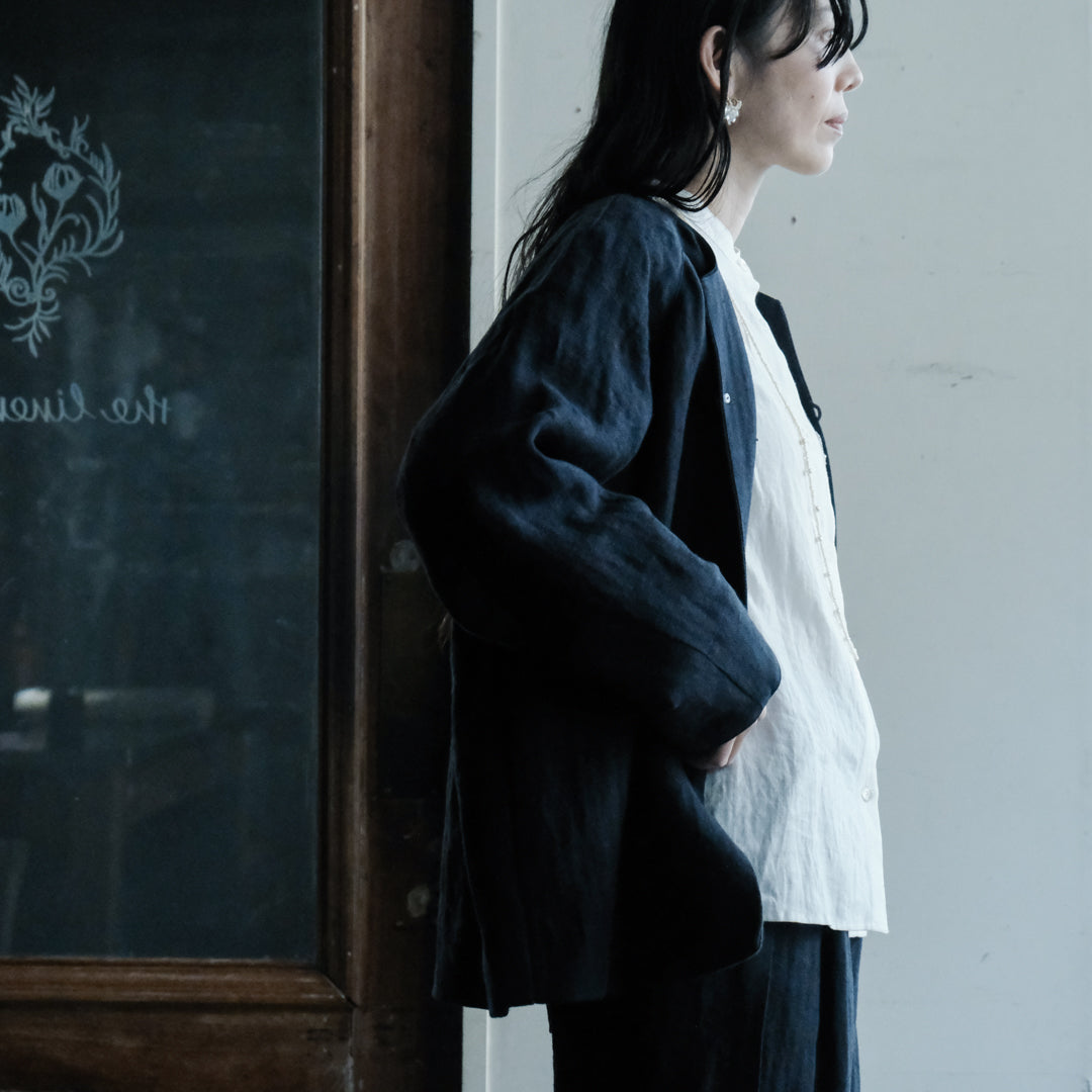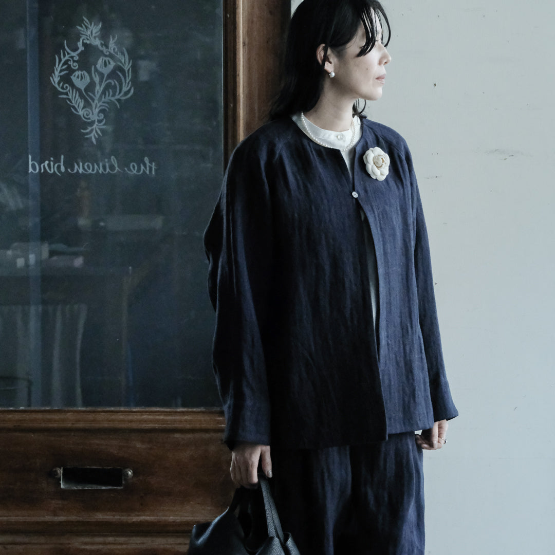 リトアニアリネンならではの無骨さや落ち感、着心地のよさを兼ね備えたジャケットは、使い込むほど身体によく馴染みます。