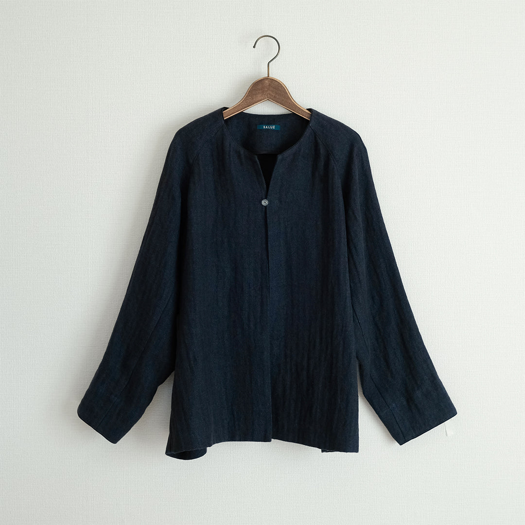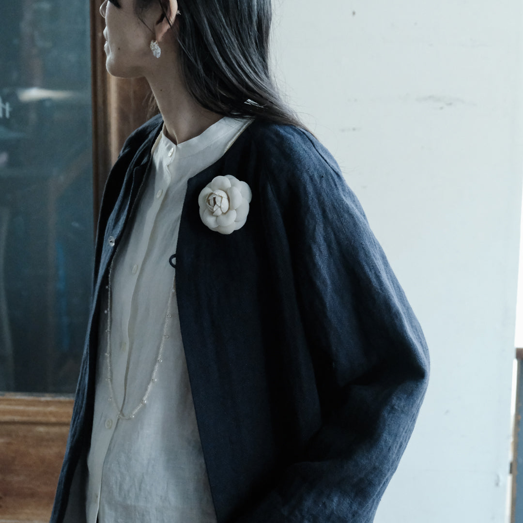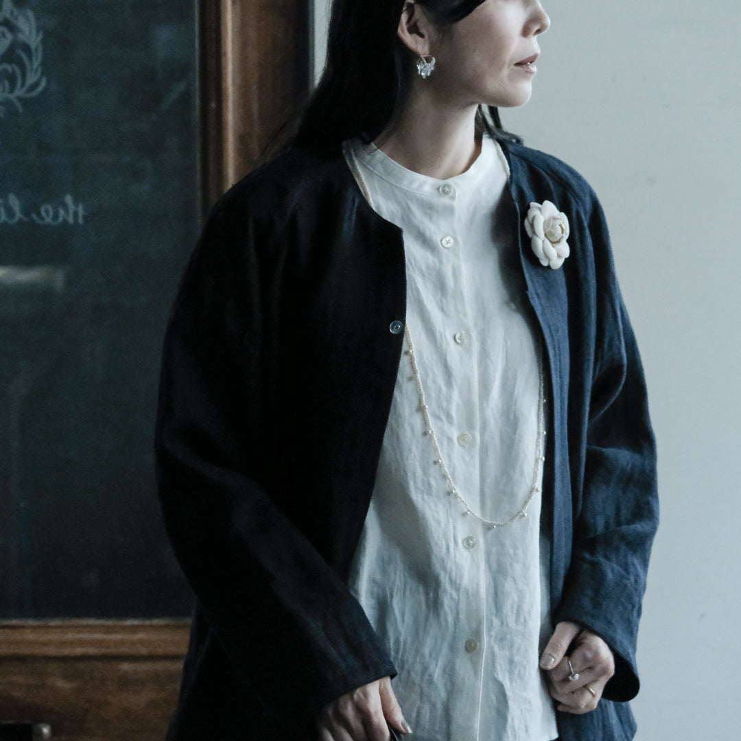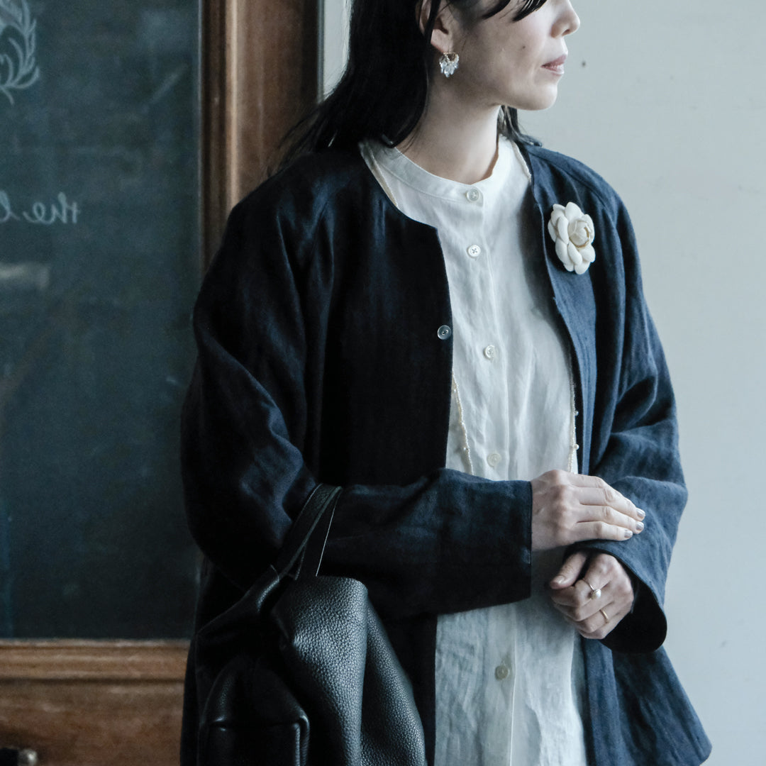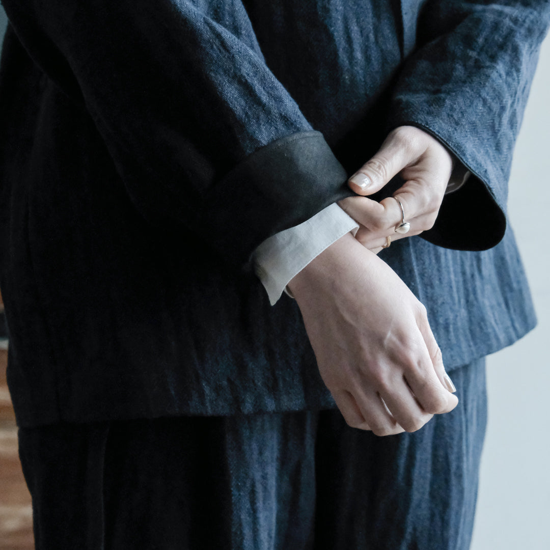 リトアニアリネンならではの無骨さや落ち感、着心地のよさを兼ね備えたジャケットは、使い込むほど身体によく馴染みます。