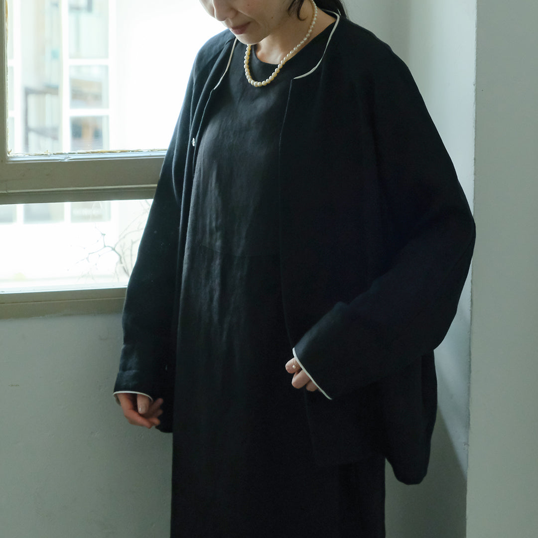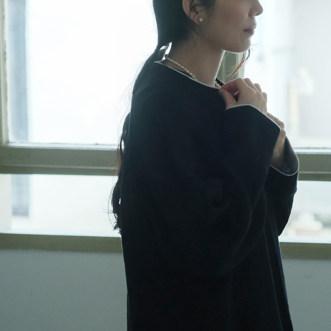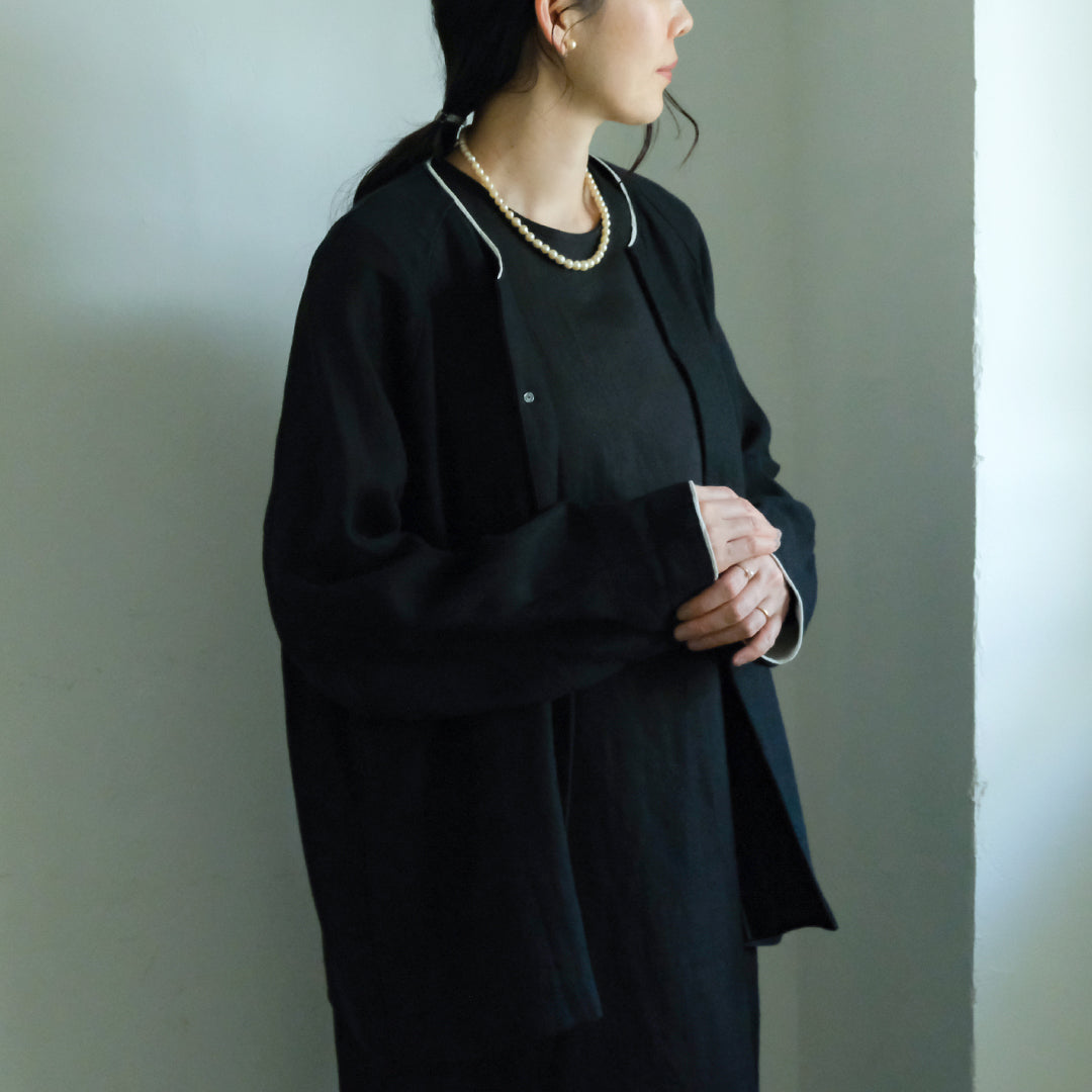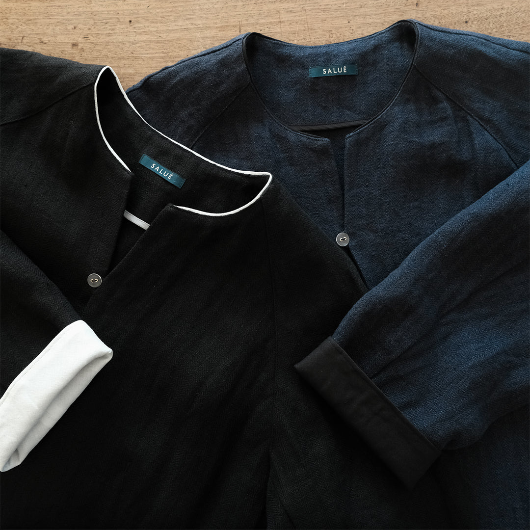 袖口と襟元にはそれぞれコットンリネン生地で縁取り、ブラックには白、ダークネイビーには黒が覗くようにデザインされています。
