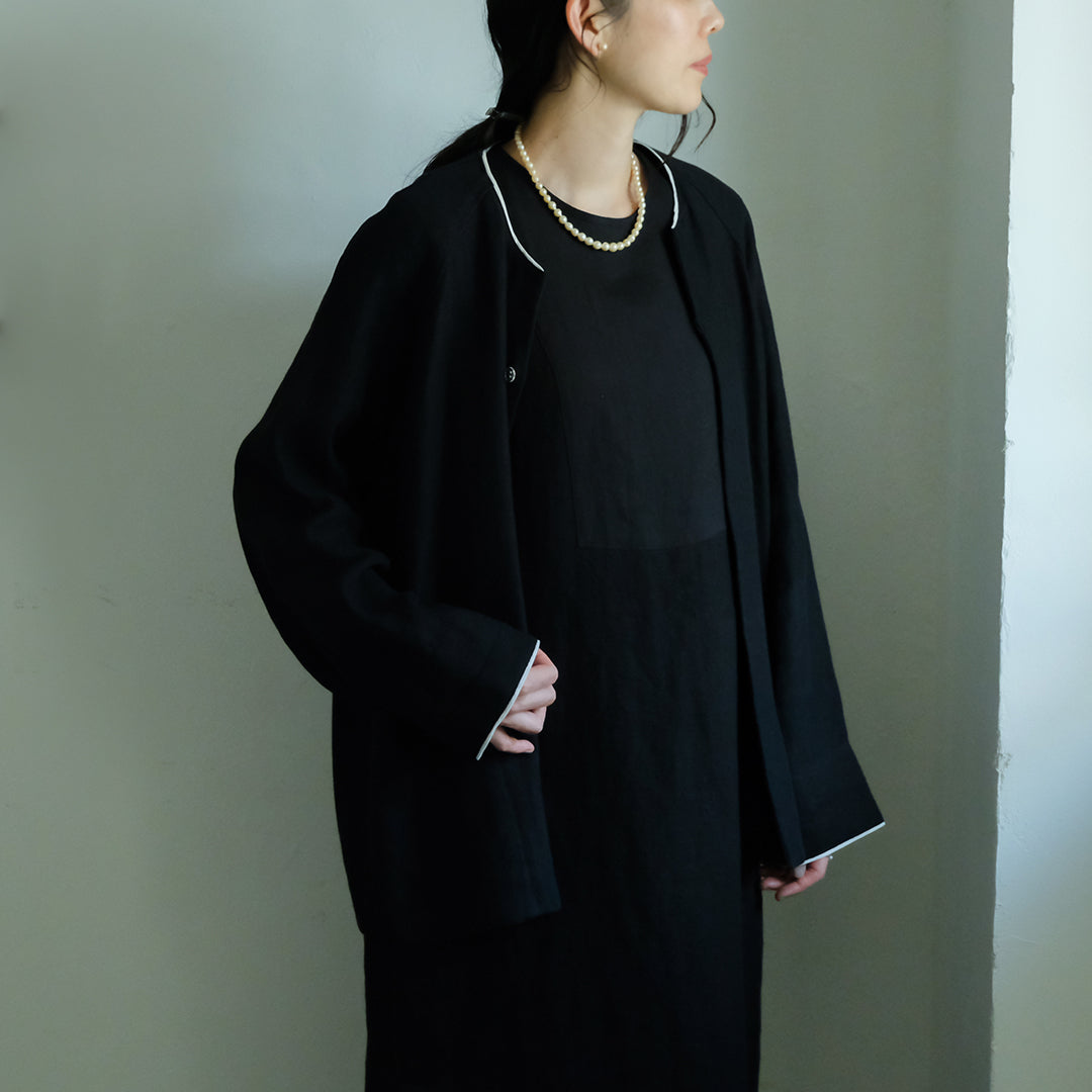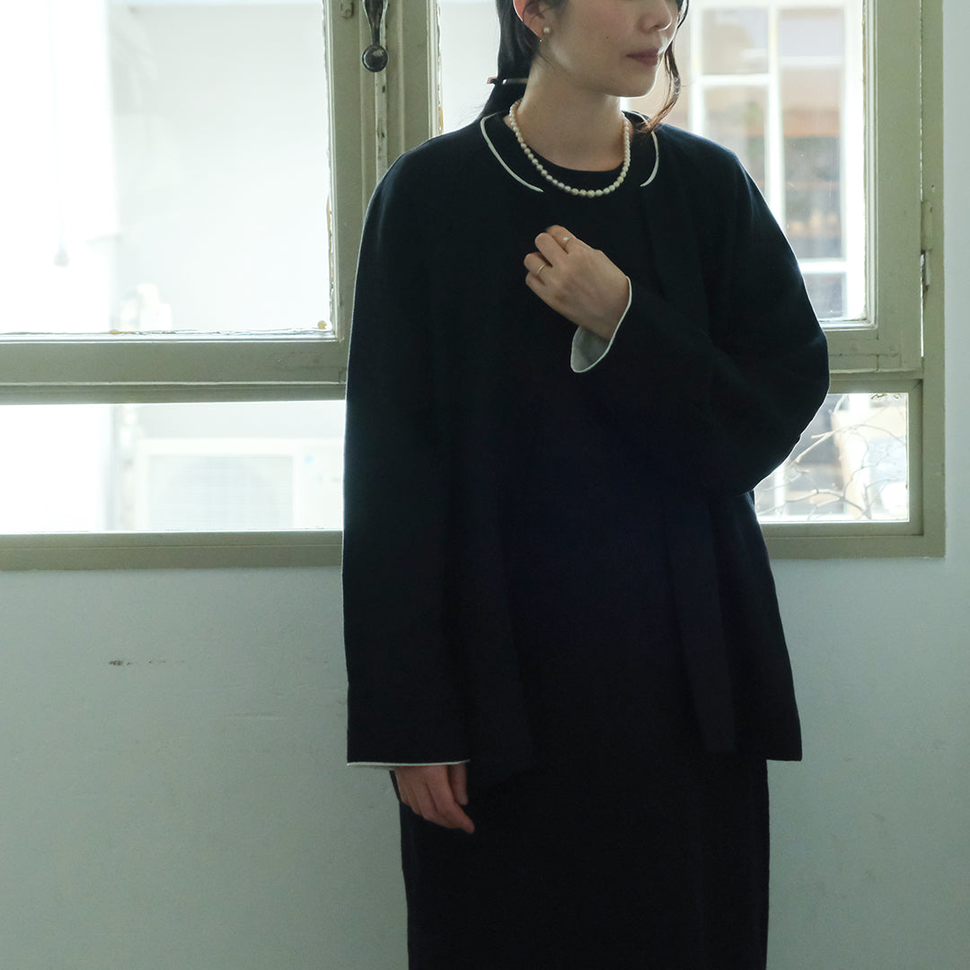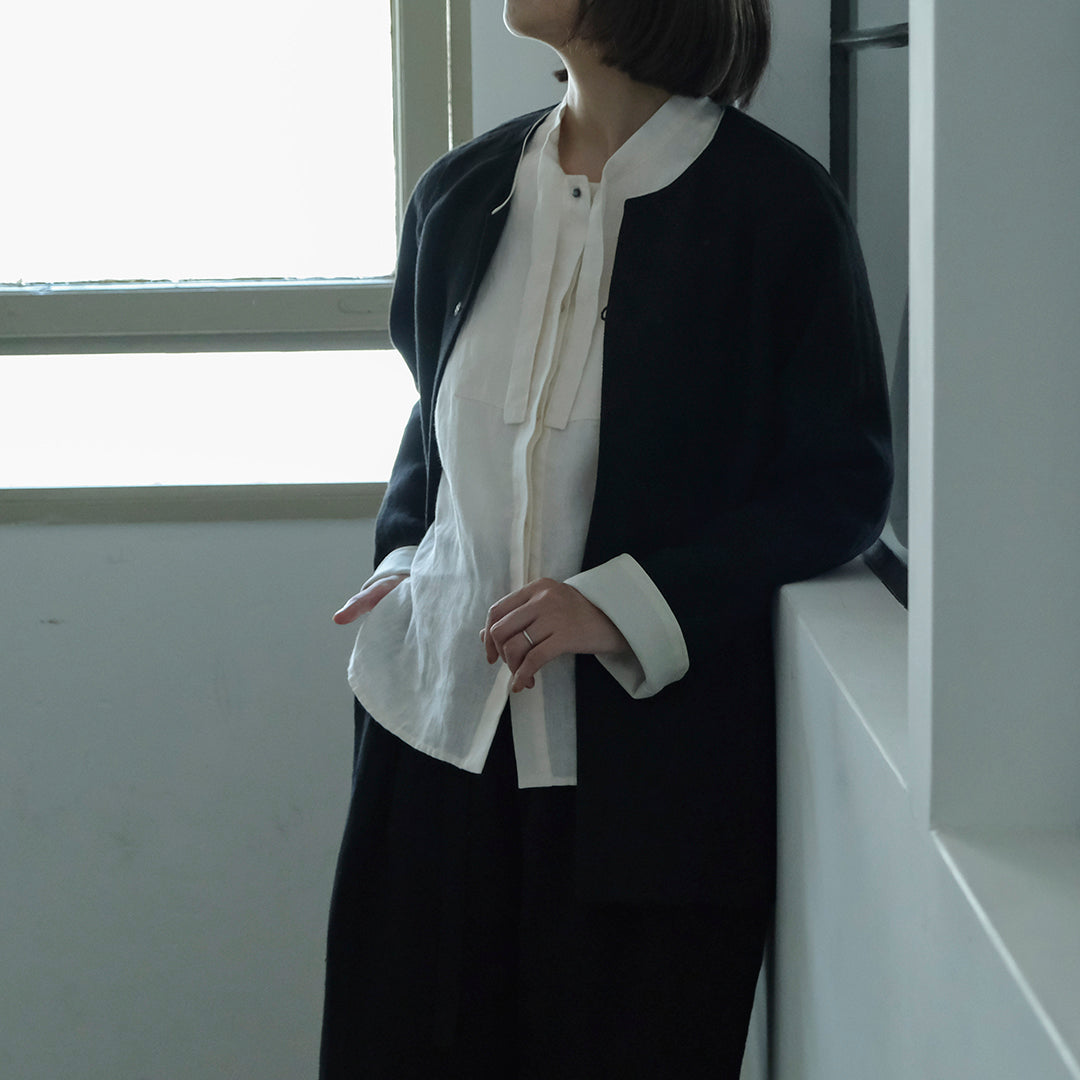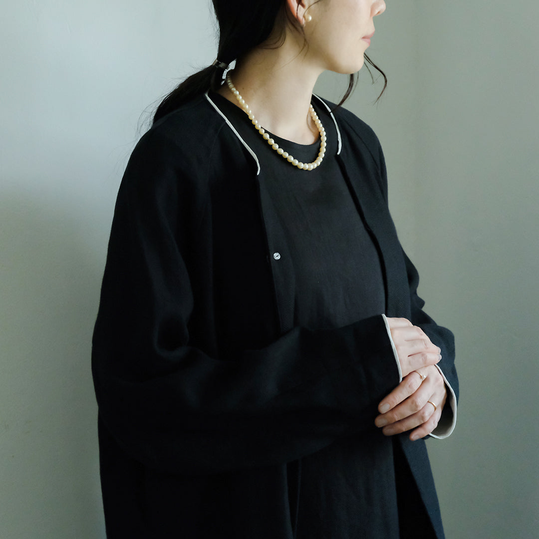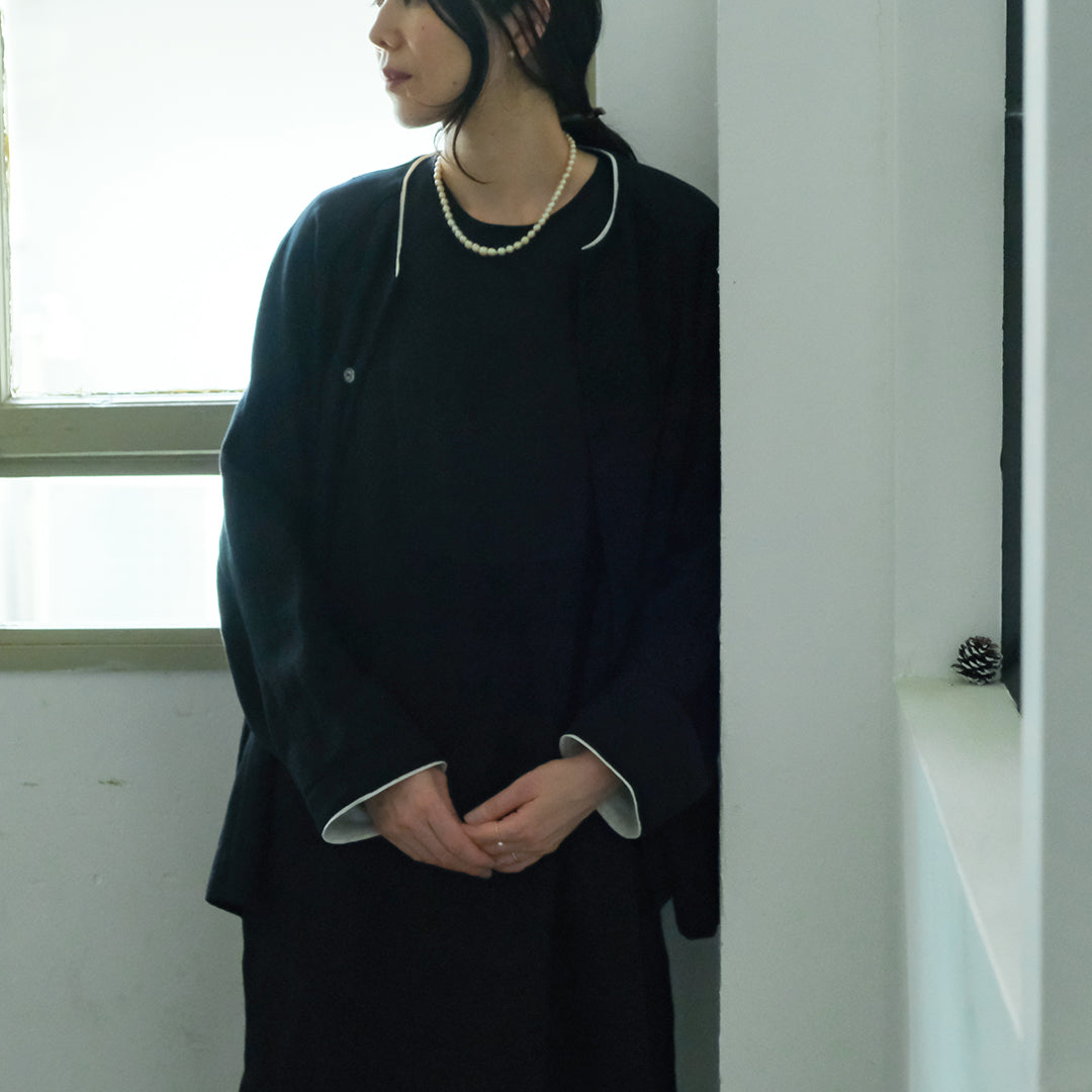袖口と襟元にはそれぞれコットンリネン生地で縁取り、ブラックには白、ダークネイビーには黒が覗くようにデザインされています。