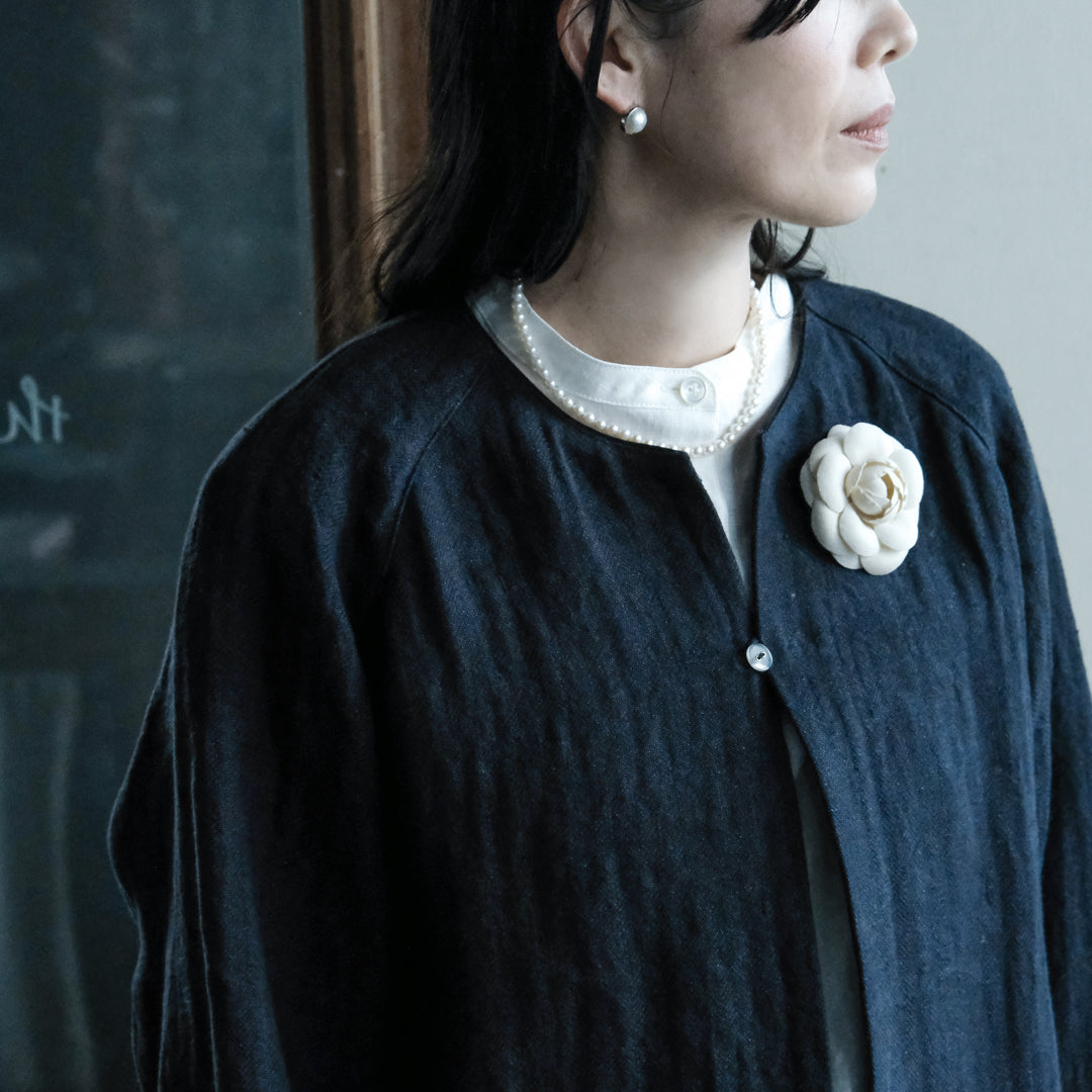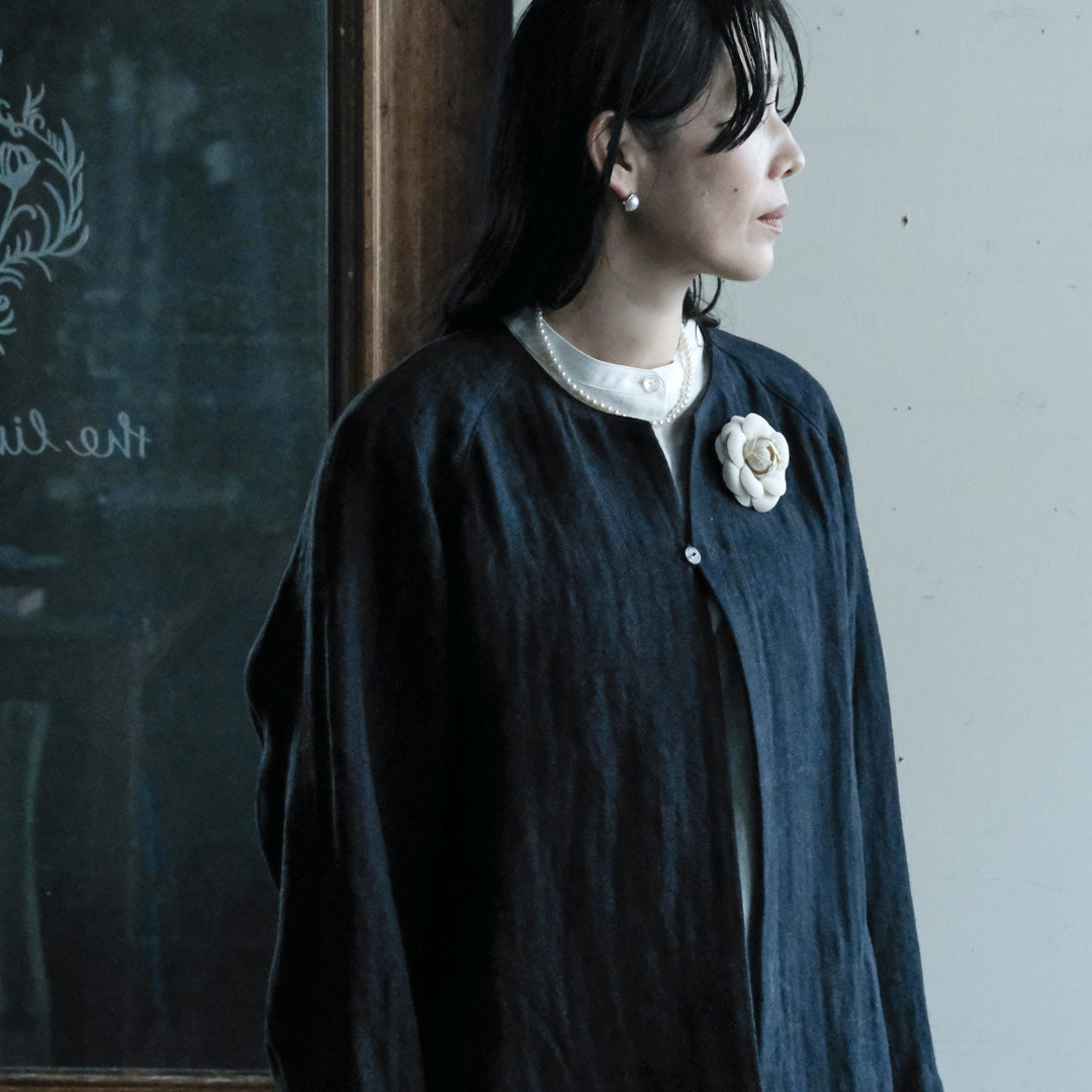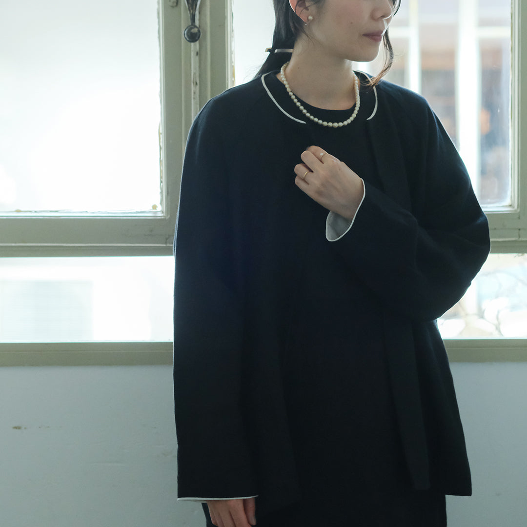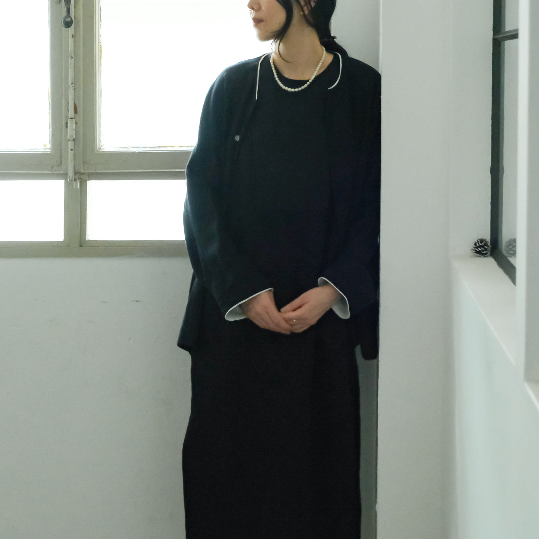 袖口と襟元にはそれぞれコットンリネン生地で縁取り、ブラックには白、ダークネイビーには黒が覗くようにデザインされています。