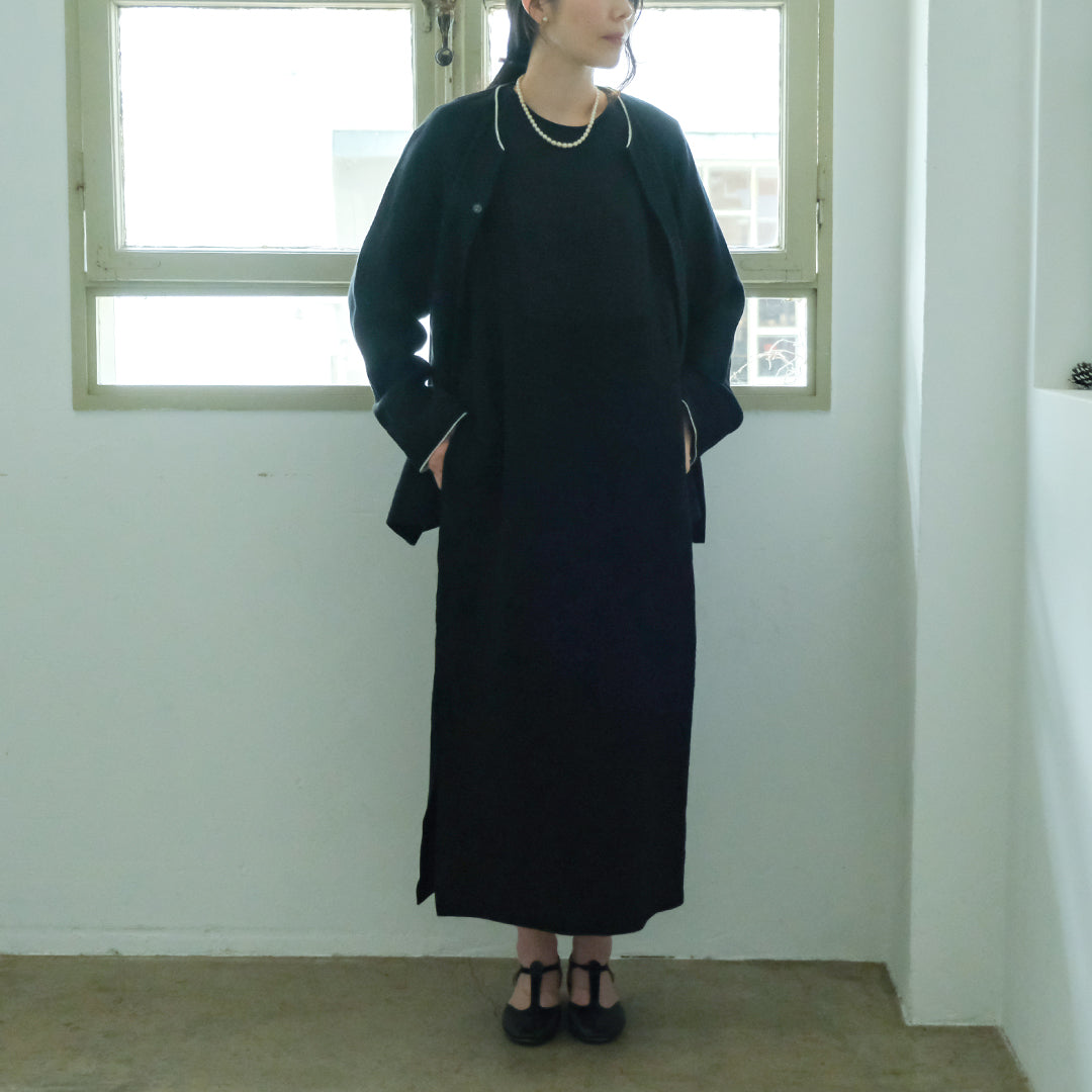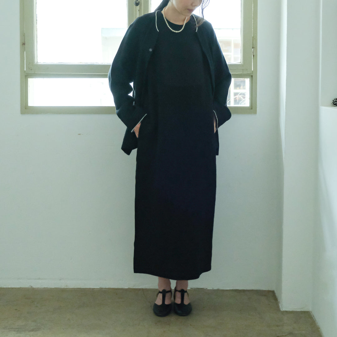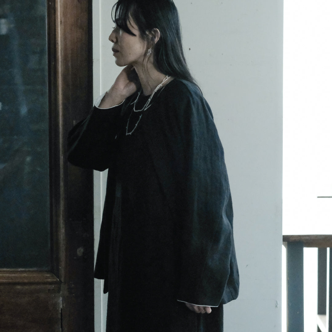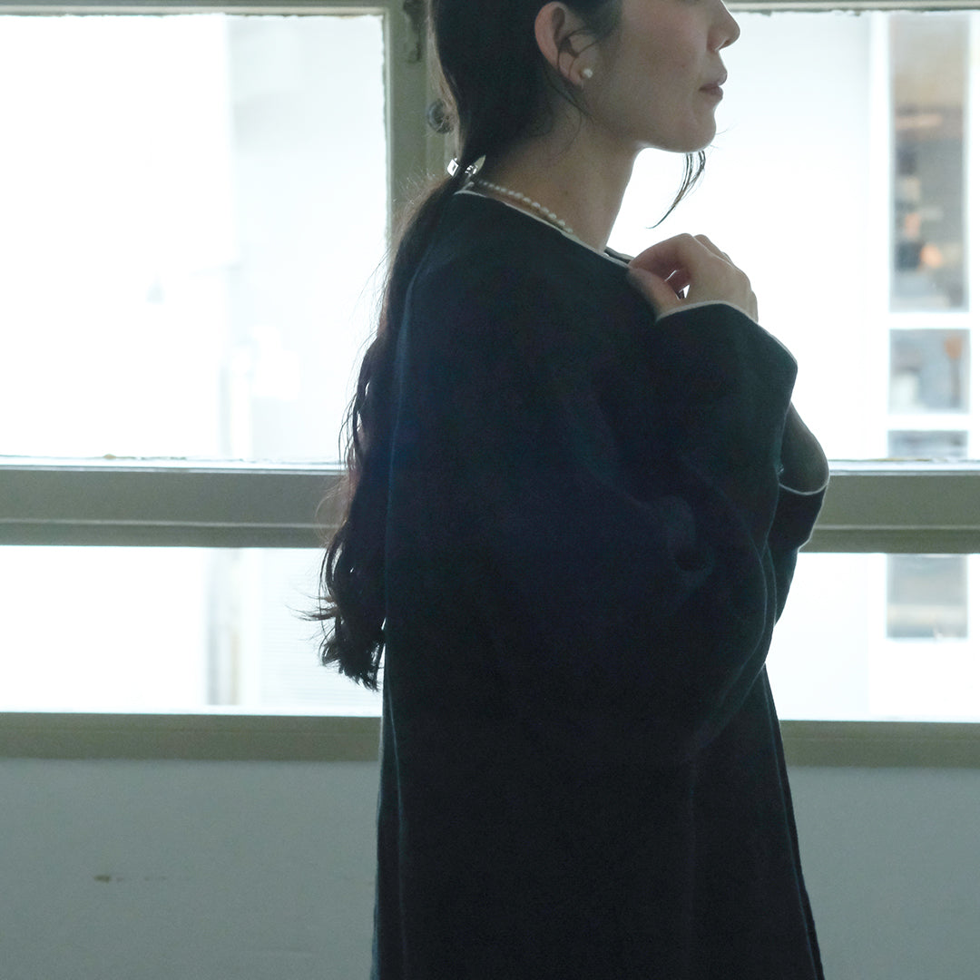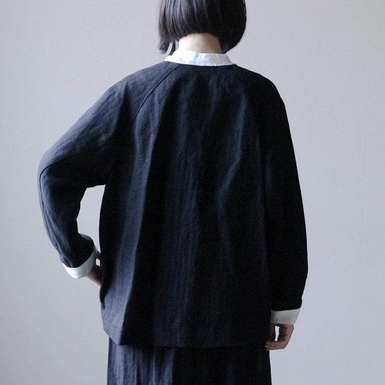袖口と襟元にはそれぞれコットンリネン生地で縁取り、ブラックには白、ダークネイビーには黒が覗くようにデザインされています。