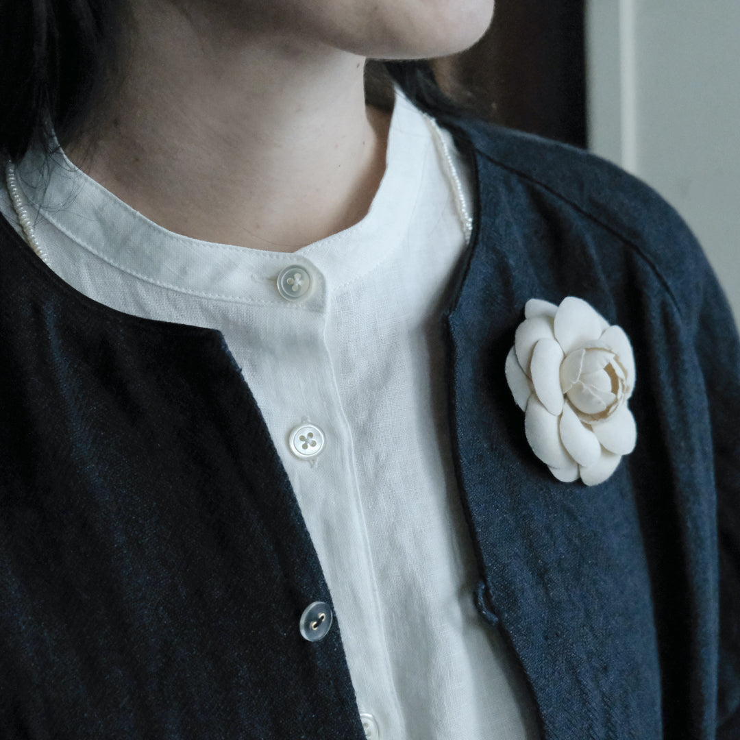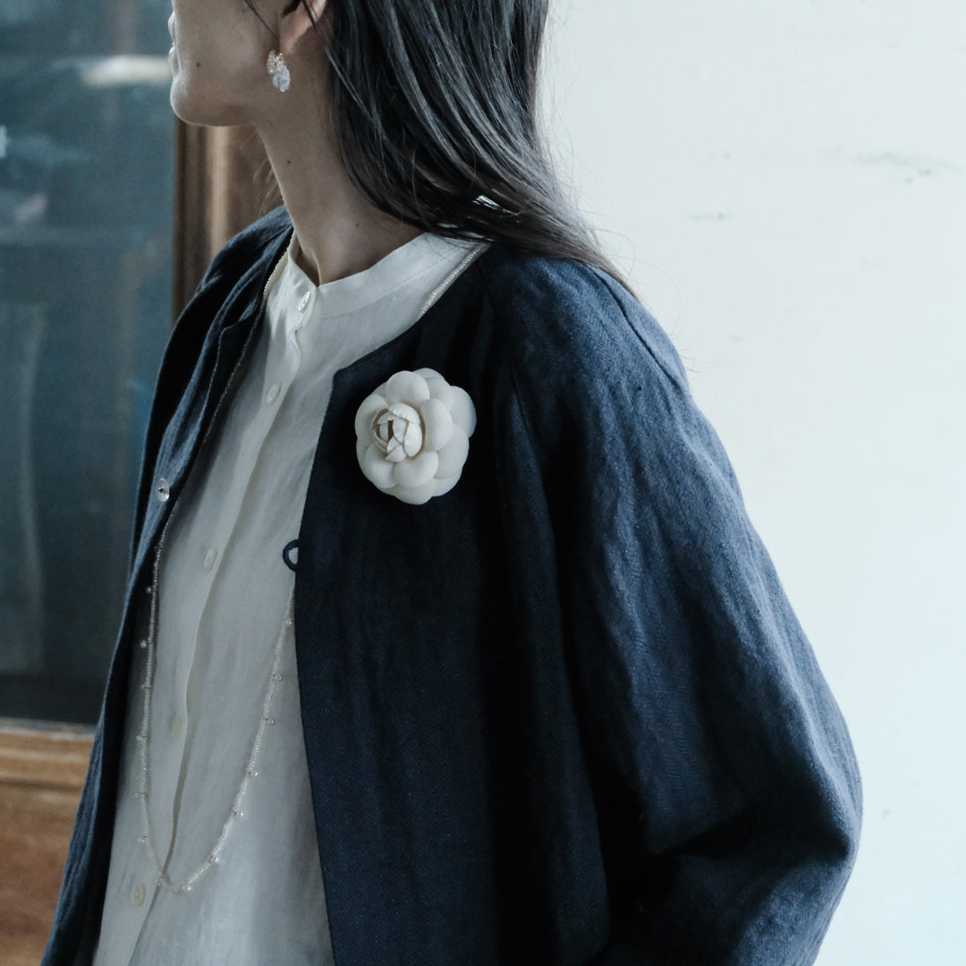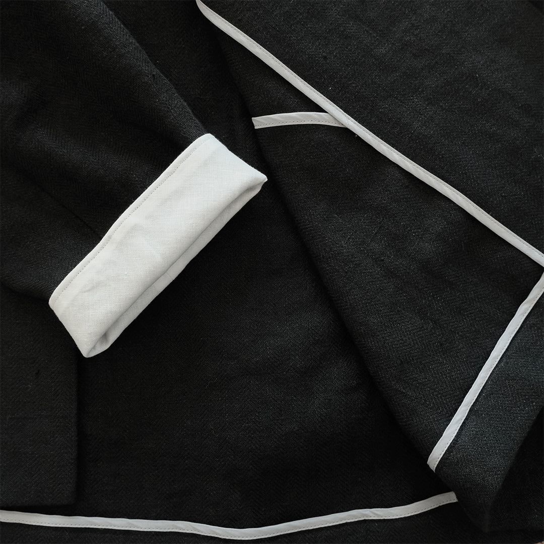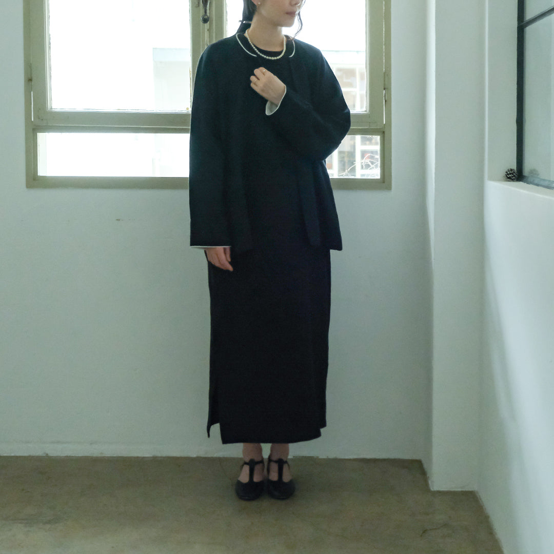 袖口と襟元にはそれぞれコットンリネン生地で縁取り、ブラックには白、ダークネイビーには黒が覗くようにデザインされています。