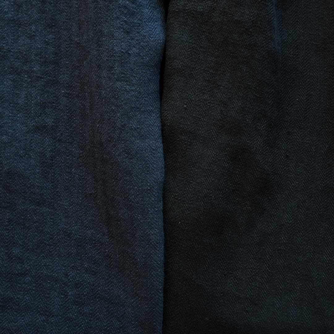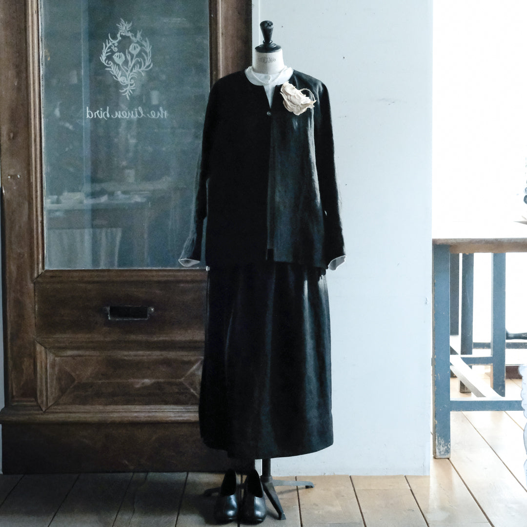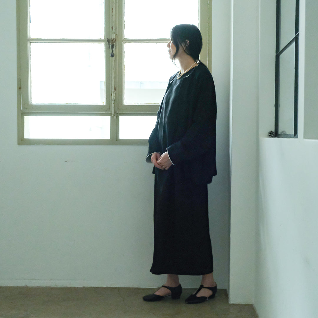 深みのあるブラックは、後染めによって生まれた特別な色です。マニッシュでミニマルな雰囲気ある着こなしに。