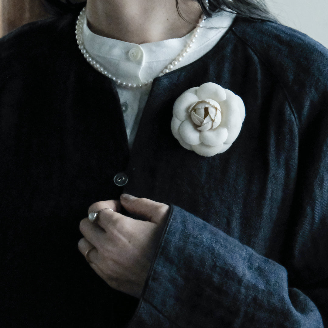 パールやコサージュとも好相性で、派手すぎないけれど上品で華やかな印象。