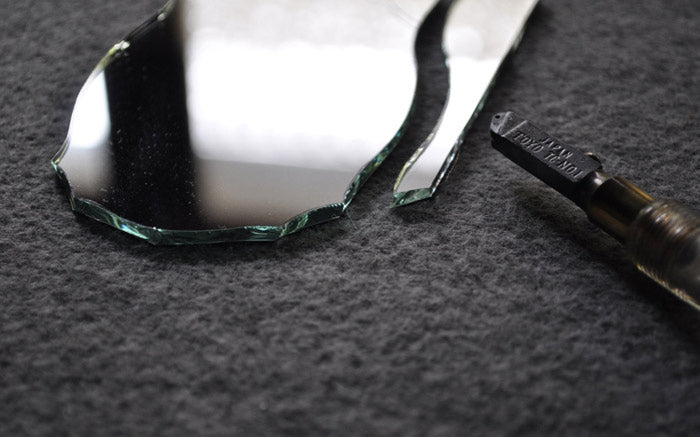 神戸のステンドグラス作家山崎まどかさんによる手鏡。美しい曲線に縁取られた鏡は、ハンドカットで切り出してつくられています。