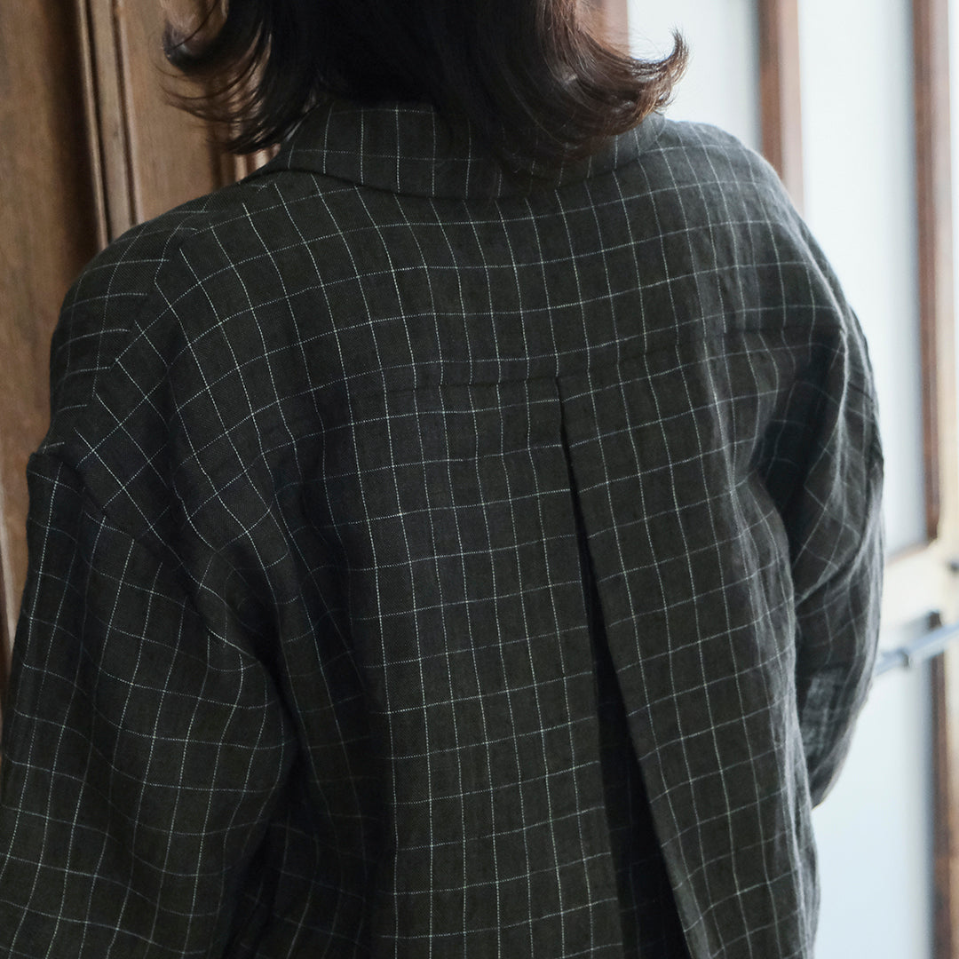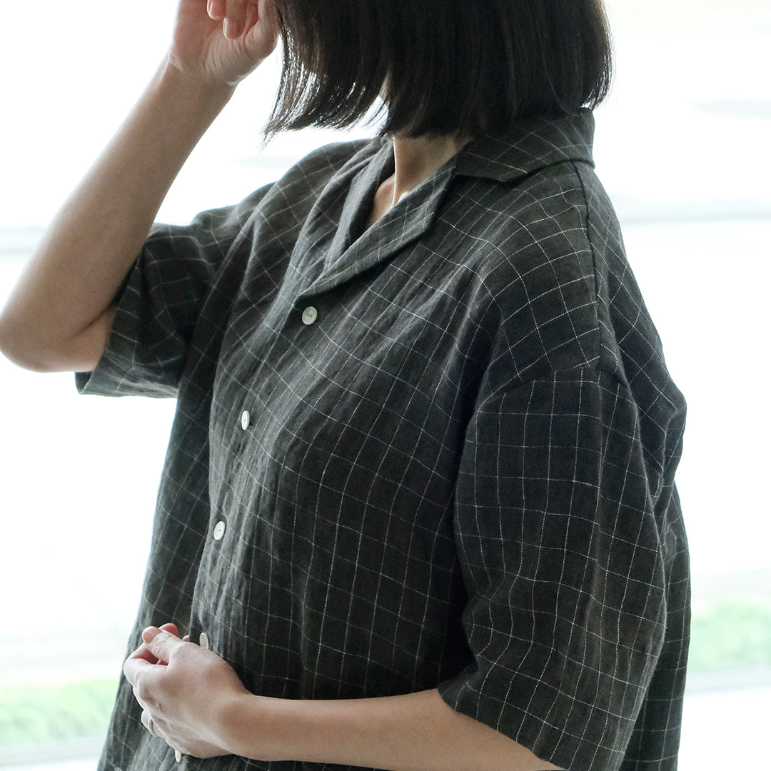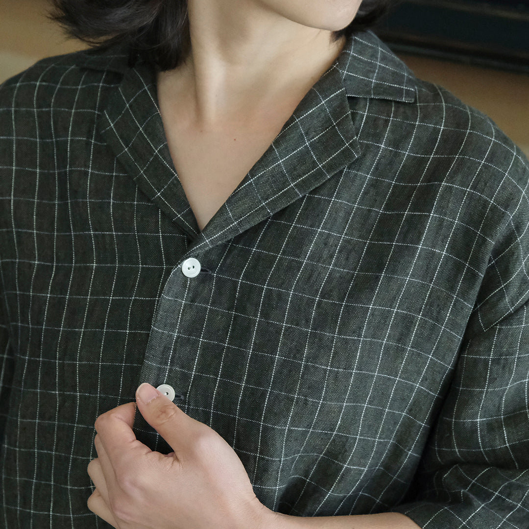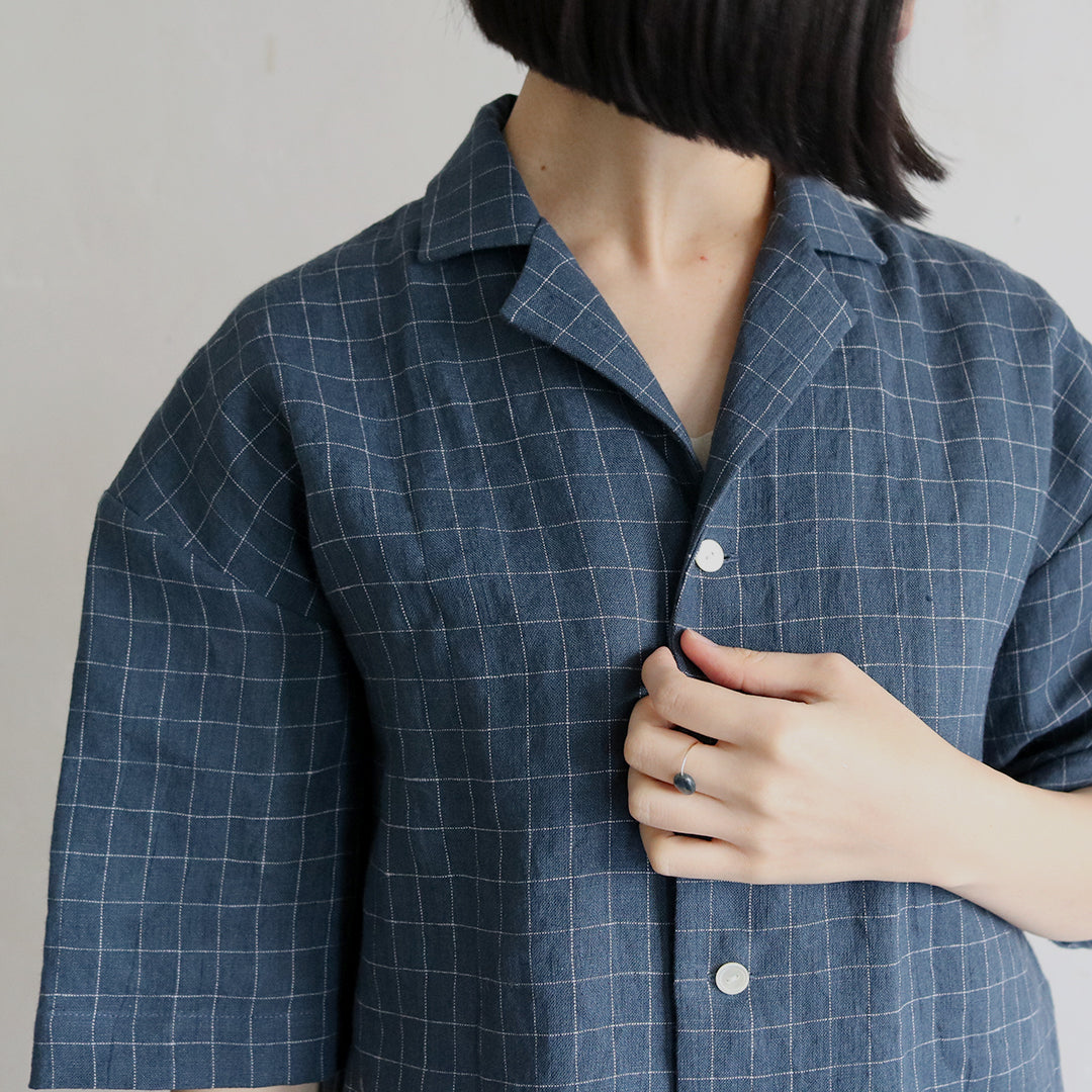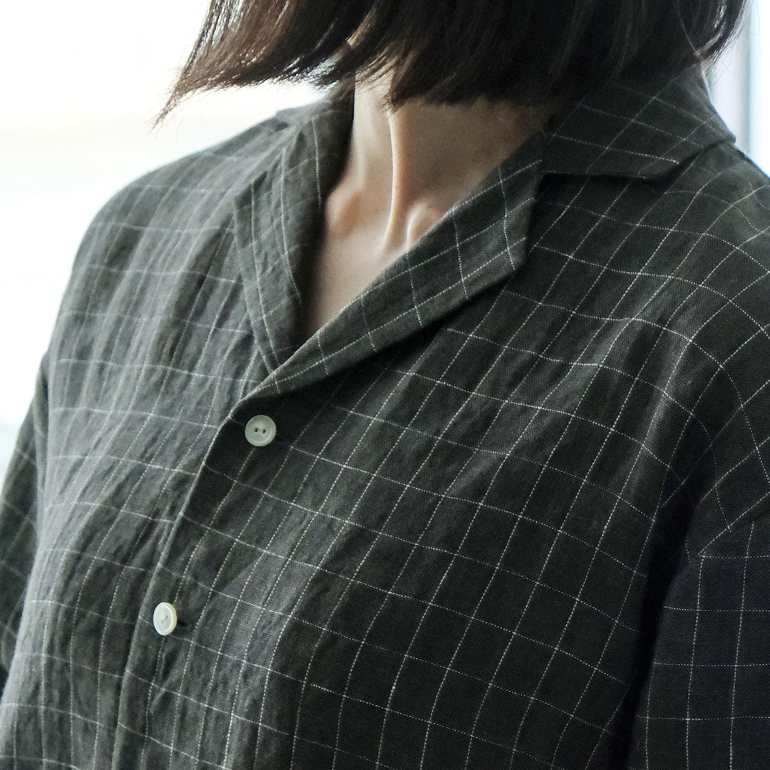 オープンカラーの襟の開きが美しく、品のあるシャツ。中厚のリトアニアリネンがつくる、はっきりとしたシルエットが楽しめます。