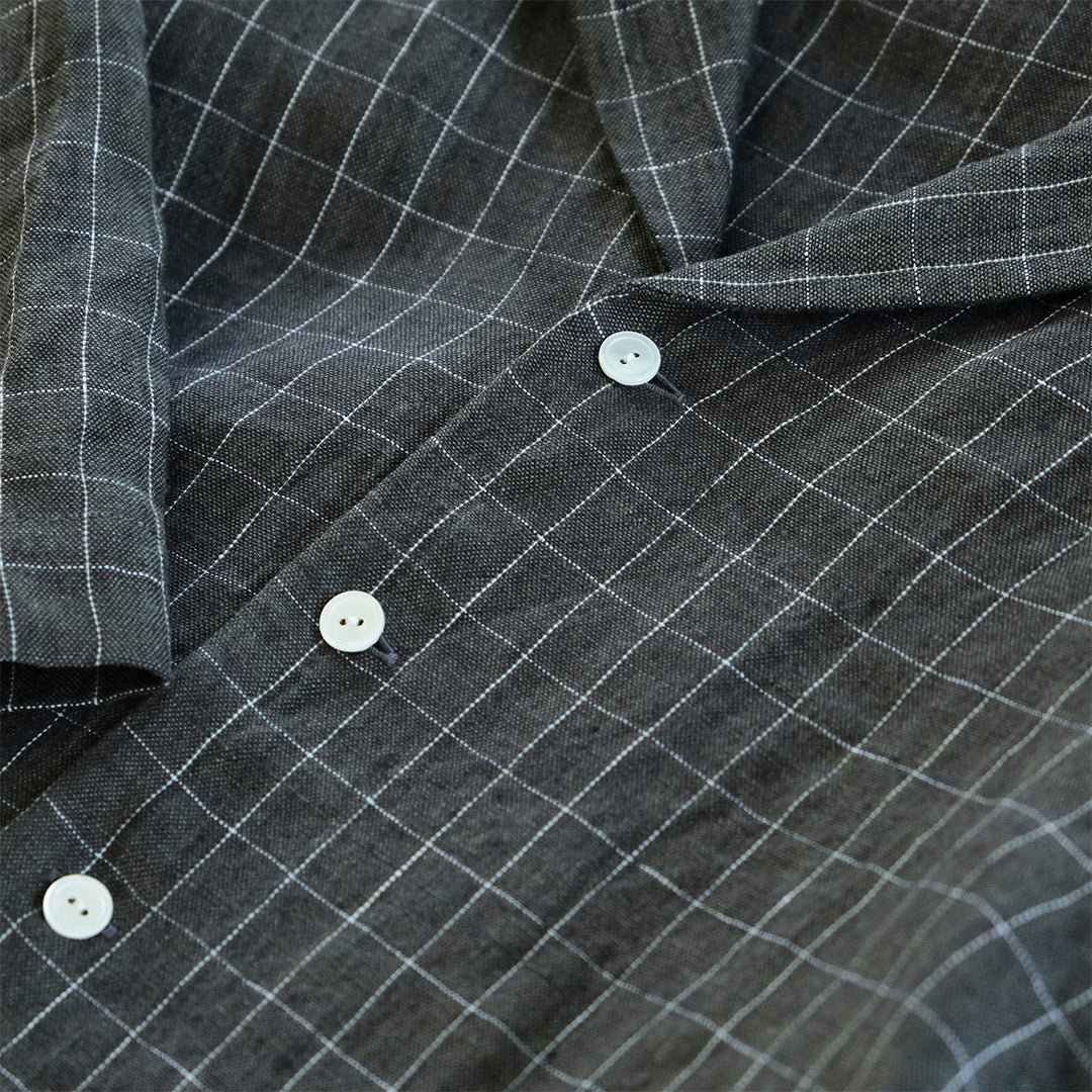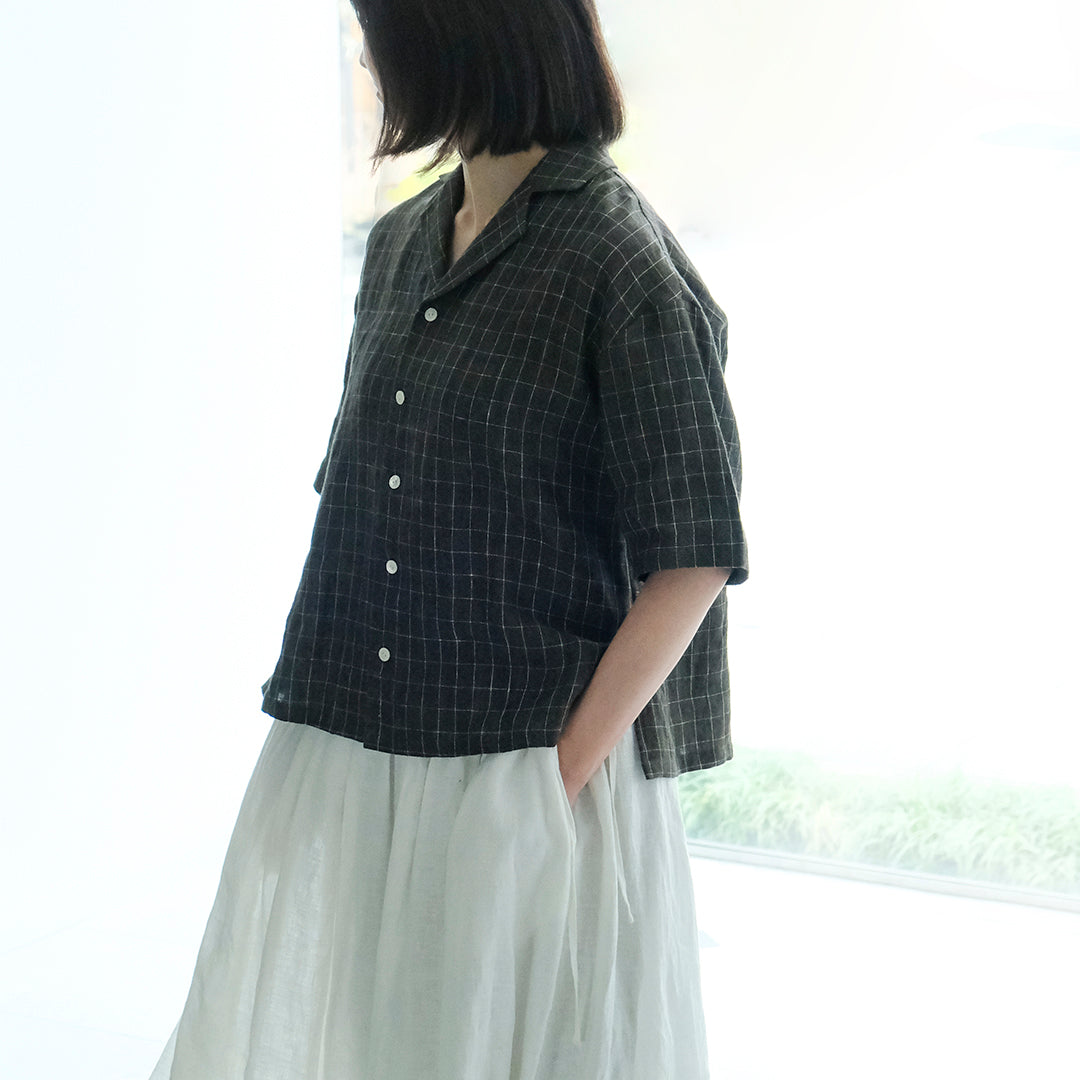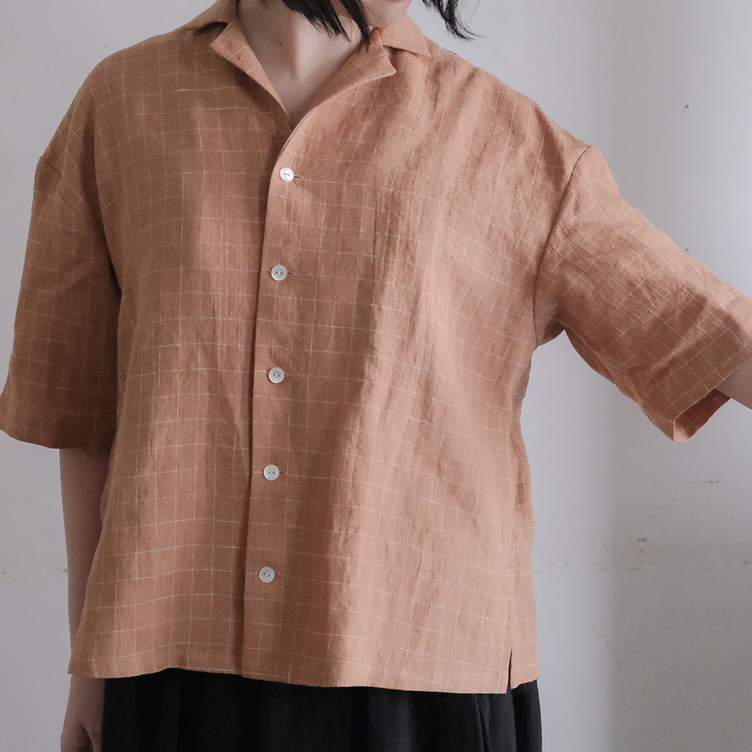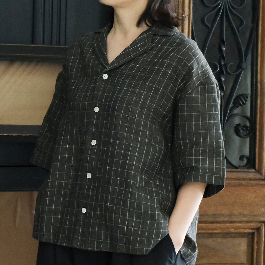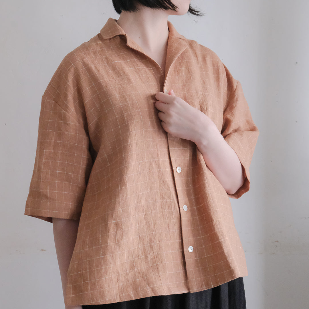 オープンカラーの襟の開きが美しく、品のあるシャツ。中厚のリトアニアリネンがつくる、はっきりとしたシルエットが楽しめます。