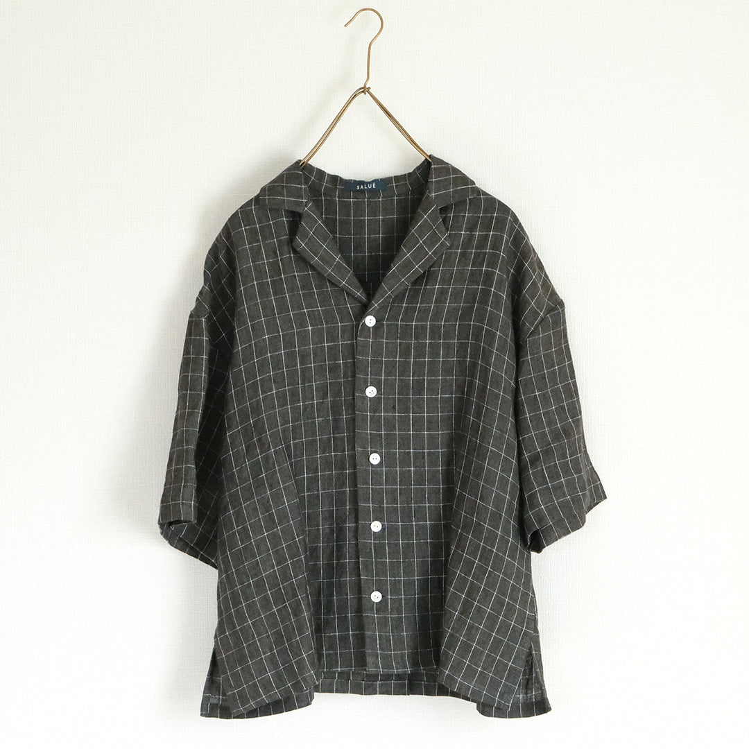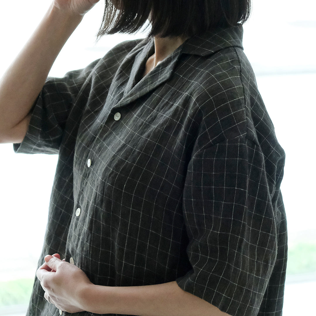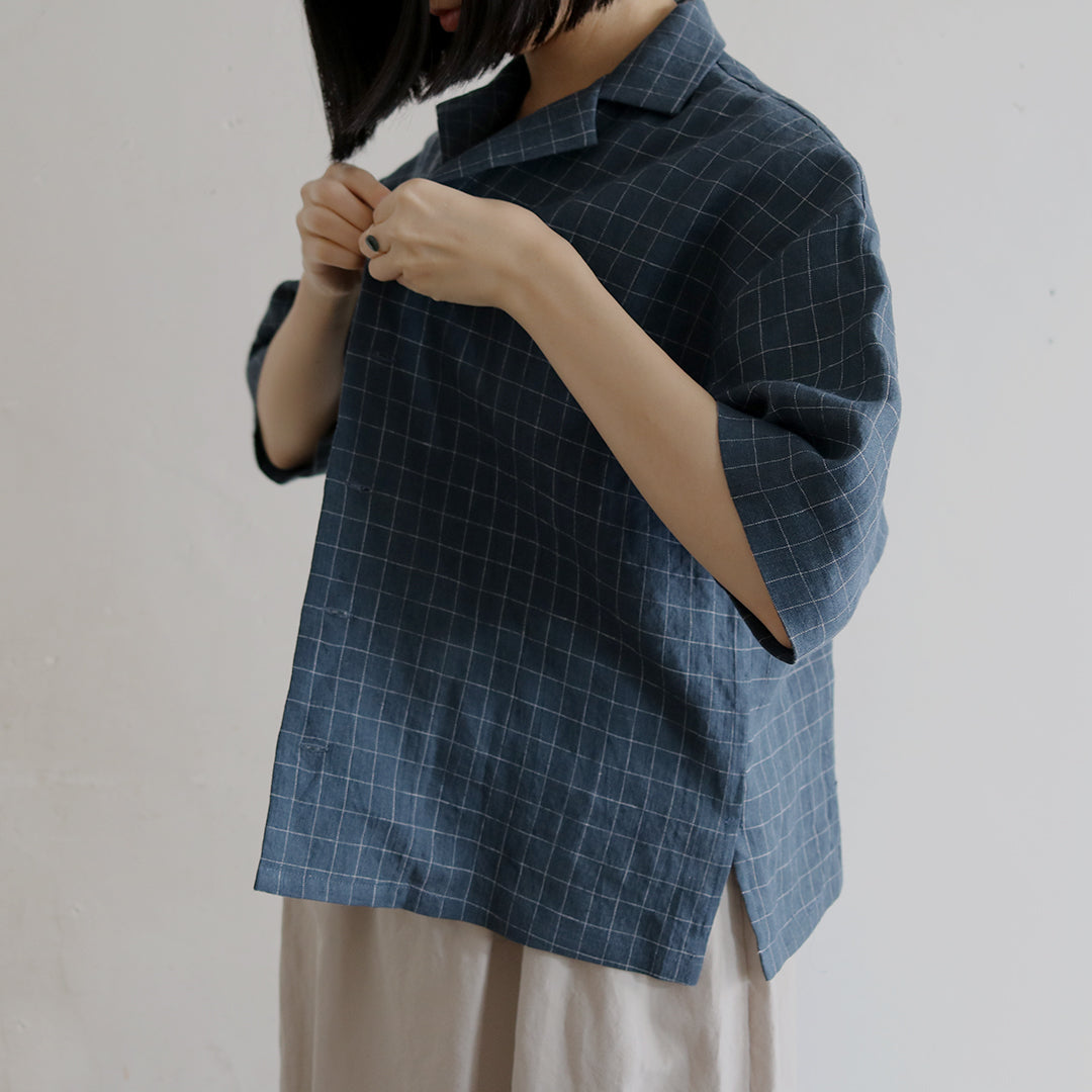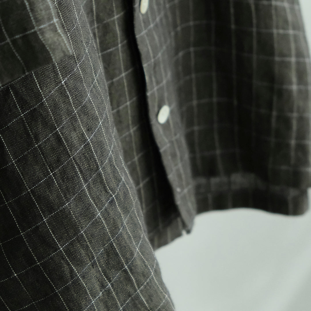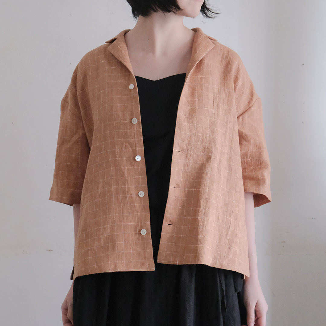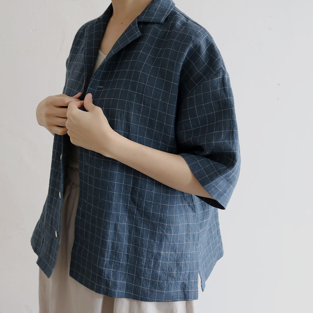 オープンカラーの襟の開きが美しく、品のあるシャツ。中厚のリトアニアリネンがつくる、はっきりとしたシルエットが楽しめます。