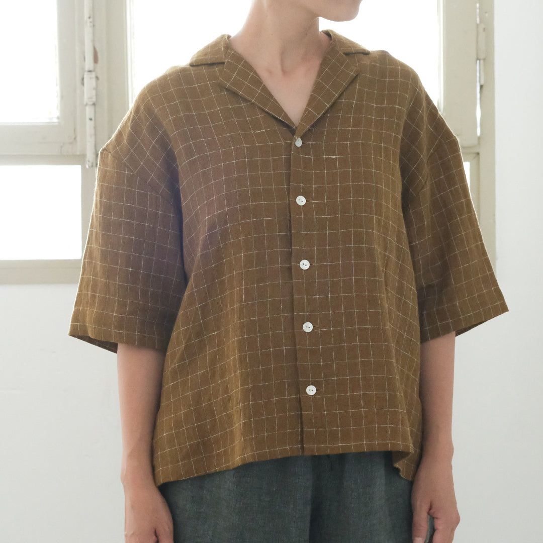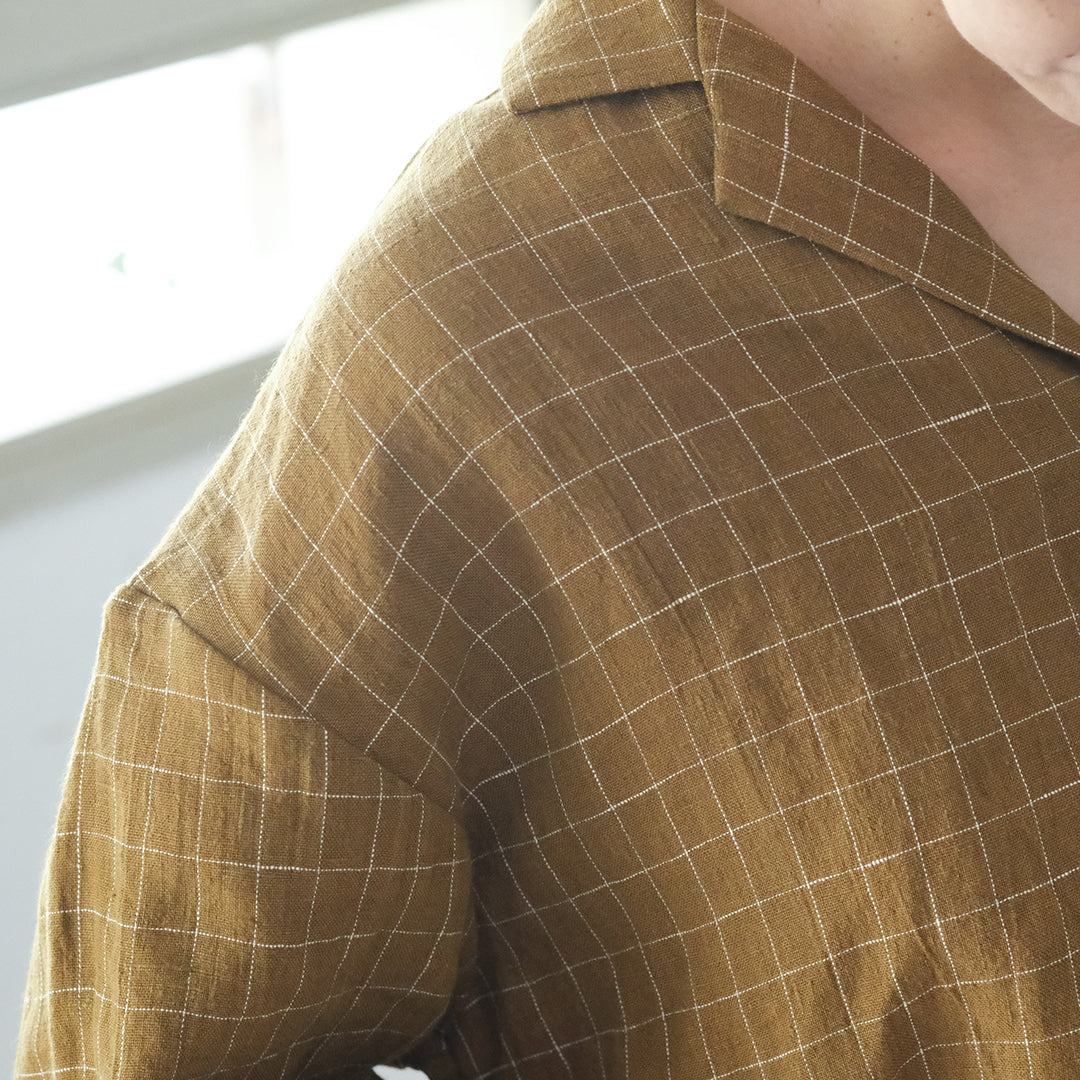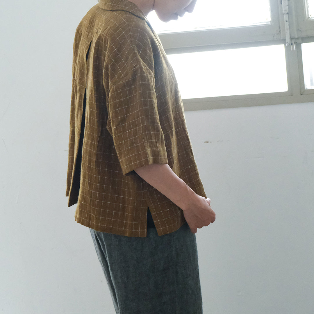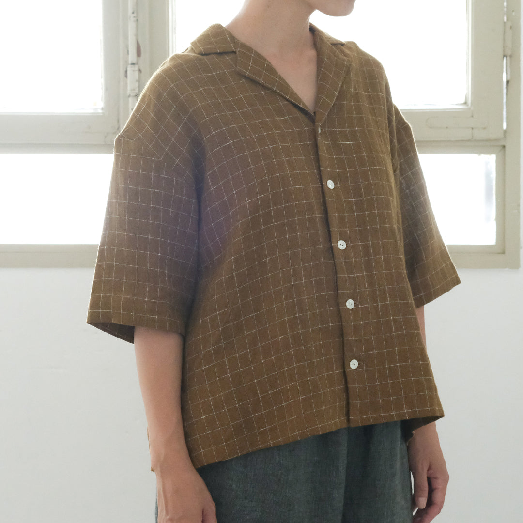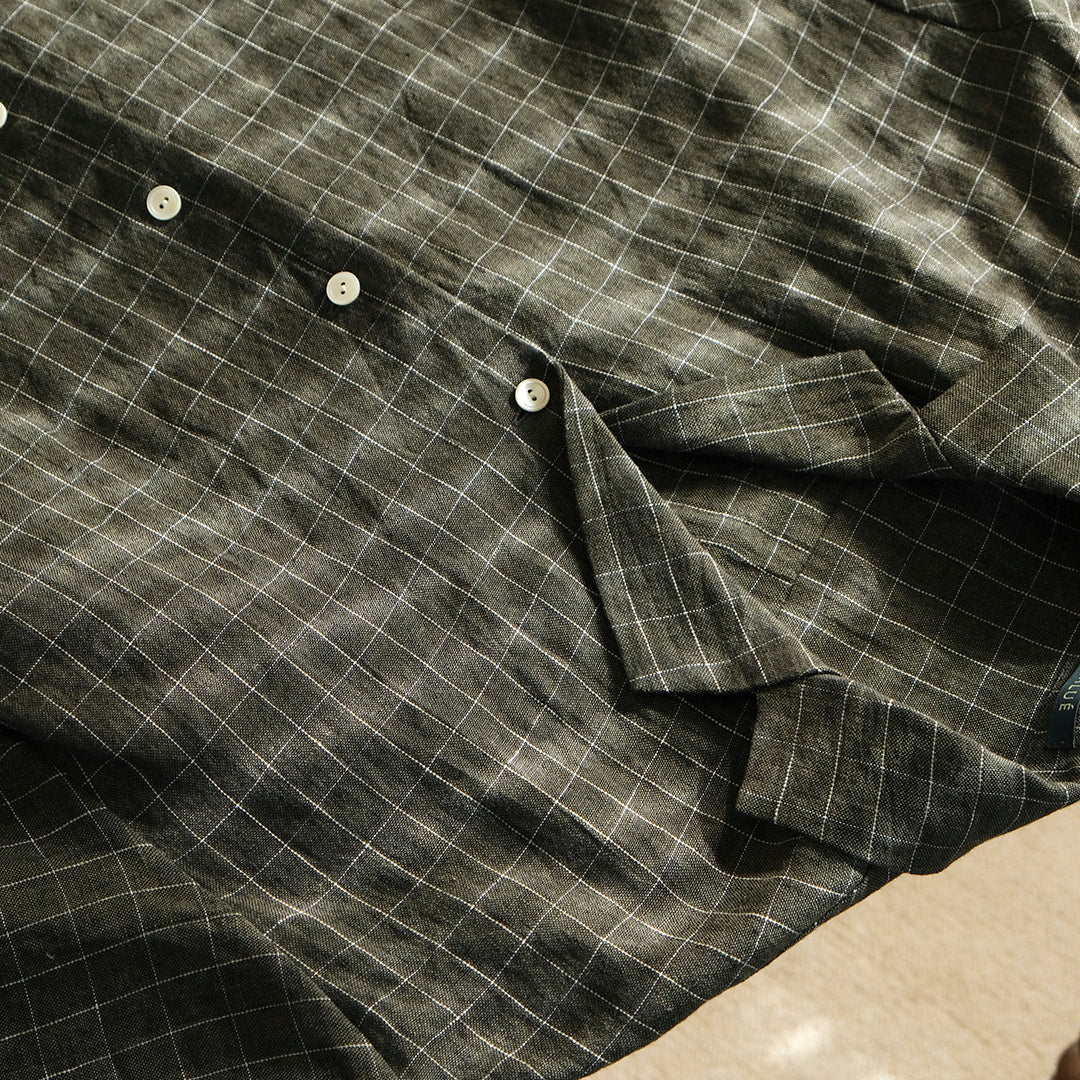 オープンカラーの襟の開きが美しく、品のあるシャツ。中厚のリトアニアリネンがつくる、はっきりとしたシルエットが楽しめます。