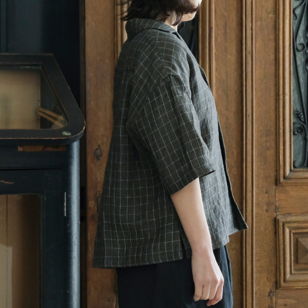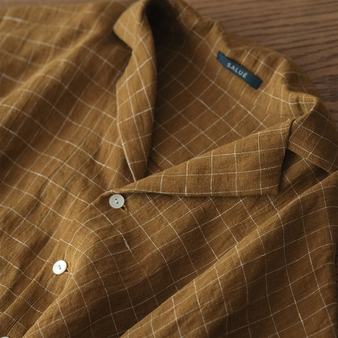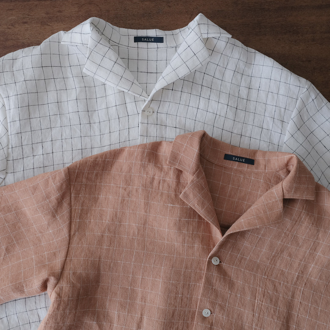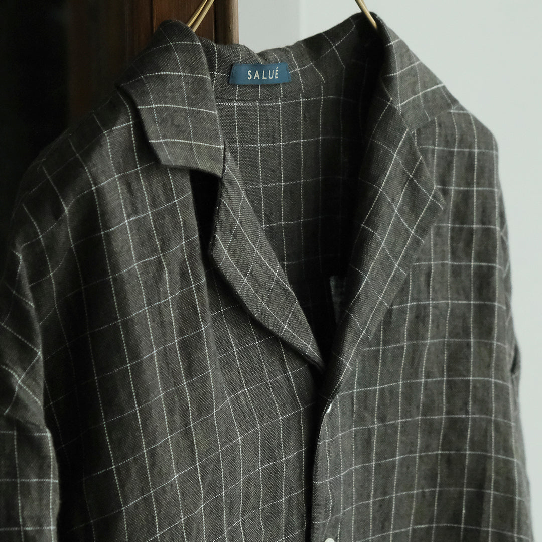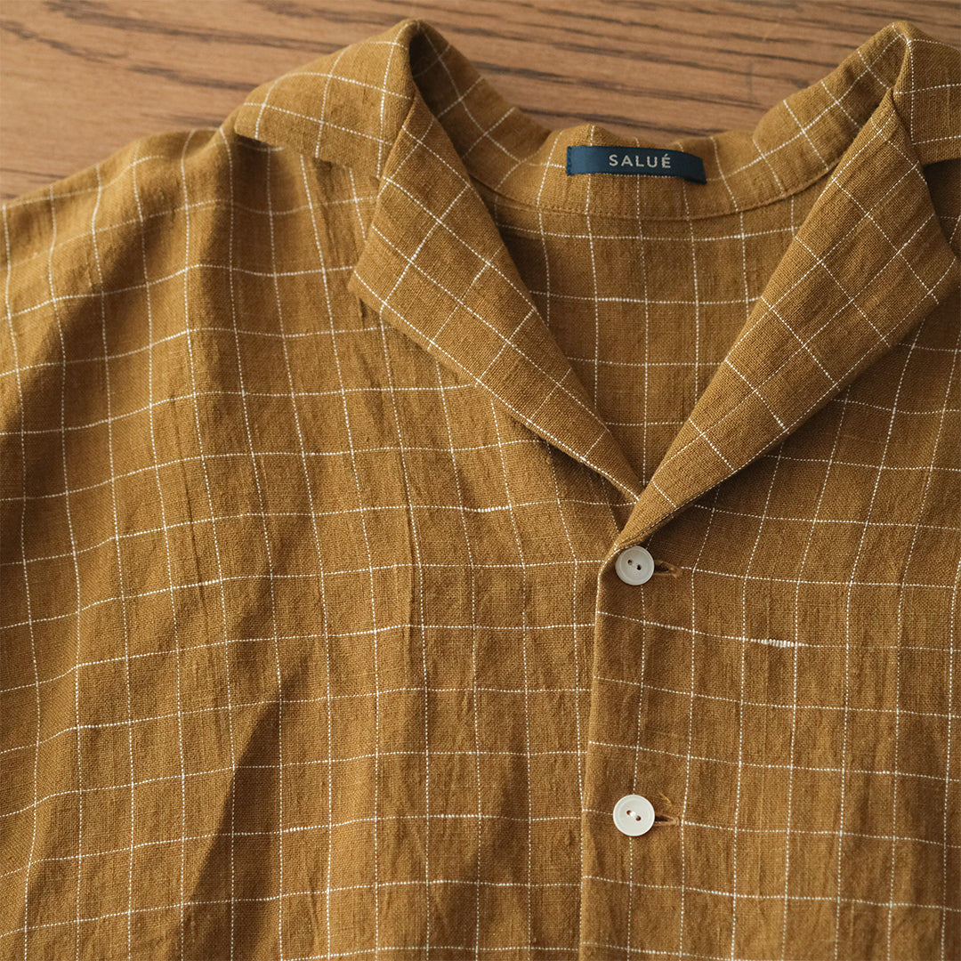 上質な服で都会的な女性らしさを提案するファッションブランド「SALUÉ(サルエ)」の、揺らぎのあるウィンドウチェックの開襟シャツ。2025年夏はチャコールグリーン、アイボリー、ジンジャーブラウンの3色のご紹介です。