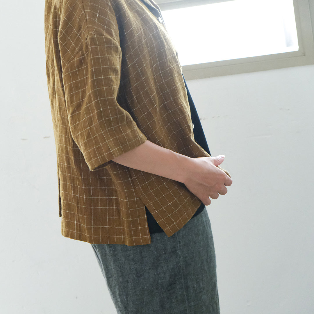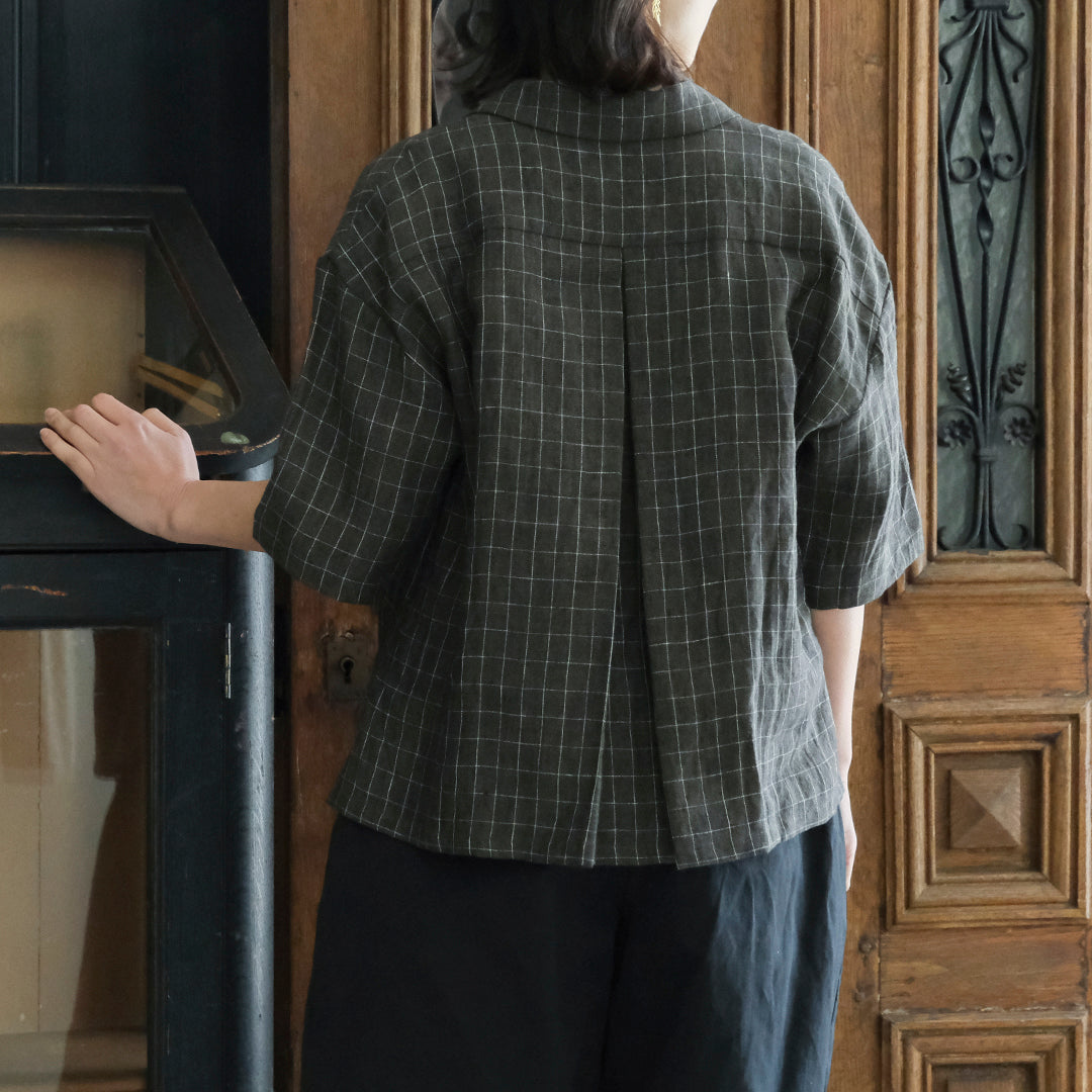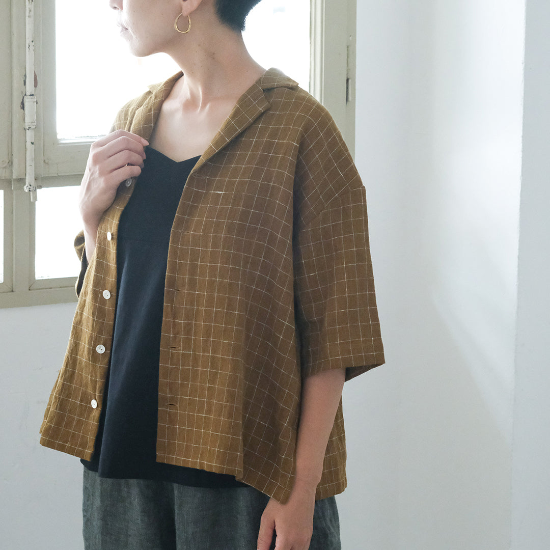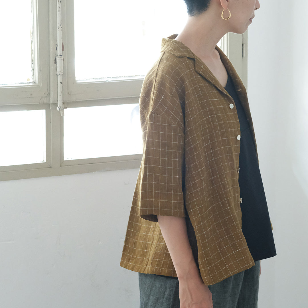 上質な服で都会的な女性らしさを提案するファッションブランド「SALUÉ(サルエ)」の、揺らぎのあるウィンドウチェックの開襟シャツ。2025年夏はチャコールグリーン、アイボリー、ジンジャーブラウンの3色のご紹介です。