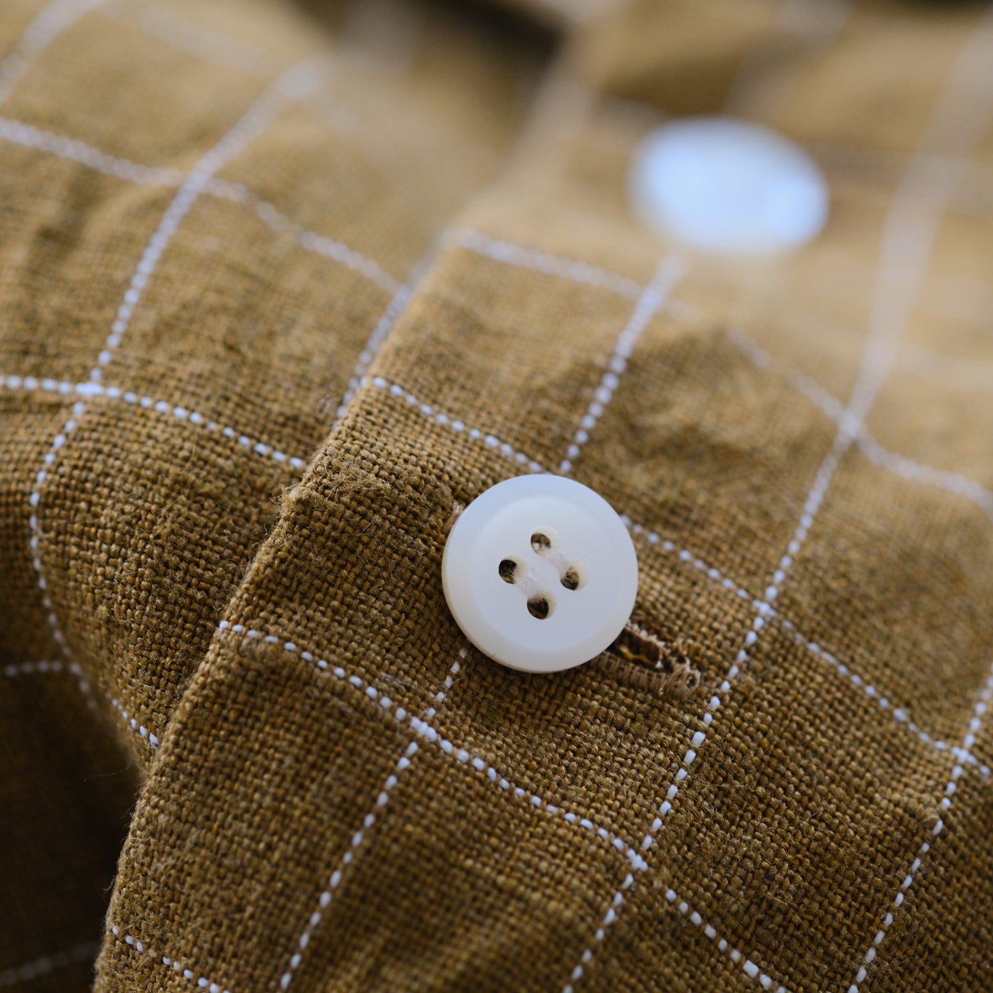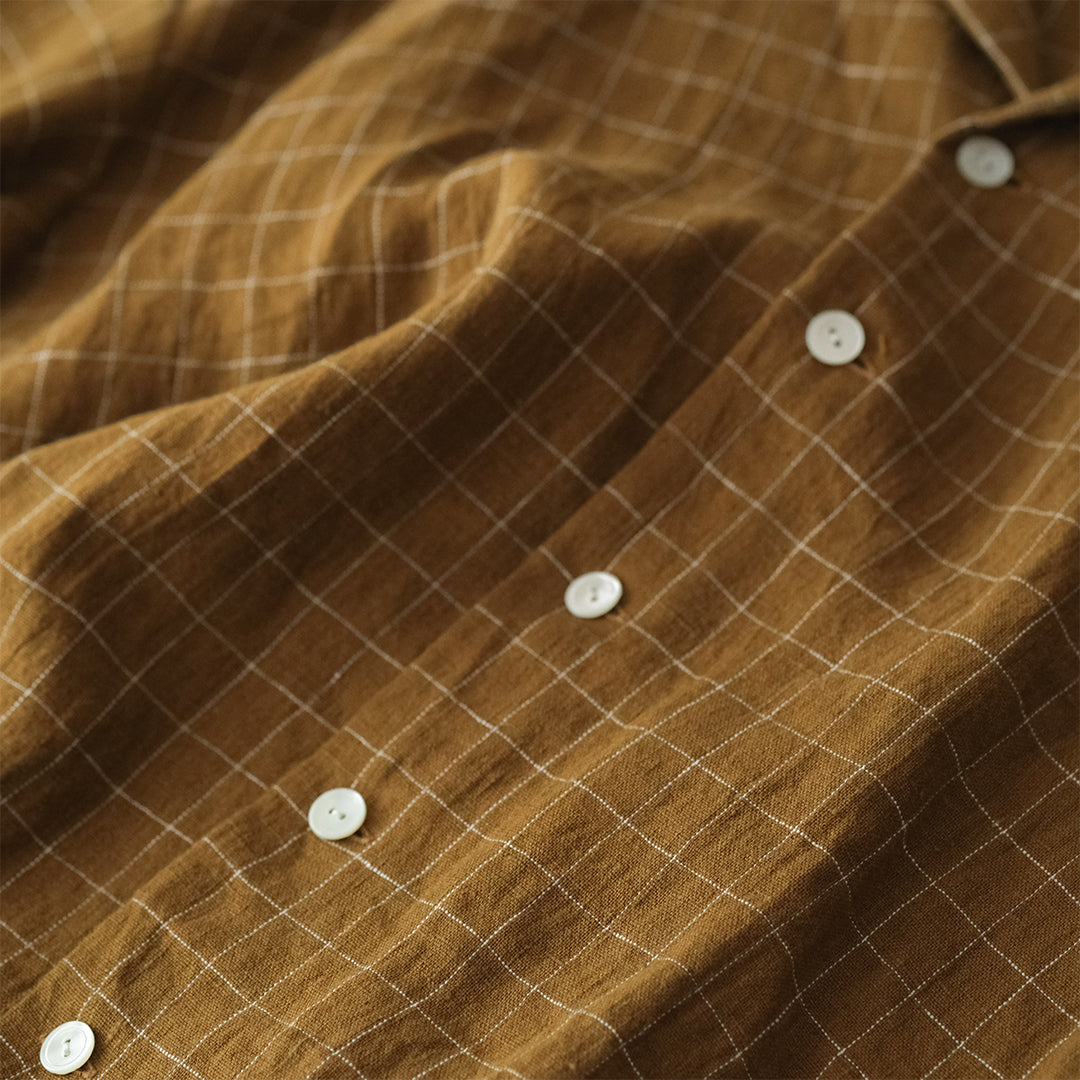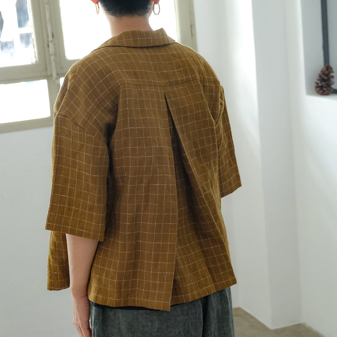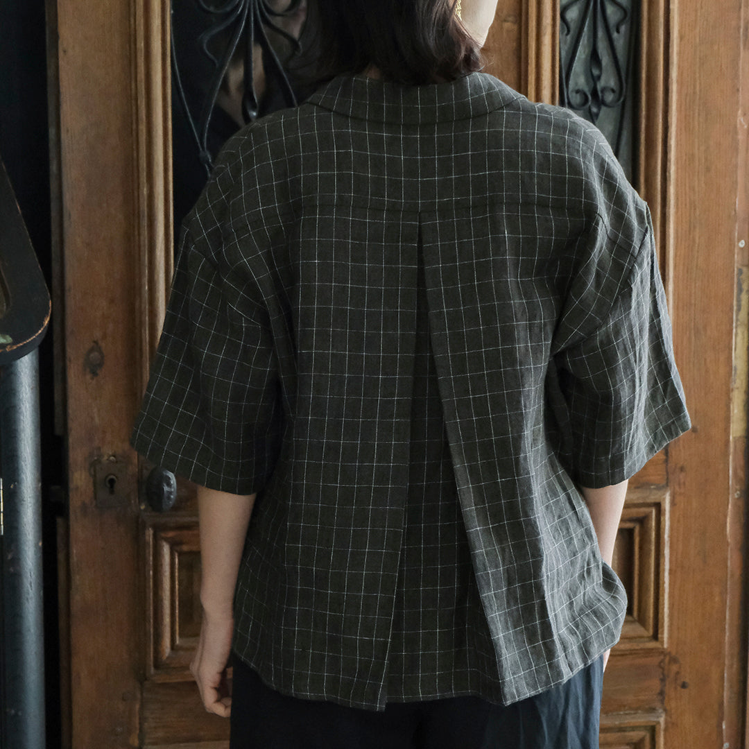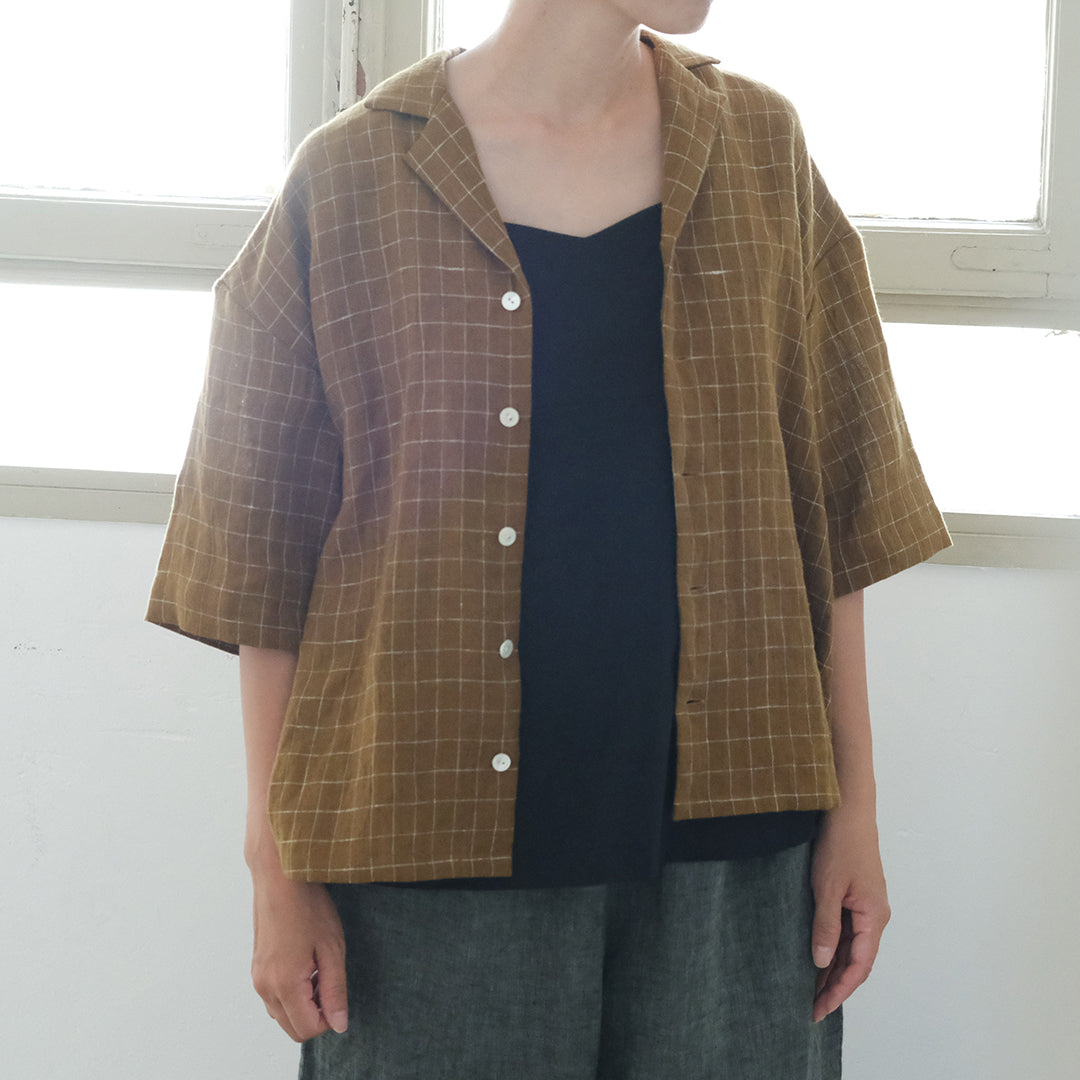 上質な服で都会的な女性らしさを提案するファッションブランド「SALUÉ(サルエ)」の、揺らぎのあるウィンドウチェックの開襟シャツ。2025年夏はチャコールグリーン、アイボリー、ジンジャーブラウンの3色のご紹介です。