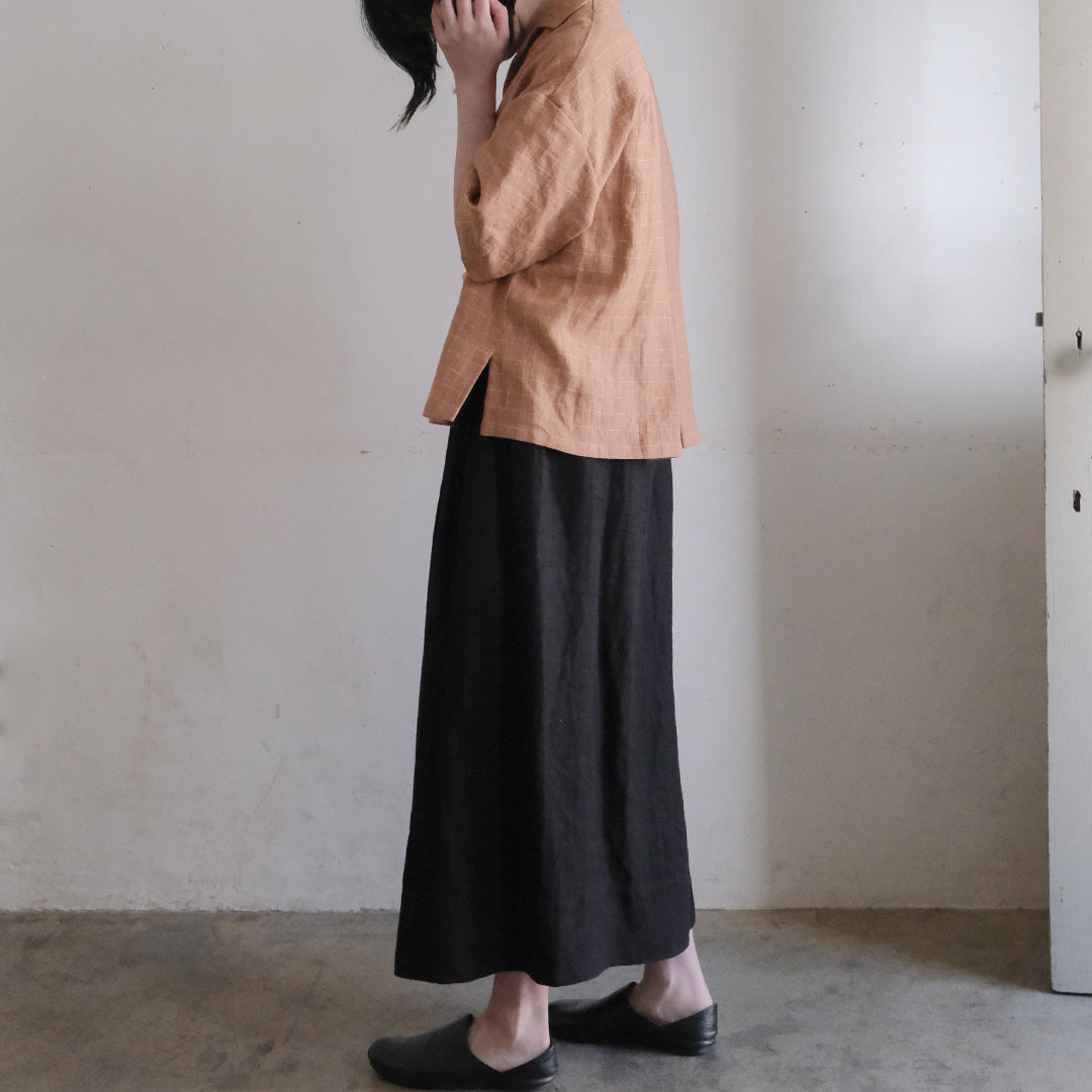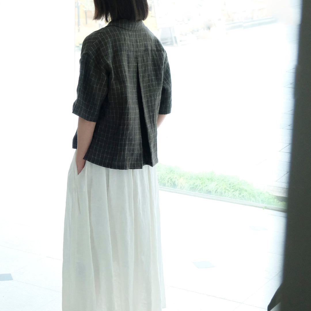 3色の中では一番新しいチャコールグリーンは、普段柄のあるアイテムを着ない方にもおすすめ。ぐっとおしゃれの感度が上がるカラーで、モノトーンのボトムスに合わせても華やかな印象になります。▲リトアニアンリネンタックギャザースカート、モデル身長168cm