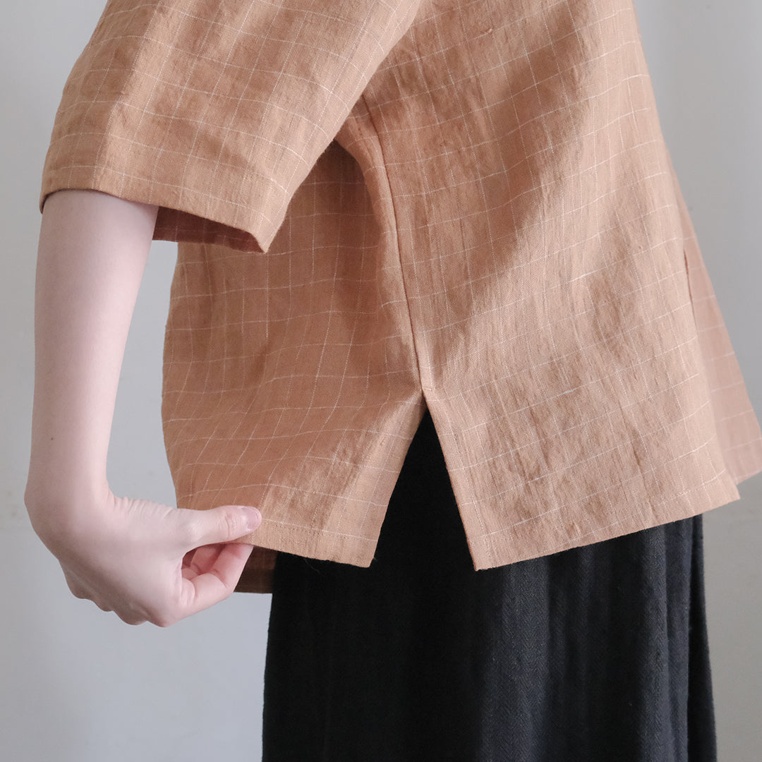 落ち感がありゆったりとした肩回りに、腕周りを隠してくれるうれしい5分丈袖。ゆとりを持ちながら、すとんとすっきり見えるシルエットはどんな体型の方でも着やすい一枚です。▲ジンジャーブラウン、モデル身長161cm
