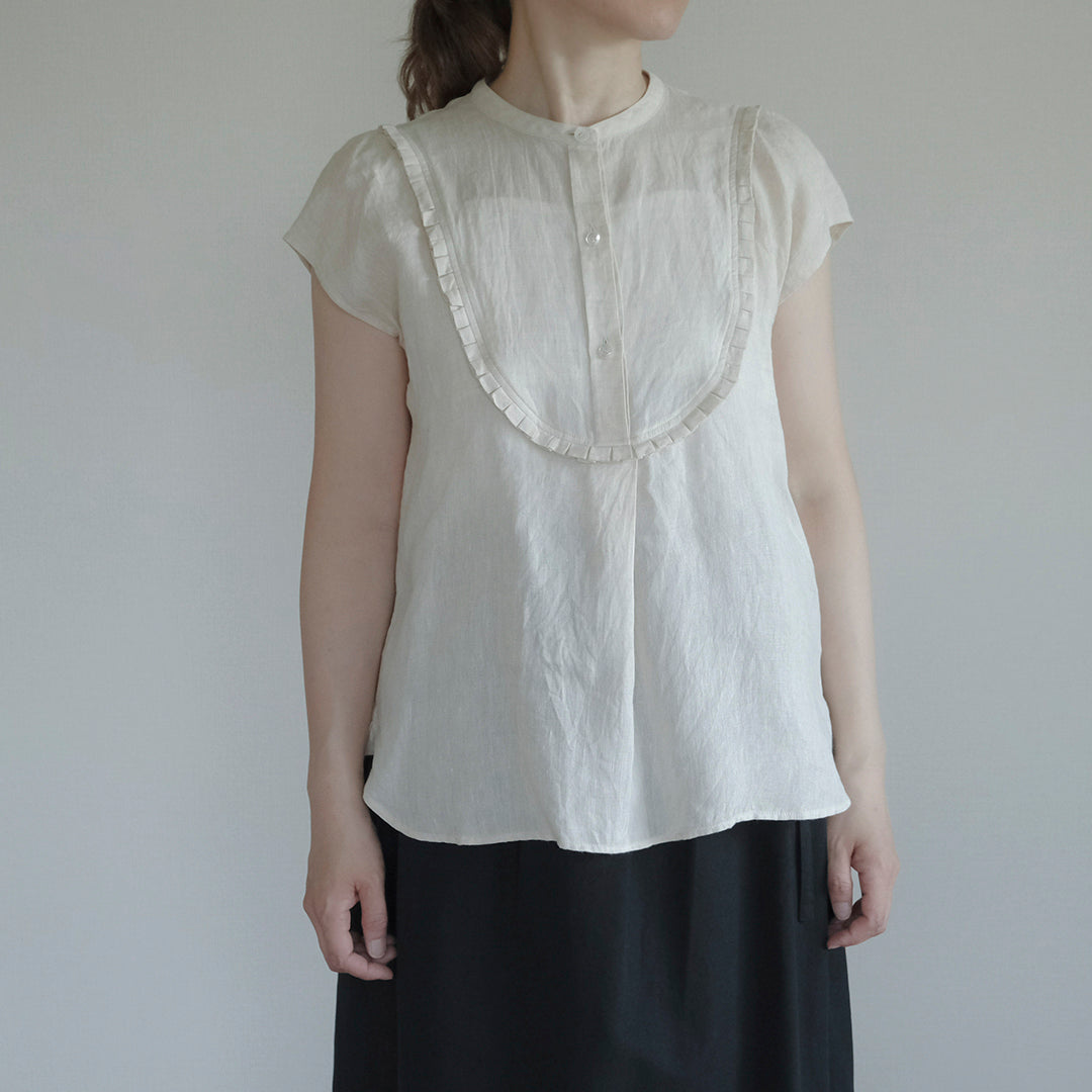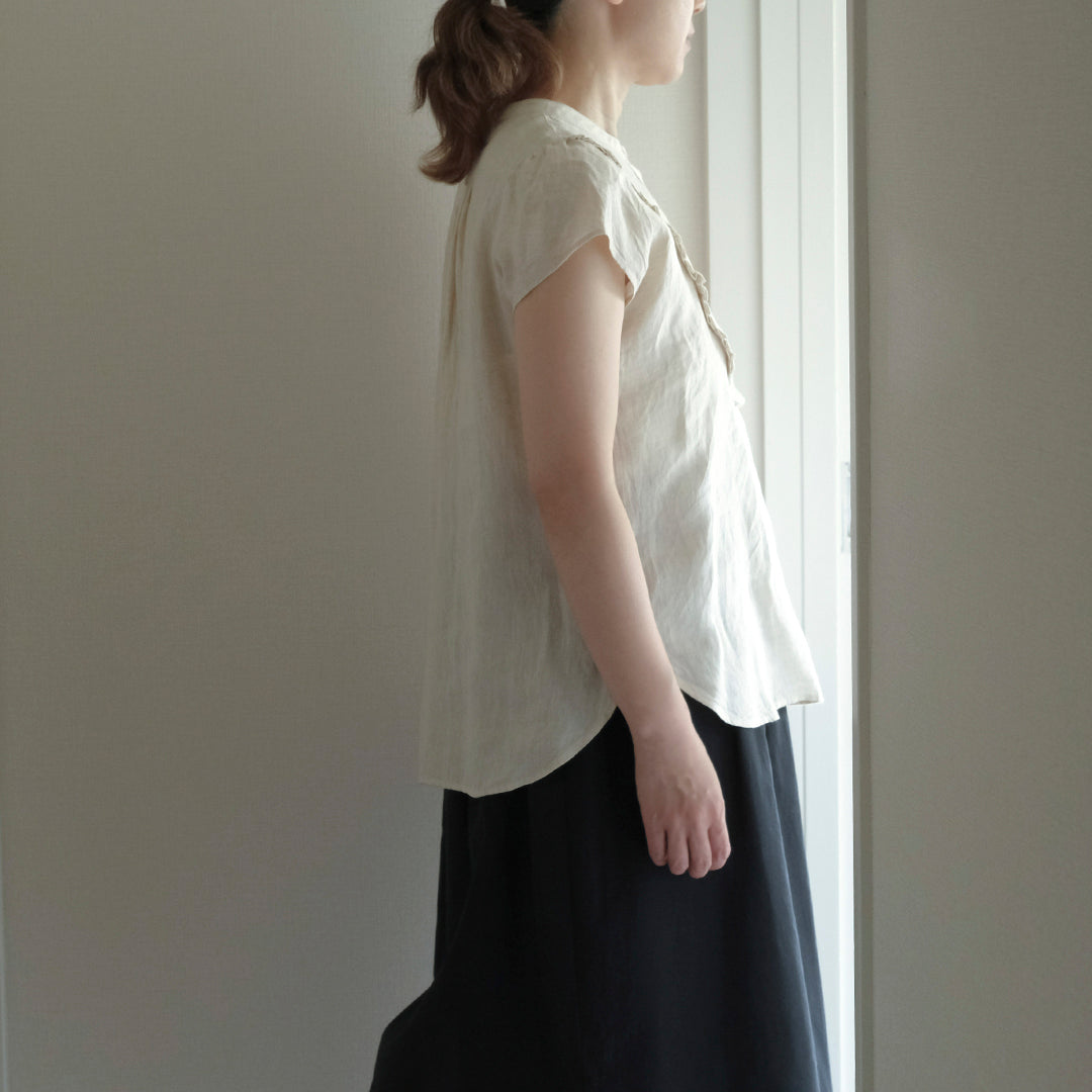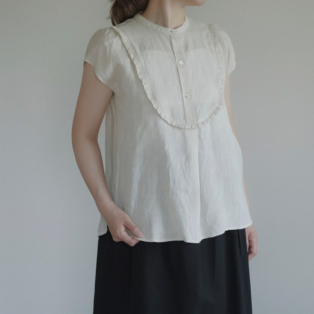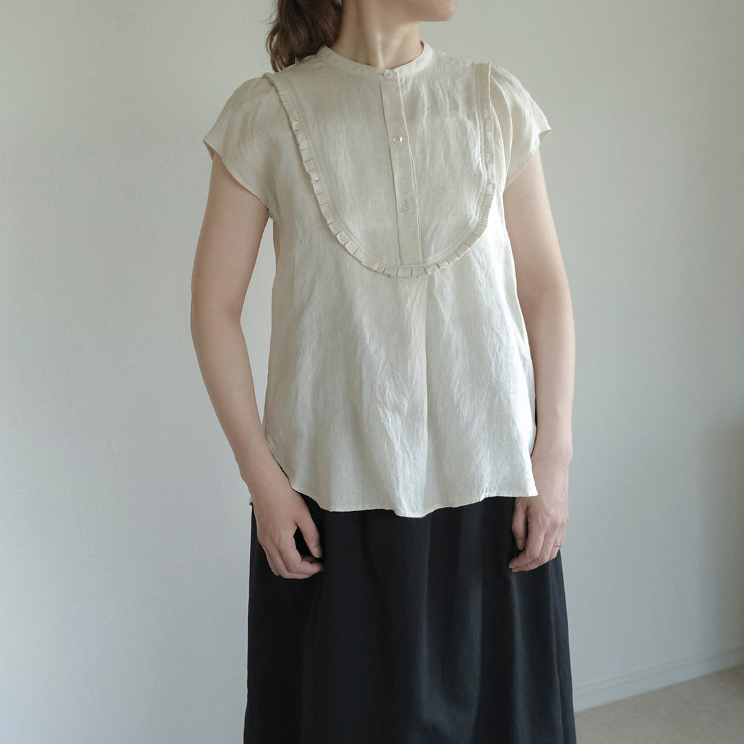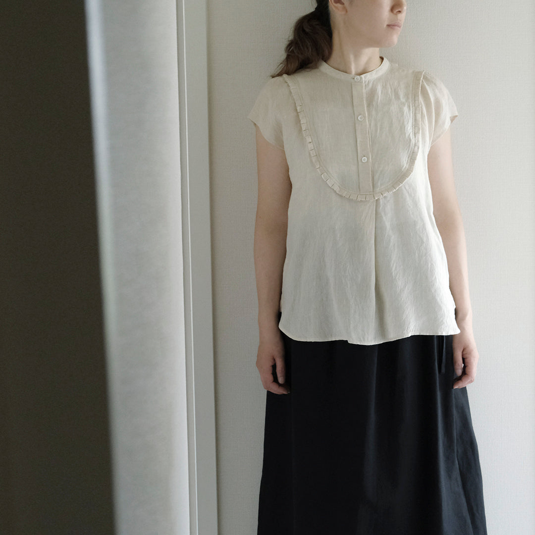 フレンチスリーブのブラウスは、オリジナルのリトアニアリネンを使ったフリルが印象的です。バンドカラーにボックスプリーツを合わせ、大人なかわいらしさを実現しました。