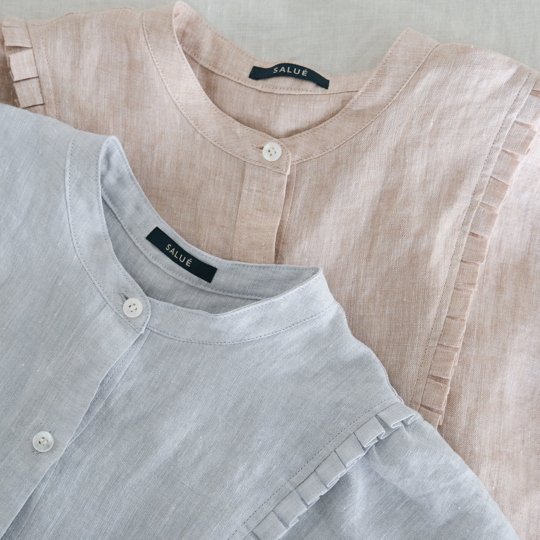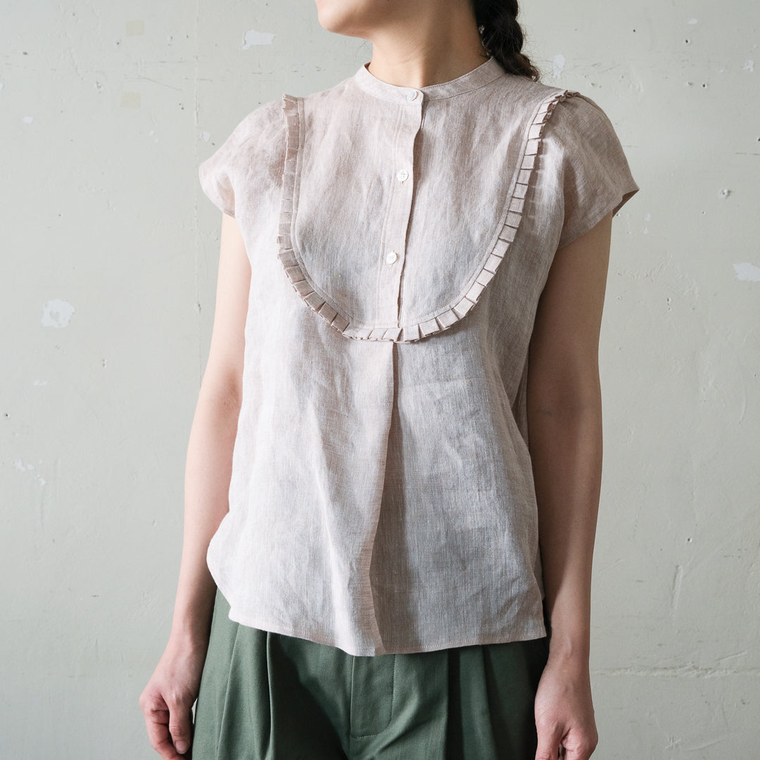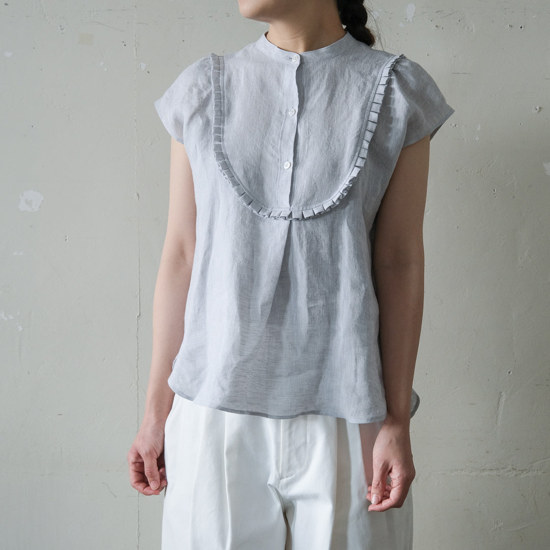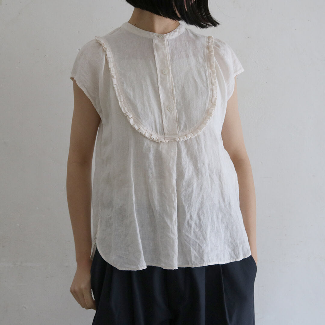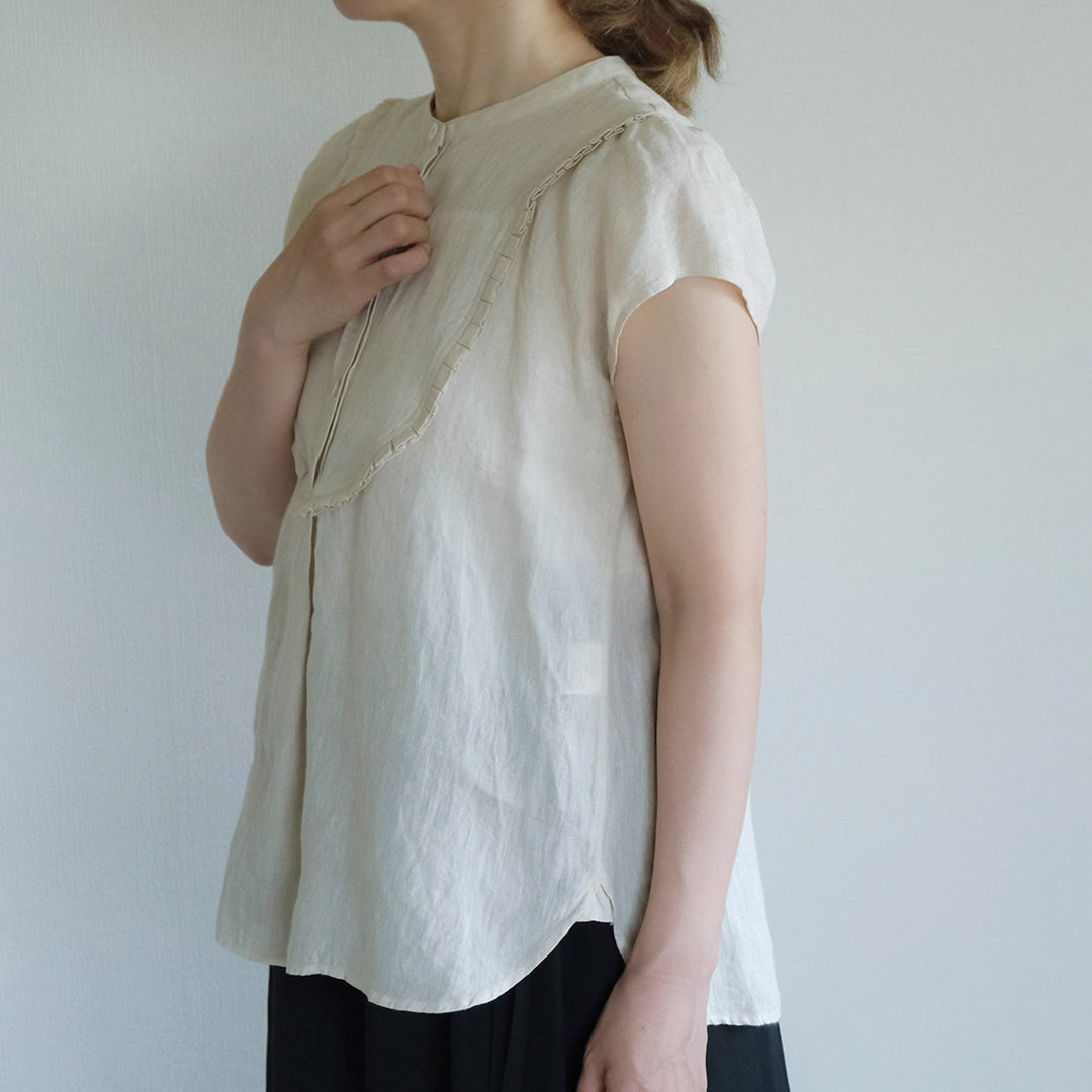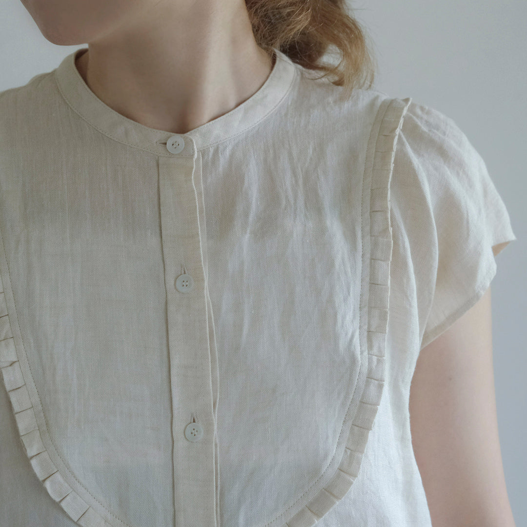 フレンチスリーブのブラウスは、オリジナルのリトアニアリネンを使ったフリルが印象的です。バンドカラーにボックスプリーツを合わせ、大人なかわいらしさを実現しました。