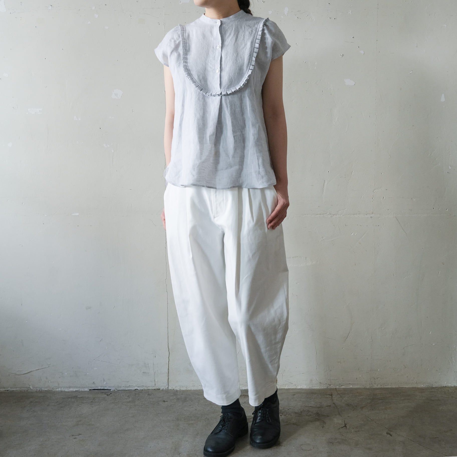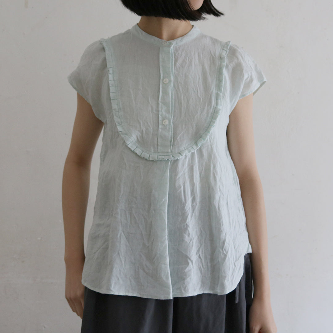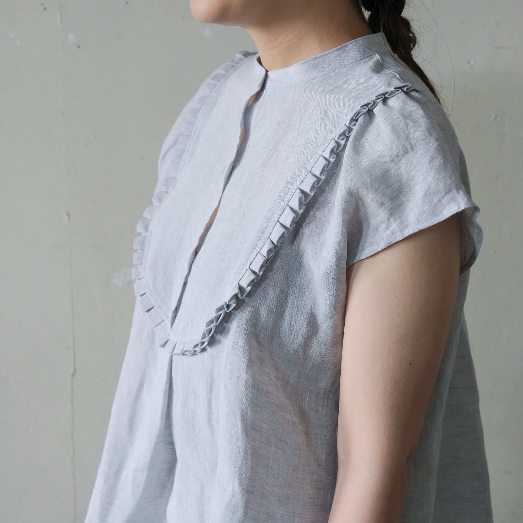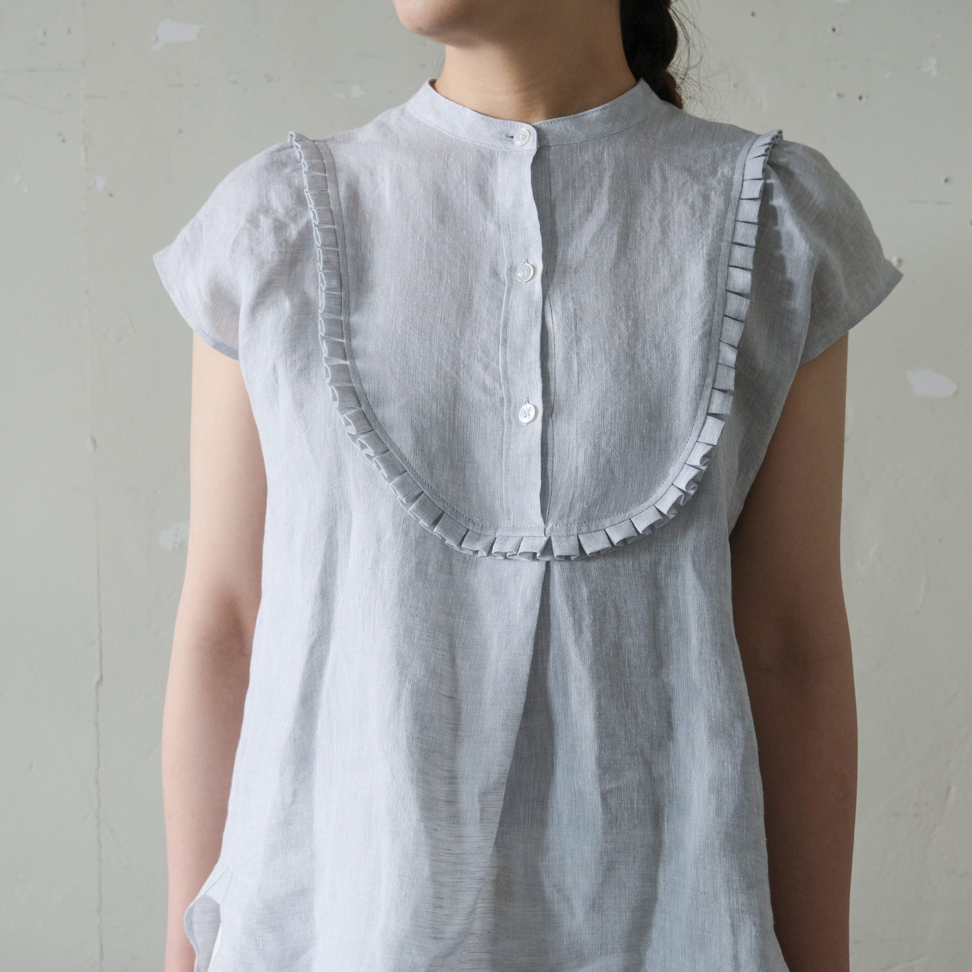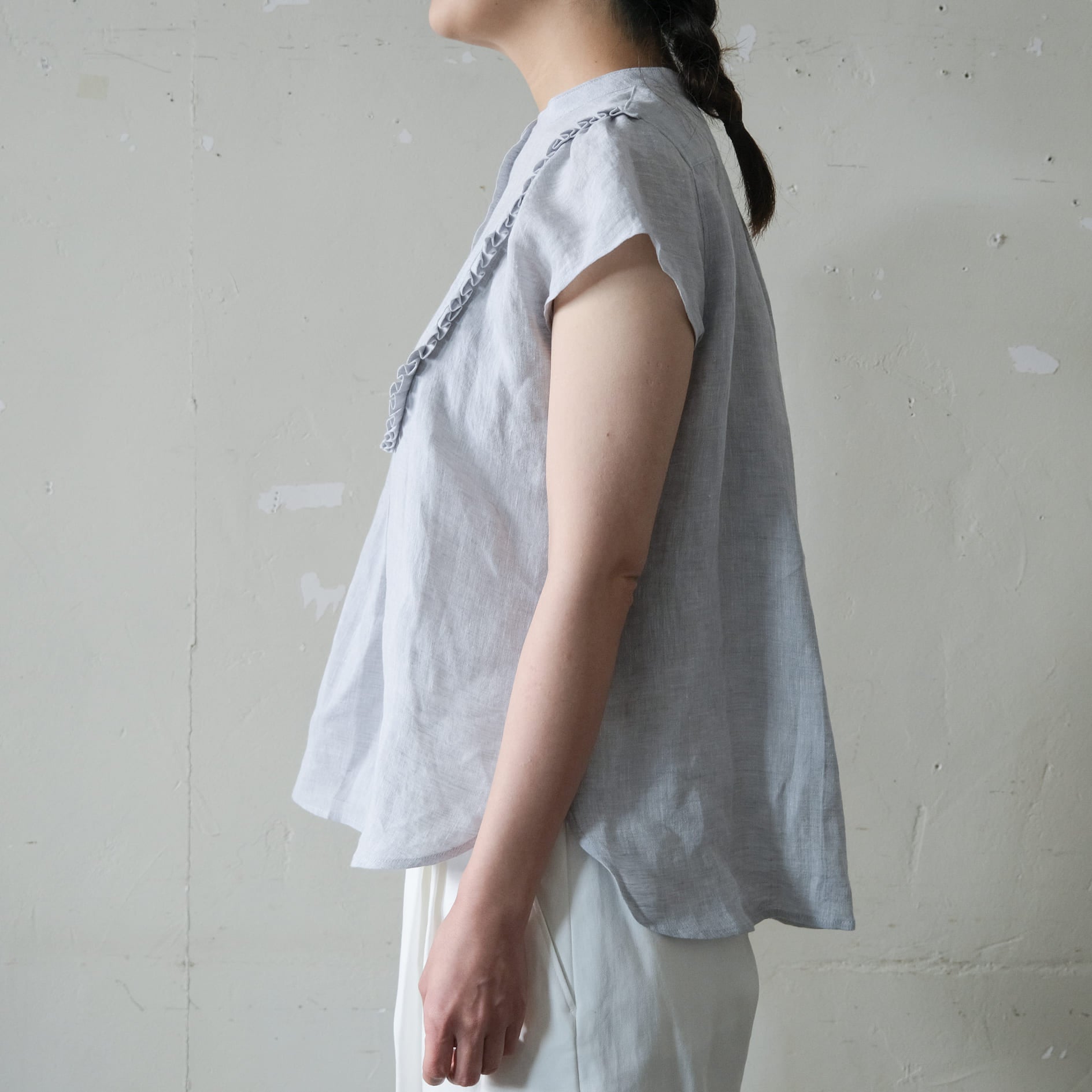 フレンチスリーブのブラウスは、オリジナルのリトアニアリネンを使ったフリルが印象的です。バンドカラーにボックスプリーツを合わせ、大人なかわいらしさを実現しました。