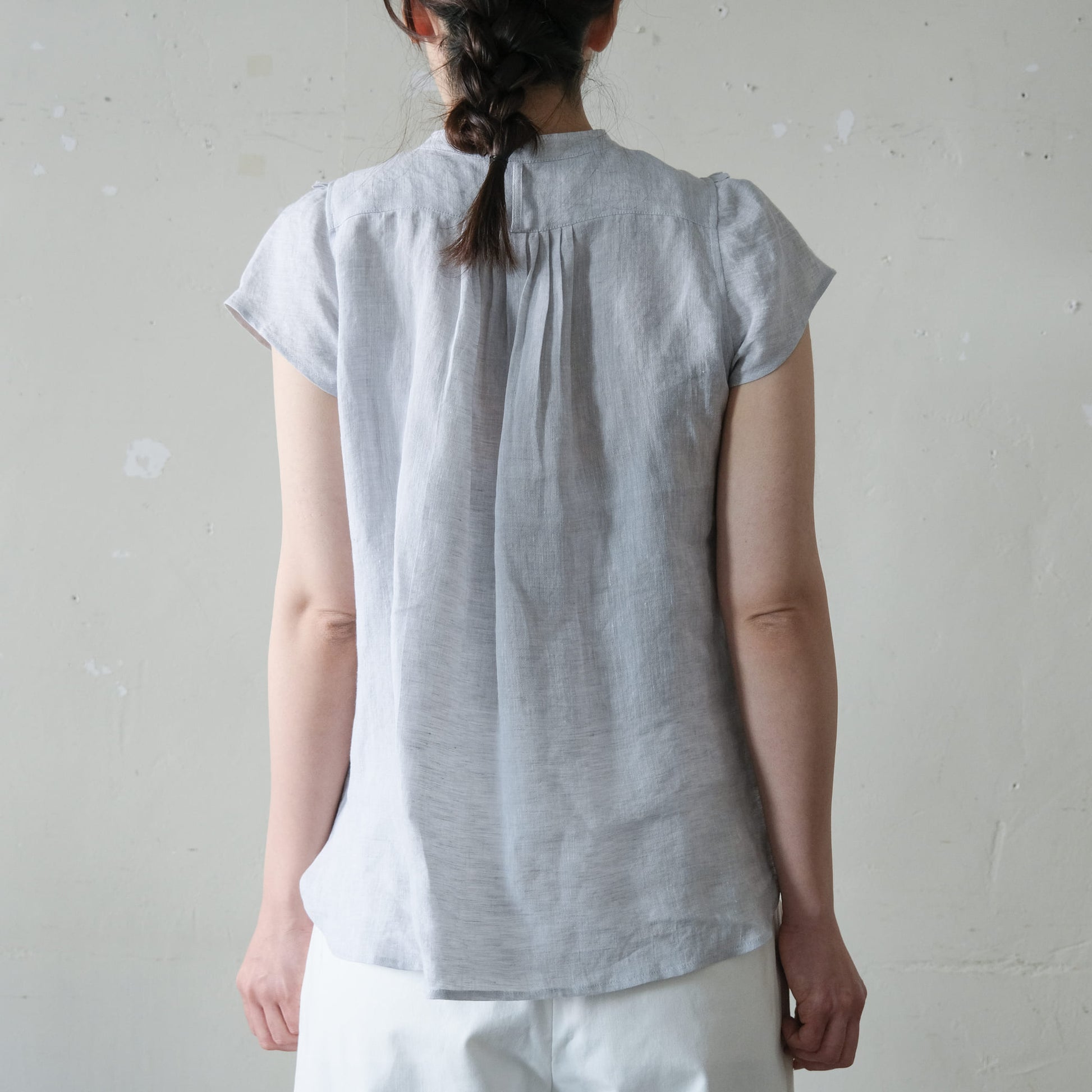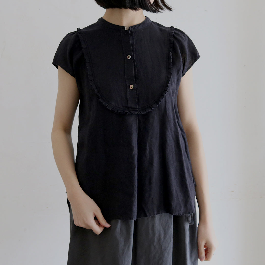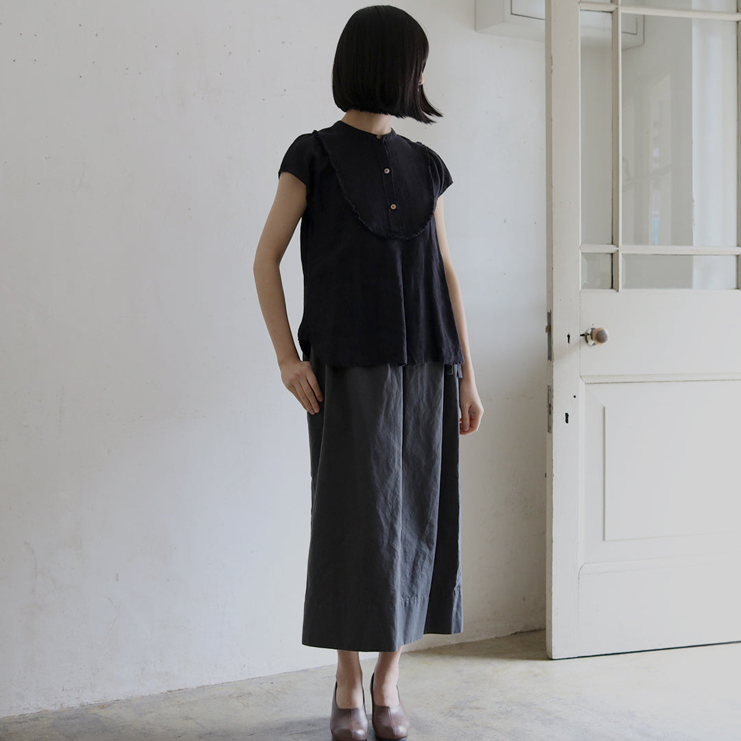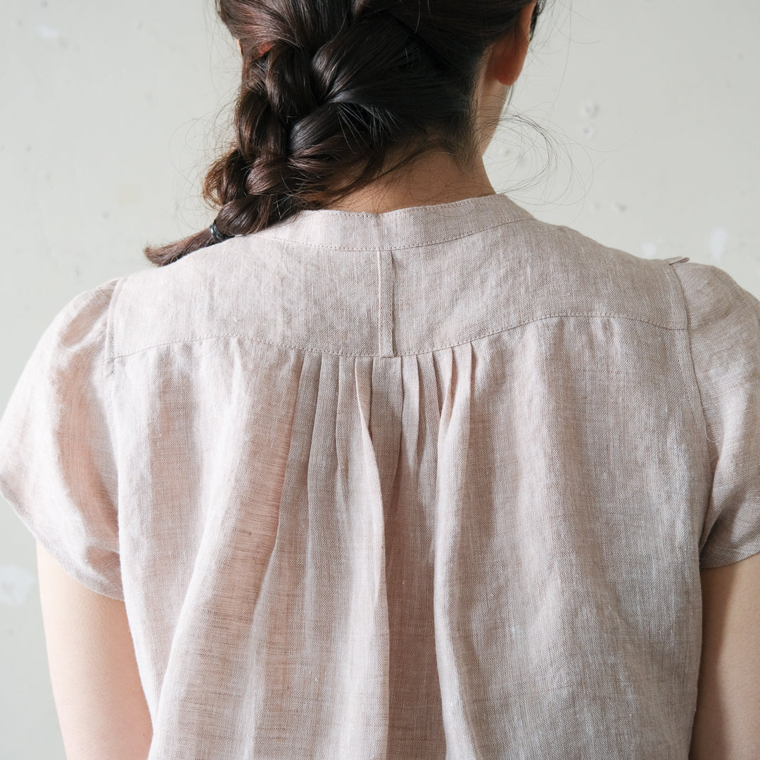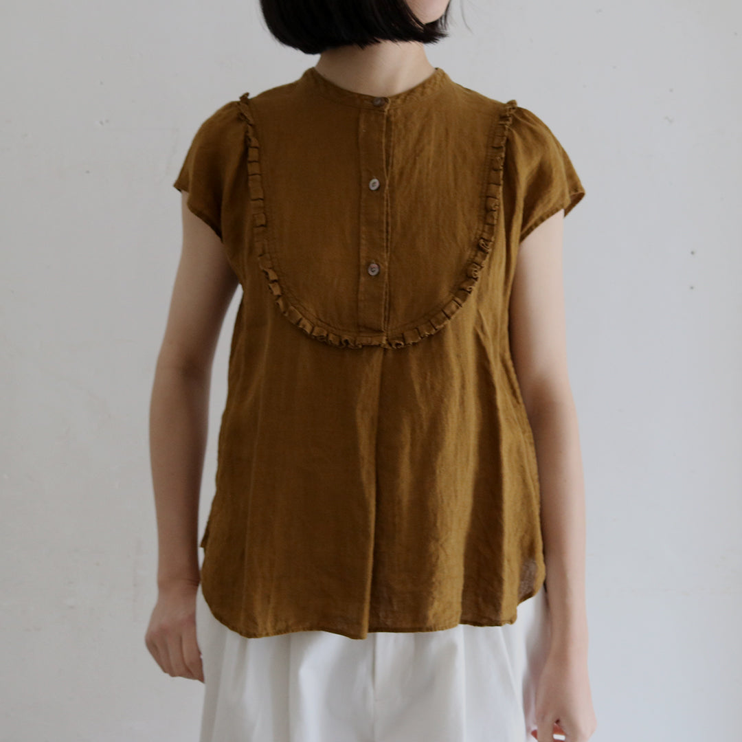 フレンチスリーブのブラウスは、オリジナルのリトアニアリネンを使ったフリルが印象的です。バンドカラーにボックスプリーツを合わせ、大人なかわいらしさを実現しました。