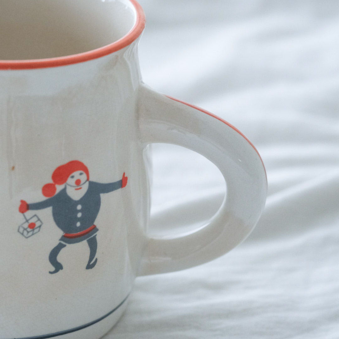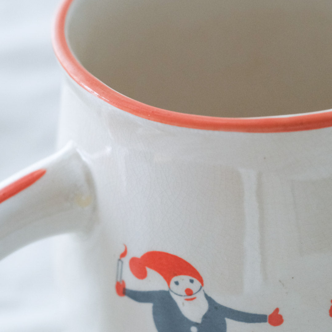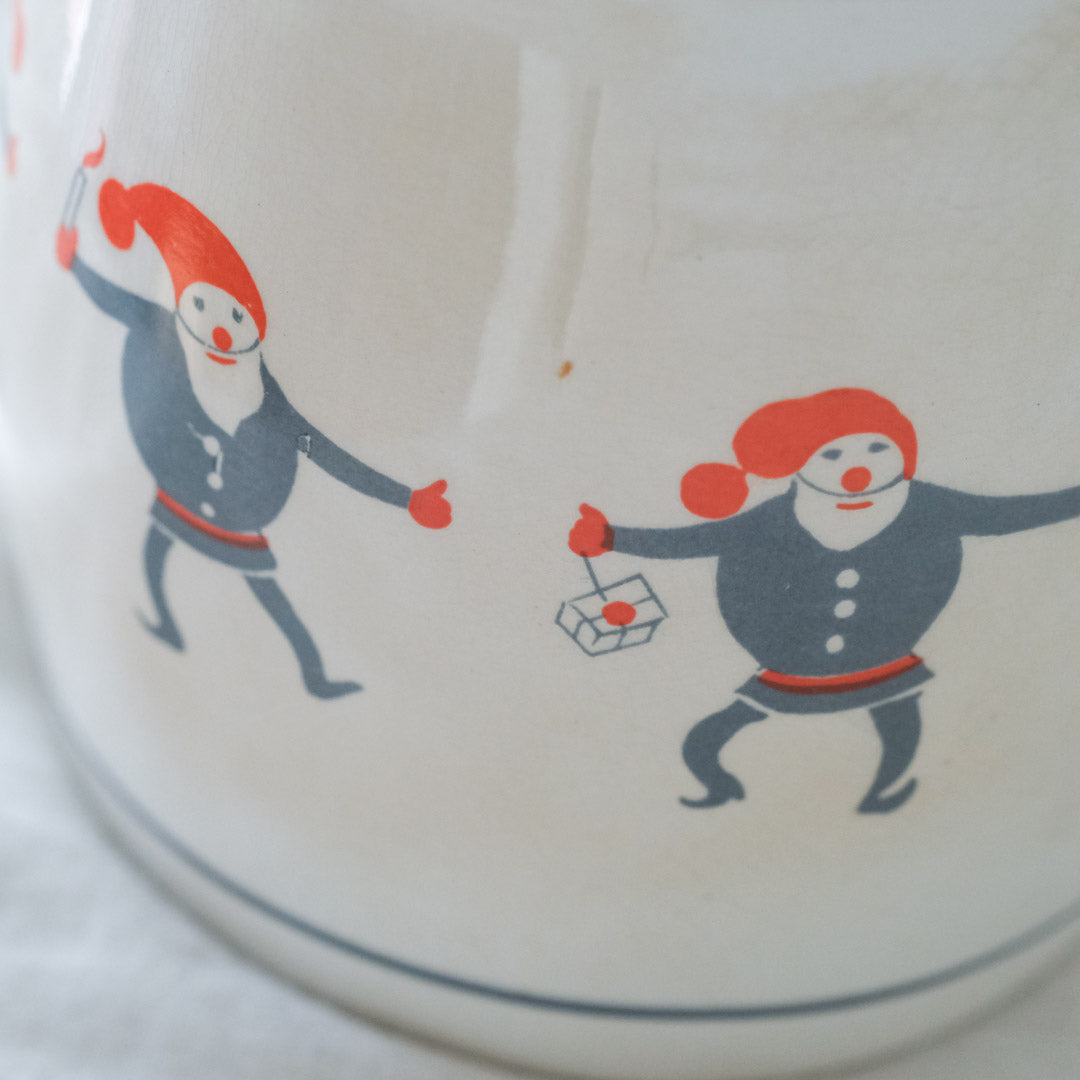 スウェーデンの陶磁器メーカーのゲフレ ウプサラエクビー。1960年代のクリスマスジョッキです。「hej tomtegubbar(こんにちはサンタさん)」と題されたシリーズで、描かれたサンタの愉快な様子に、当時の食卓の笑顔が思い浮かびます。