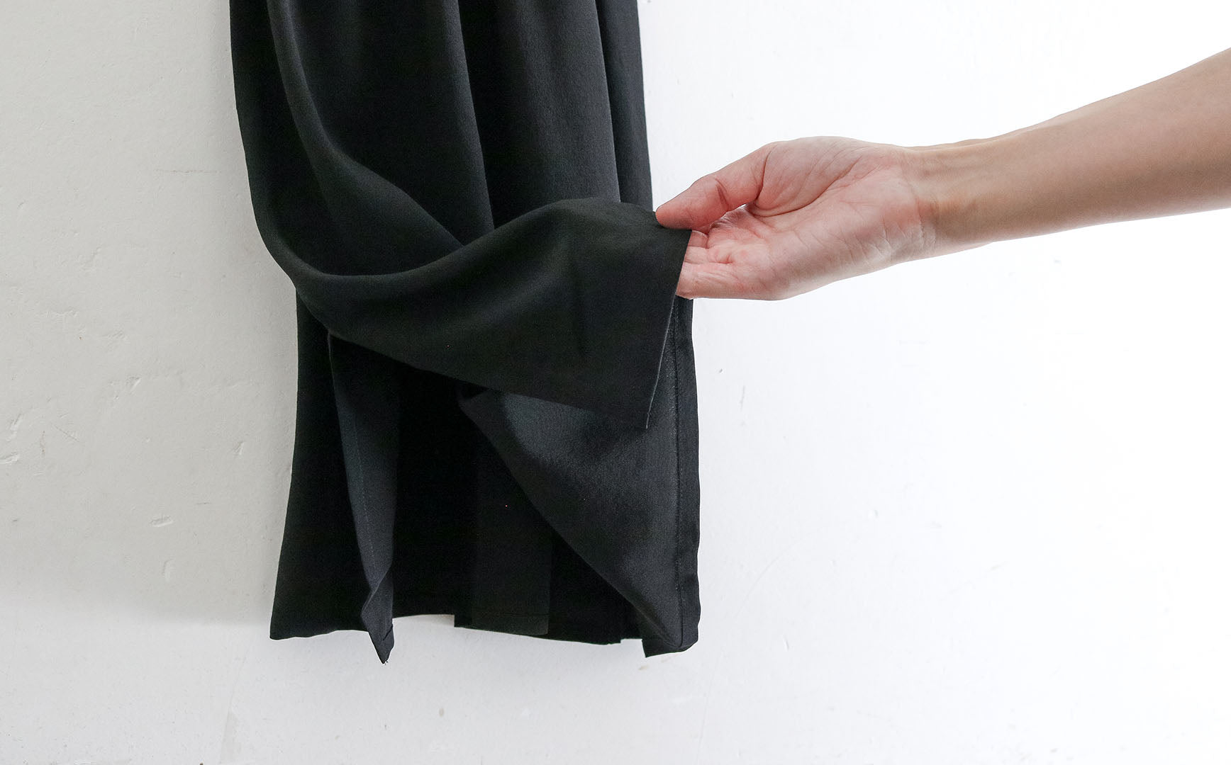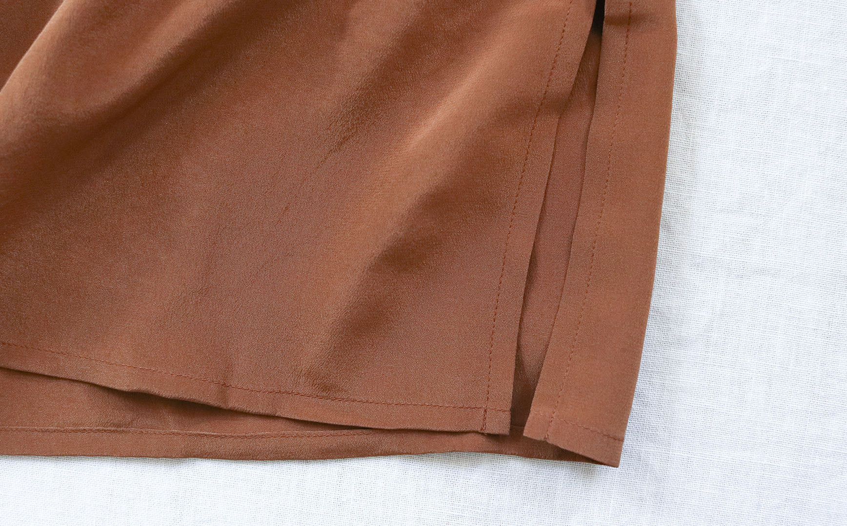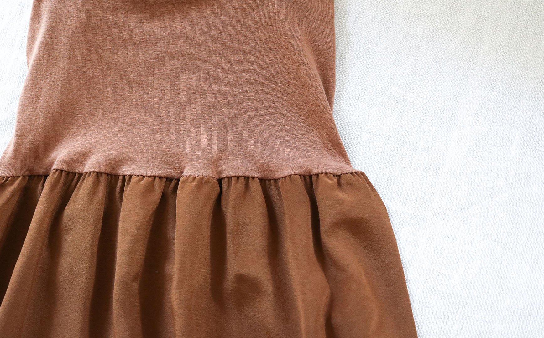 スカート部分のシルクは控えめな光沢のあるさらりとした生地感。脇にはスリットが入っています。フィットアンドフレアの女性らしいシルエットでありながら、スカート部分のギャザーは控えめ。ストレートシルエットのワンピースのインナーとしてももたつくことなく着ていただけます。