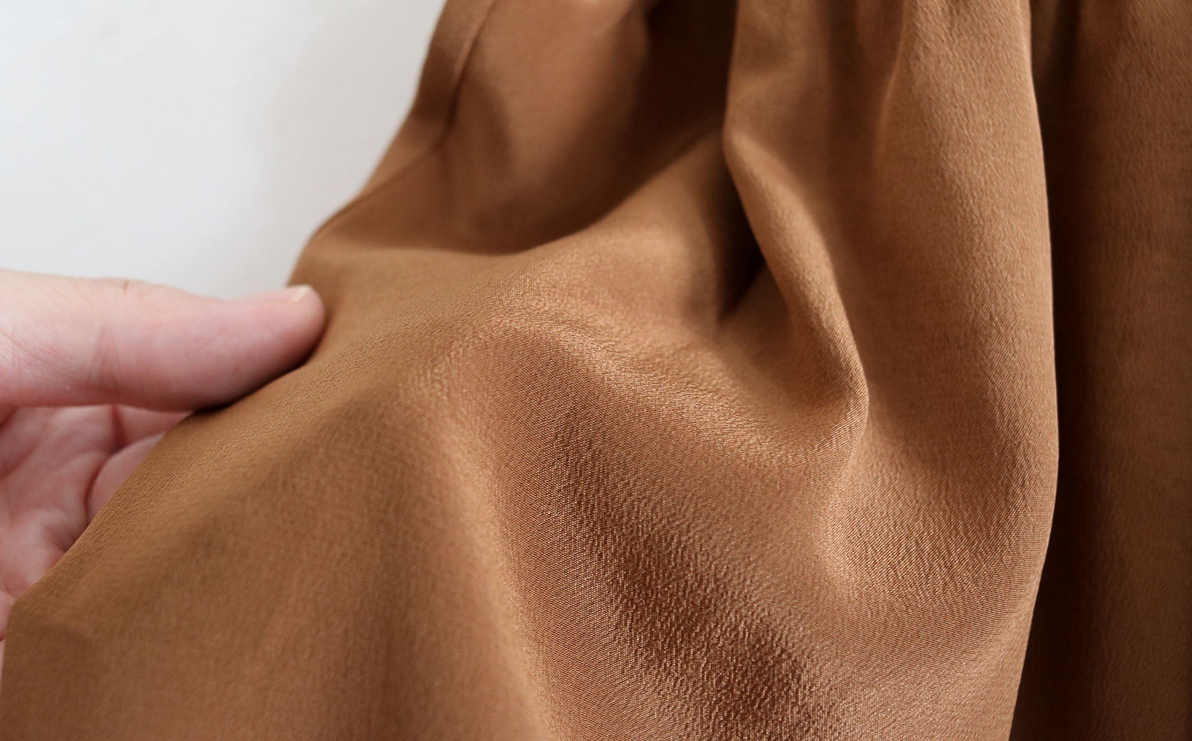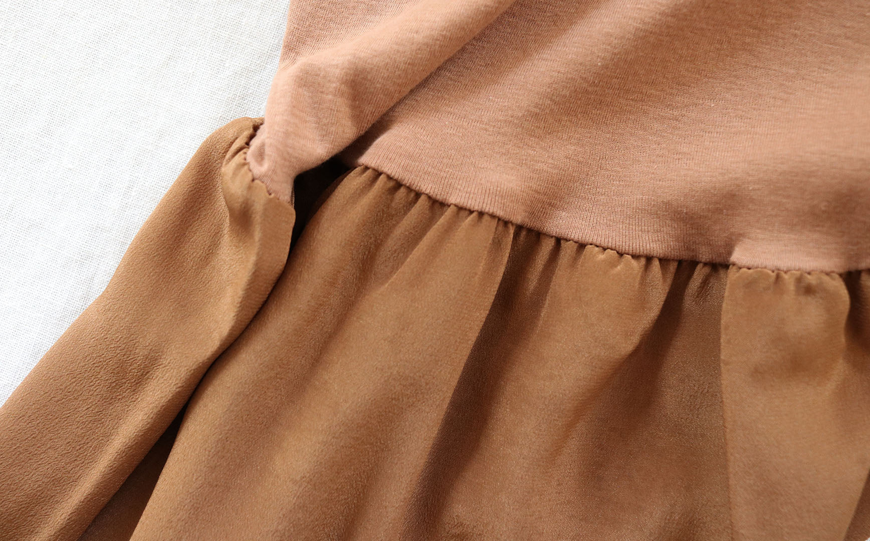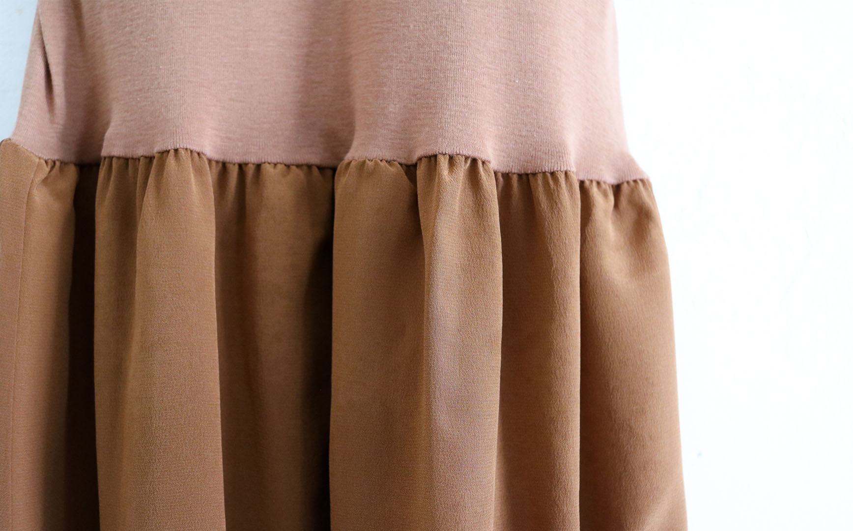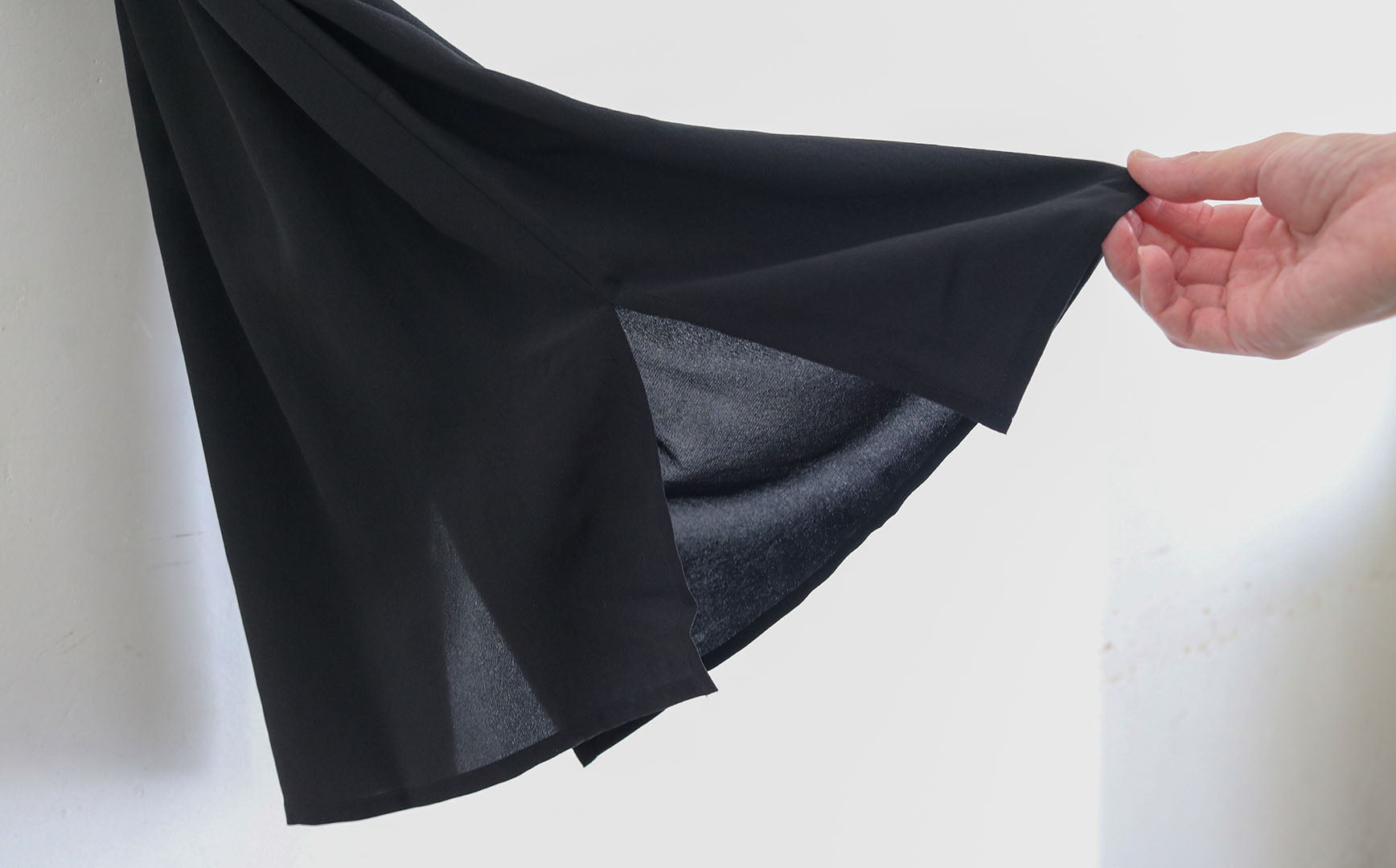 スカート部分のシルクは控えめな光沢のあるさらりとした生地感。脇にはスリットが入っています。フィットアンドフレアの女性らしいシルエットでありながら、スカート部分のギャザーは控えめ。ストレートシルエットのワンピースのインナーとしてももたつくことなく着ていただけます。