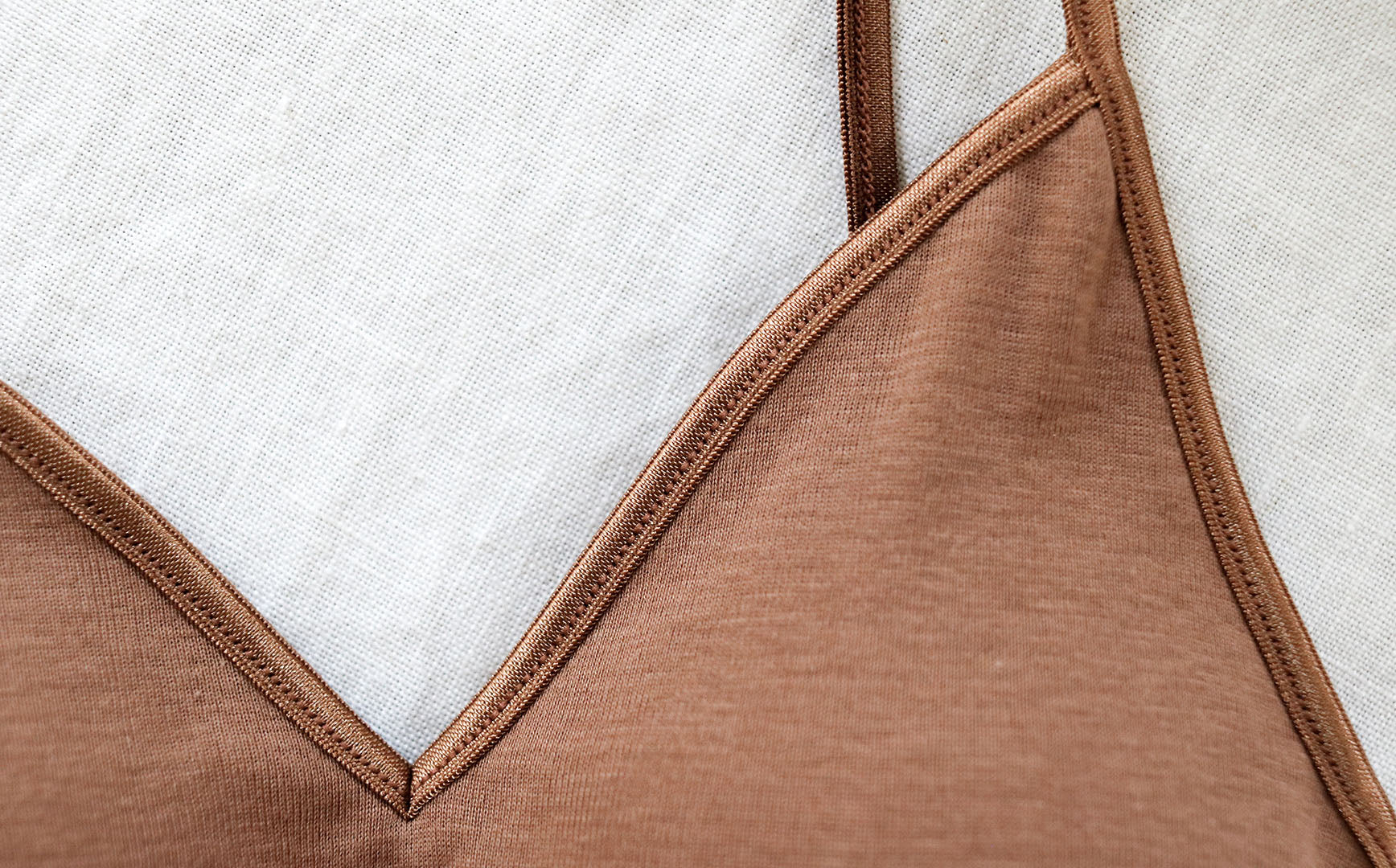 ブラパッドキャミソール部分には、通常の綿より繊維が長い最高級のスーピマコットンを、さらに無農薬有機栽培のものを使ってるから、コットンだけど手触りはとてもなめらか。