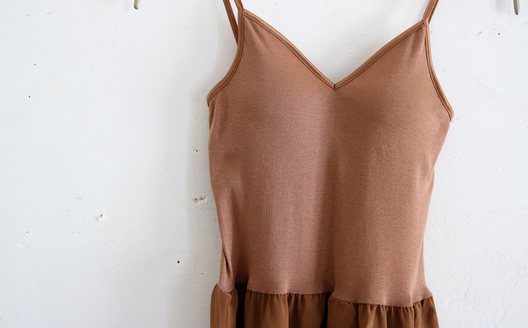 Souple Luzのアイテムの特徴は、なんといっても一度身につけたら手放せなくなるほどの素材の心地よさ。生地はなめらかで、ふわりと空気を含む柔らかさがあります。このキャミソールアンダードレスは、オーガニックスーピマコットンでつくられたブラパッドキャミソールに、シルクのアンダースカートをつけさらに抜群の着心地が実現しています。