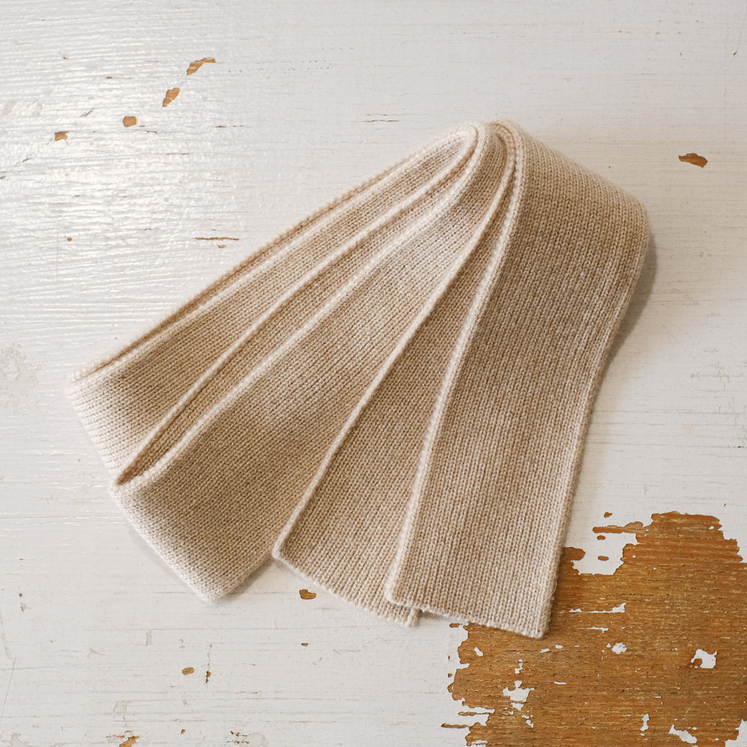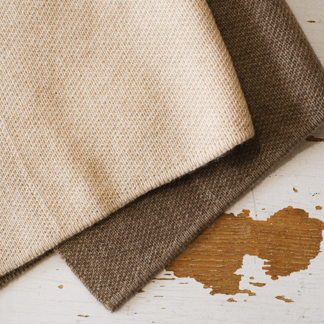 色はカシミヤの原毛のまま(ロウカシミヤ)のベージュとブラウン。わたの状態で染める(トップダイ)のチャコールの3色。(※ベージュは2025年は入荷なしです)