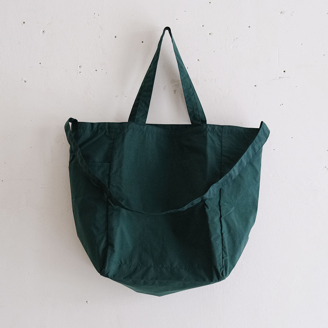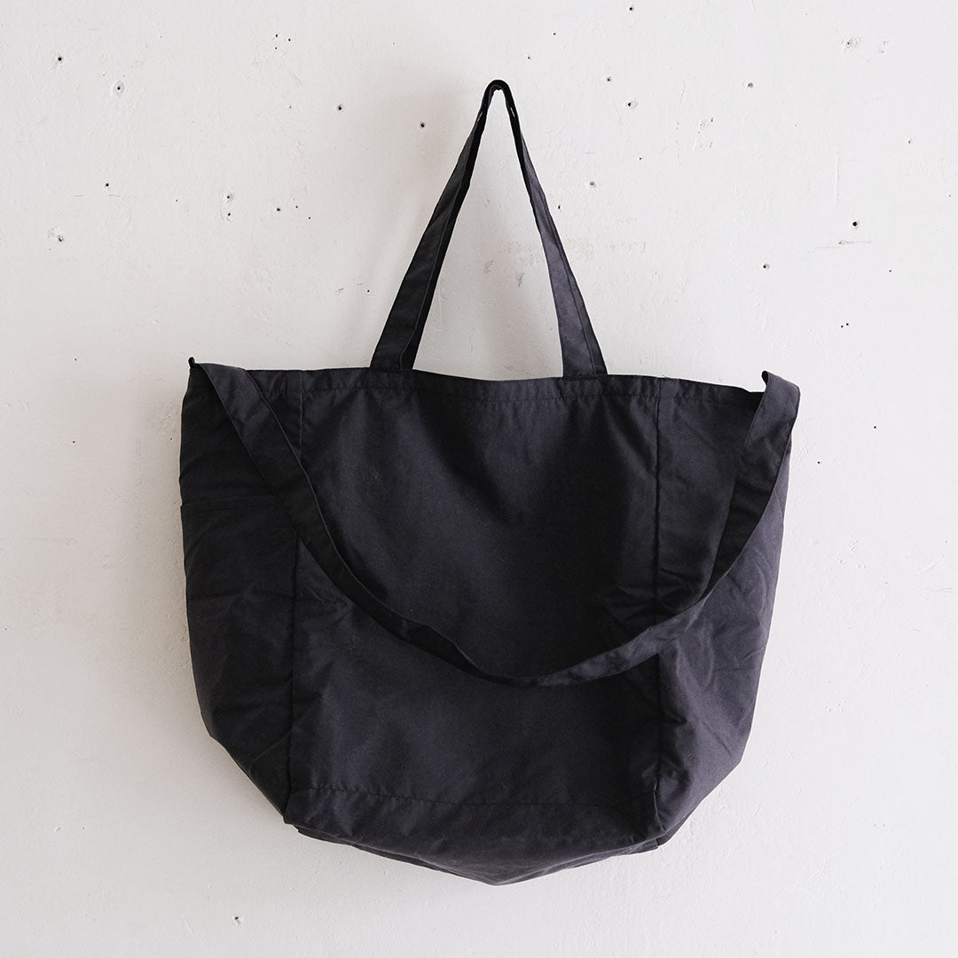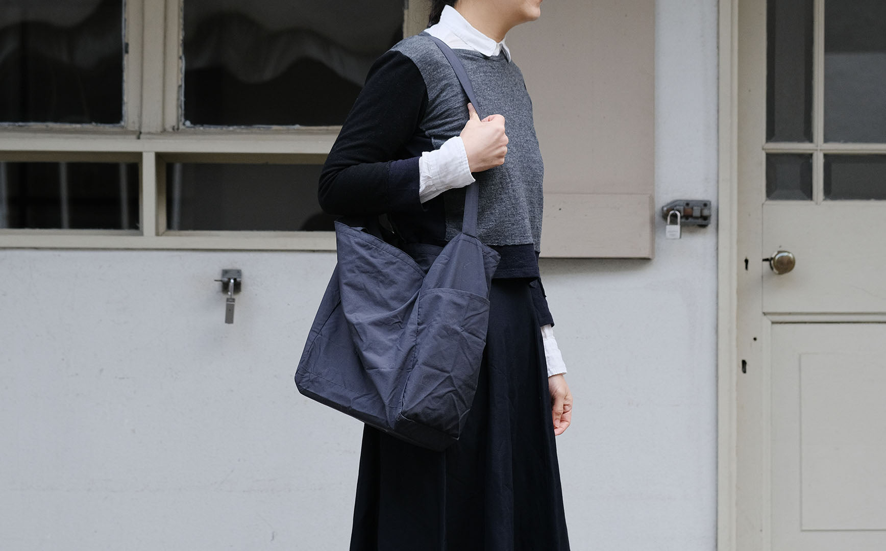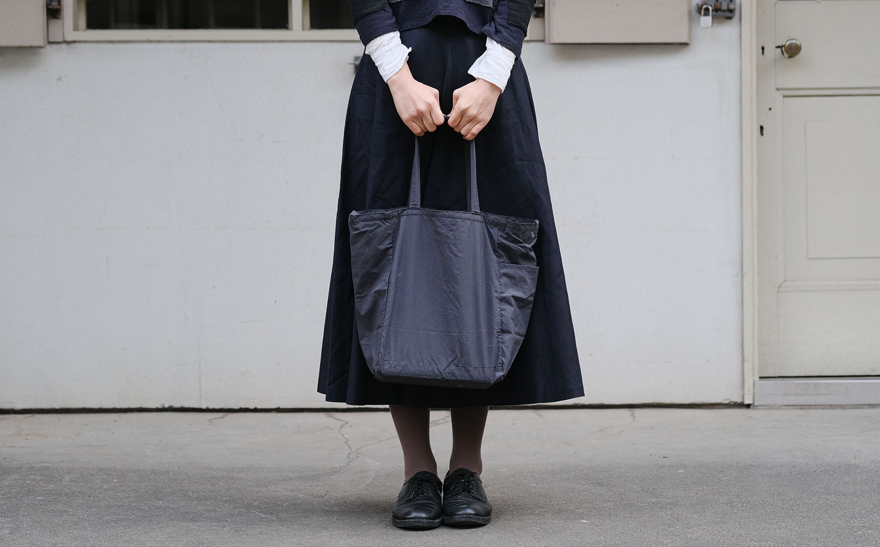 光沢を抑えたナイロン生地のトート。カジュアル過ぎない生地は、日常の装いに自然となじみます。そして驚くのは、見た目は大きく感じさせないのに、泊りがけの日にも使える収納力があること。