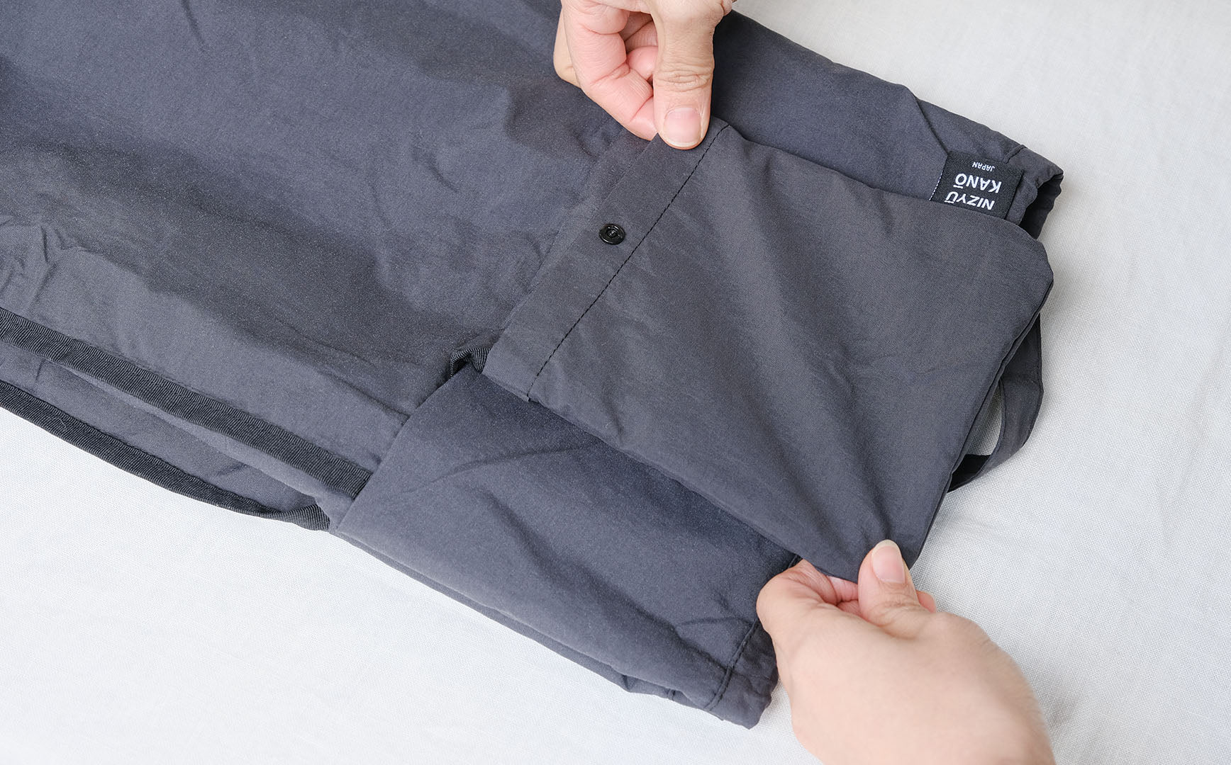 2.左右を内側に折り、生地を押さえたまま、三等分ぐらいに畳んでポケットに入れ込みます。