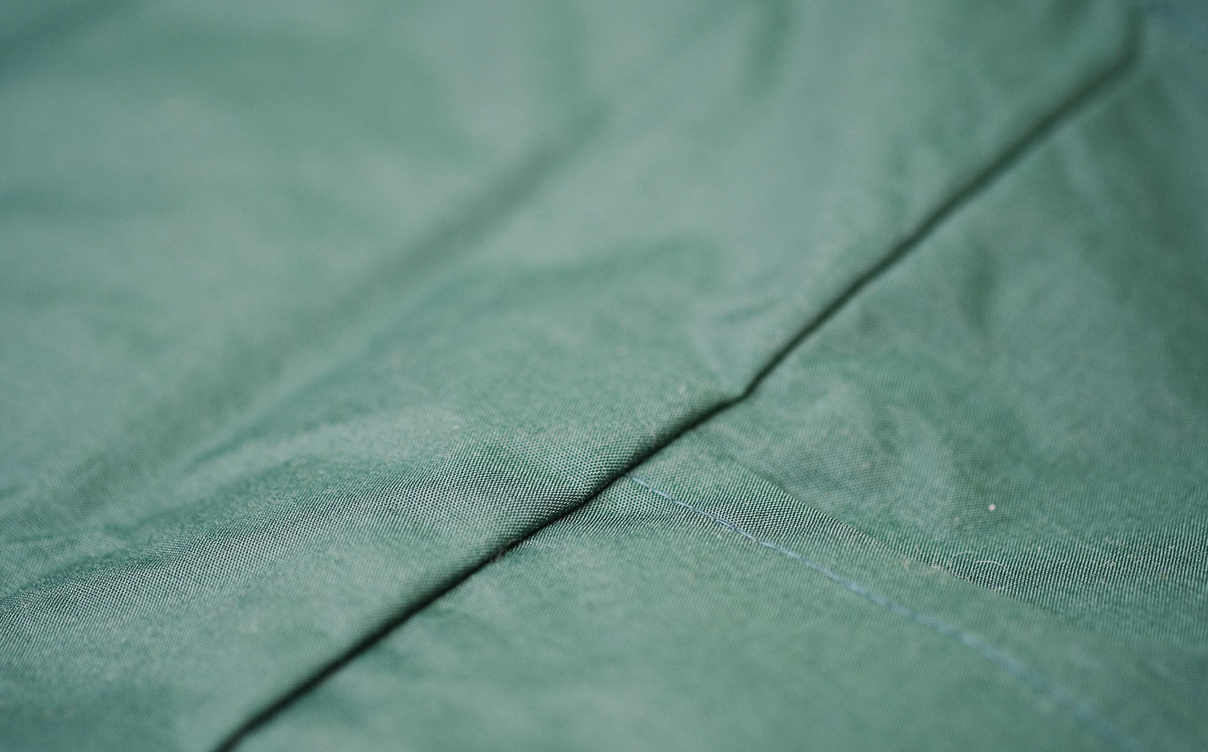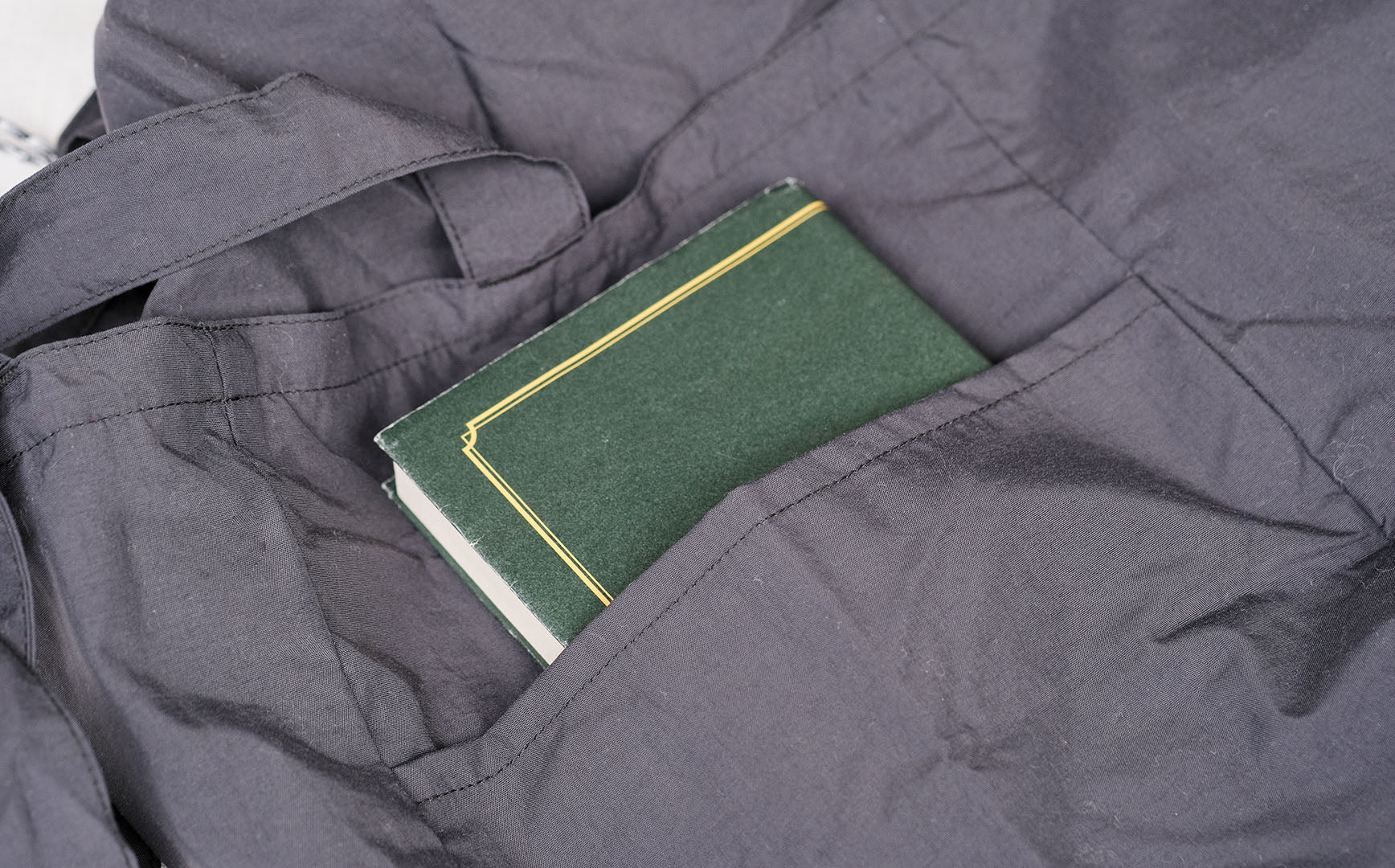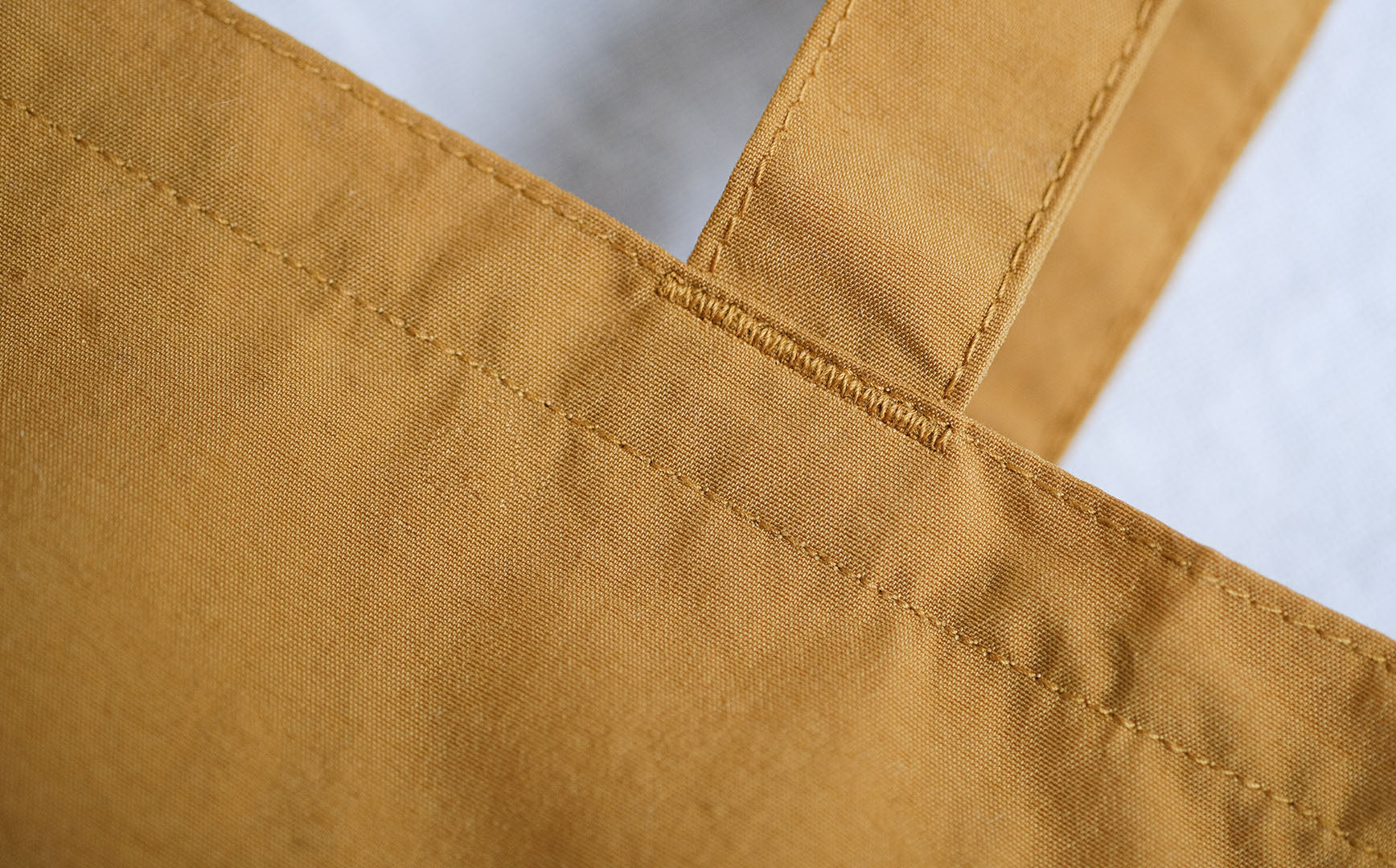 光沢を抑えたナイロン生地は石川県でつくられたものです。薄すぎず適度にハリがあり、生地を触るとシャカシャカと音が。撥水加工を施していて多少の雨なら弾いてくれます。