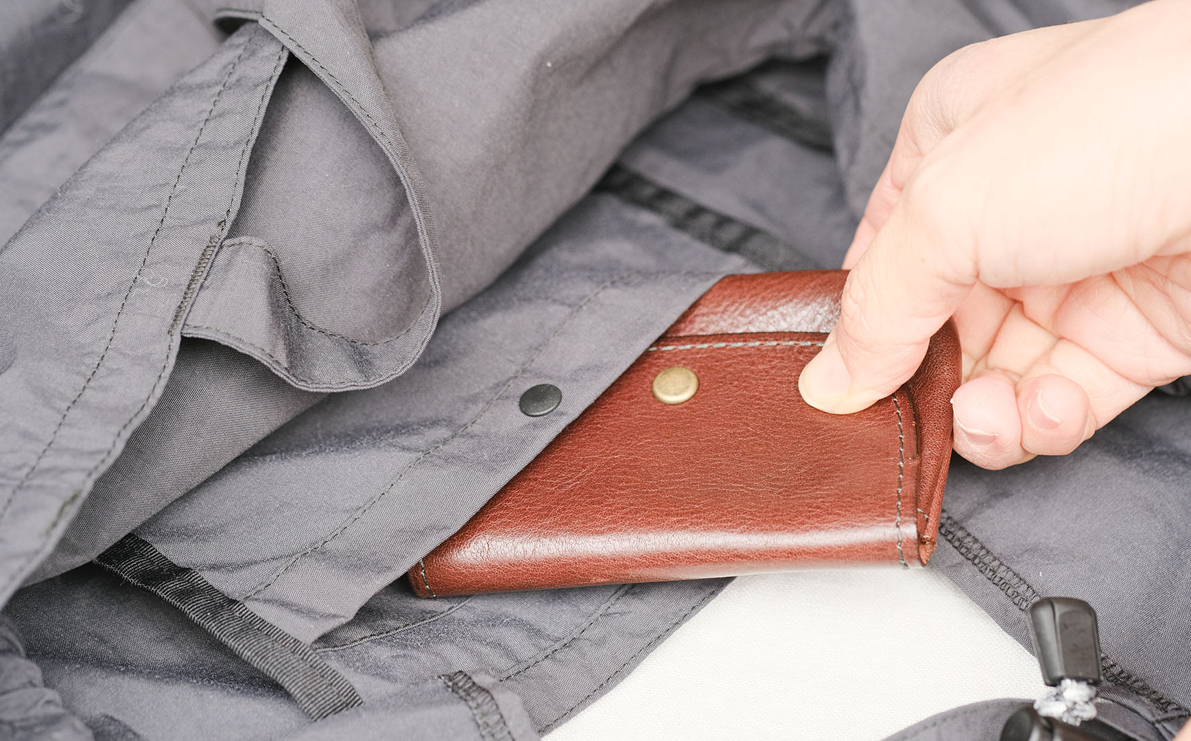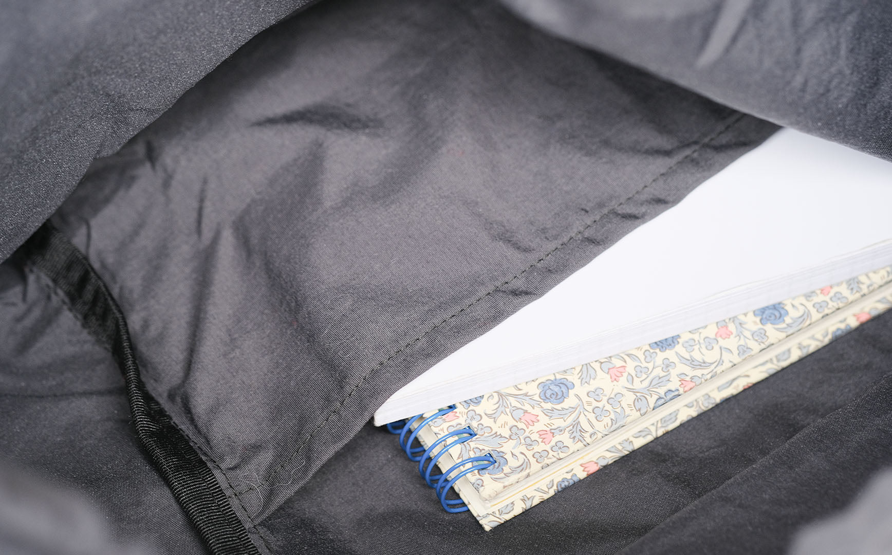「ポケッタブル 3way トート」は、ポケットに入れて小さく畳める特性から名前がつけられています。小さく折って畳んでポケットに入れてみました。くしゅくしゅと無造作に内側のポケットに押し込むだけでも収納可能です。