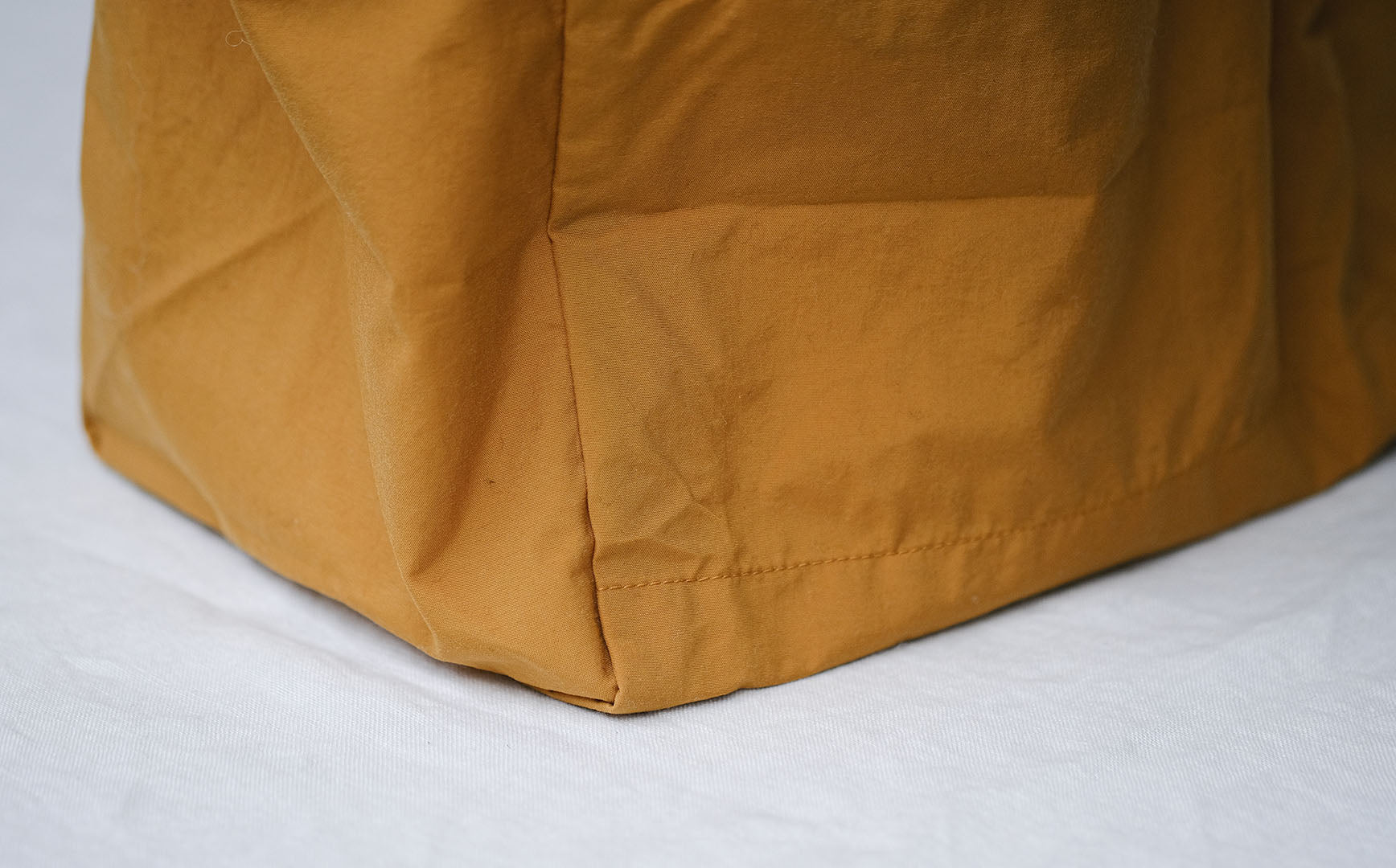 1.中身を取り出したらトートを裏返します。平面になるように生地を手で伸ばし、サイドのマチも畳みます。